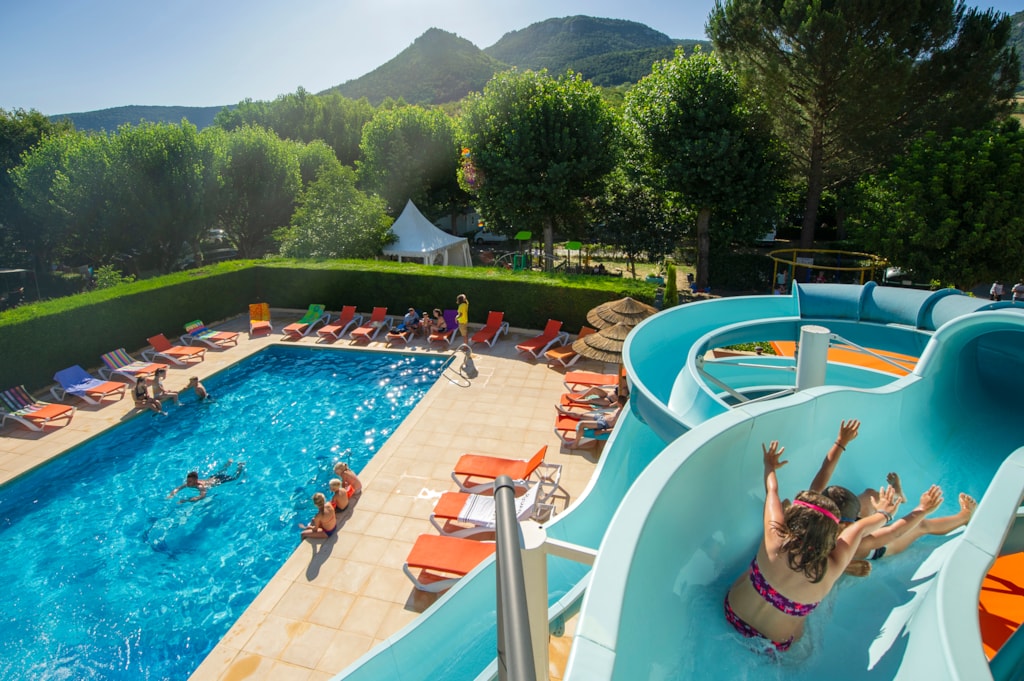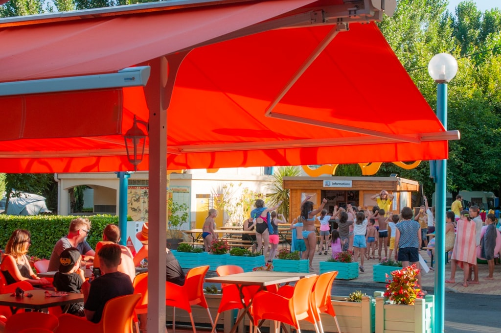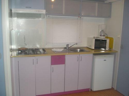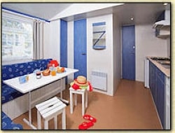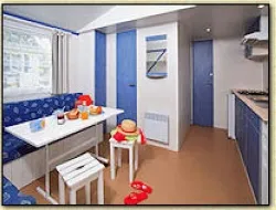 Ces mobil-homes climatisés sont composés 3 chambres dont une avec un grand lit en 140, une avec 2 petits lits en 90 et une avec 2 lits en 80 superposés (uniquement pour des enfants). La pièce centrale, avec un véritable petit salon comprenant une TV et un coin repas, est séparée de la cuisine, qui est équipée d’un frigo-congélateur et d'un lave vaisselle. Elle donne directement sur la terrasse. Une salle d’eau et un WC. La terrasse prolonge l’espace de vie, elle est recouverte d’une pergola.