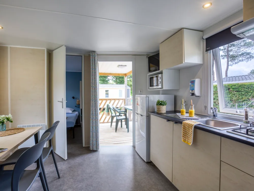 Mobilheim mit Terrasse, Standardausstattung, ideal für einen angenehmen Aufenthalt.