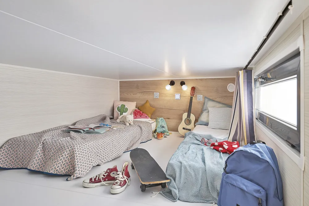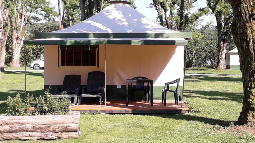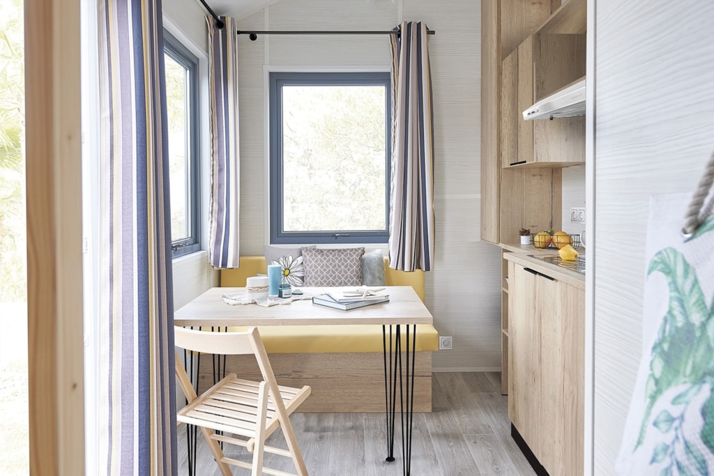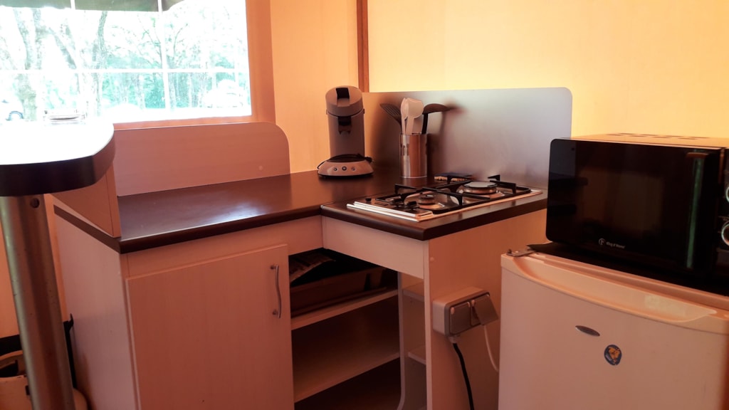 Tente sur pilotis Mooréa de chez Trigano, pour 1 à 2 personnes avec coin cuisine sous plancher.