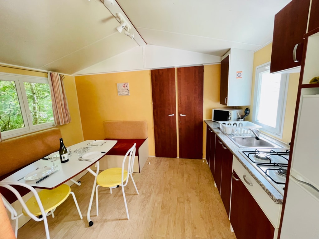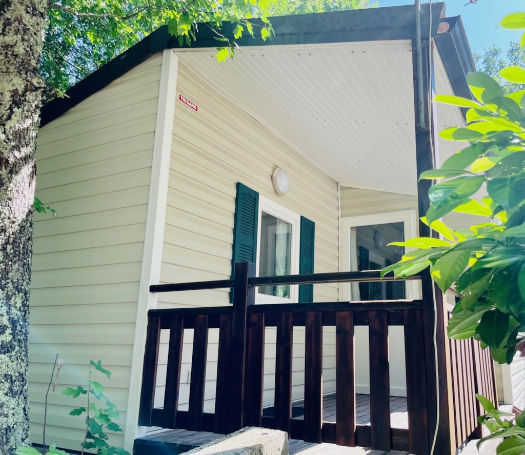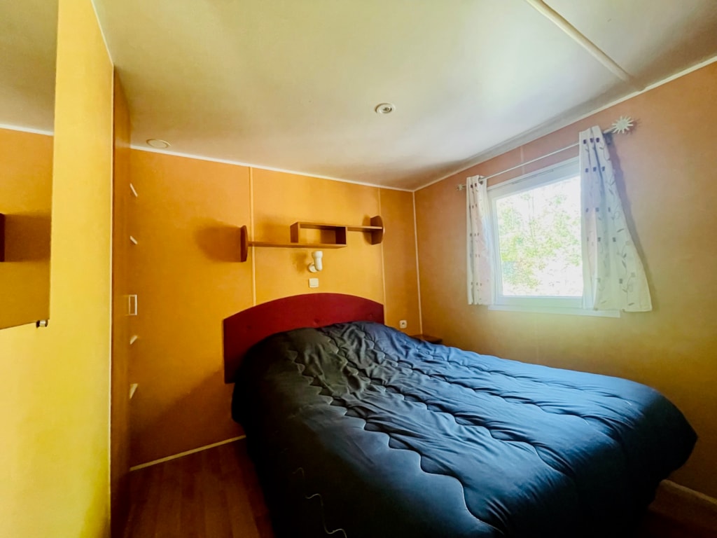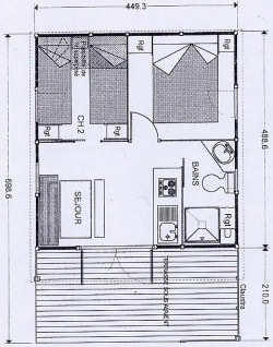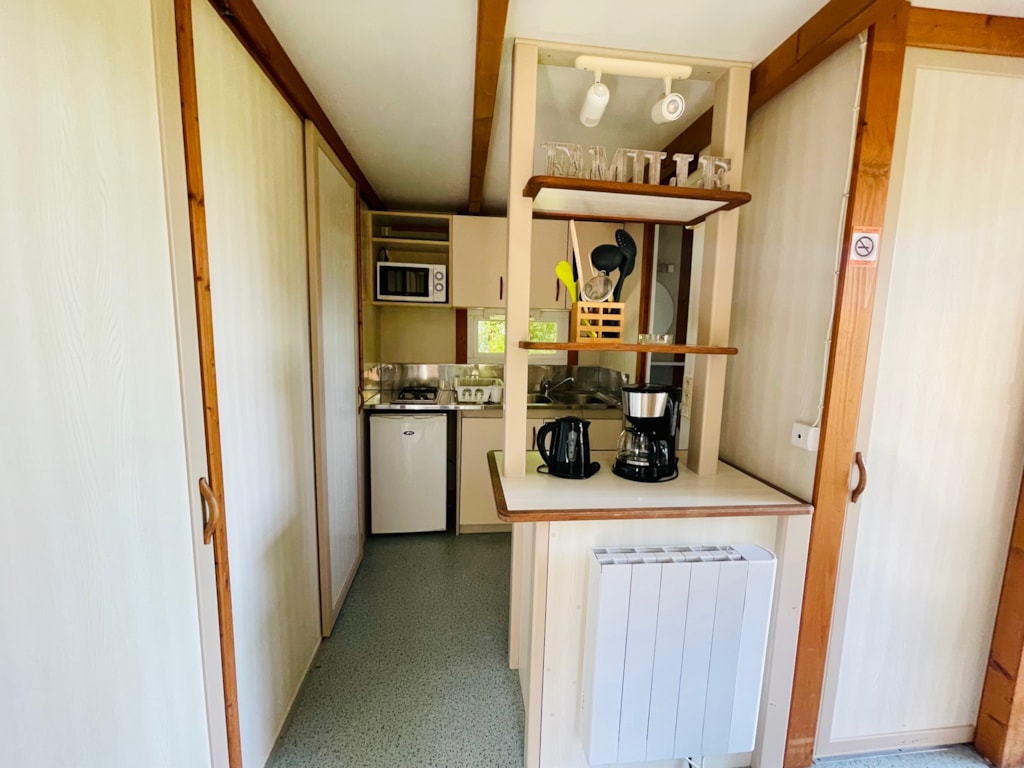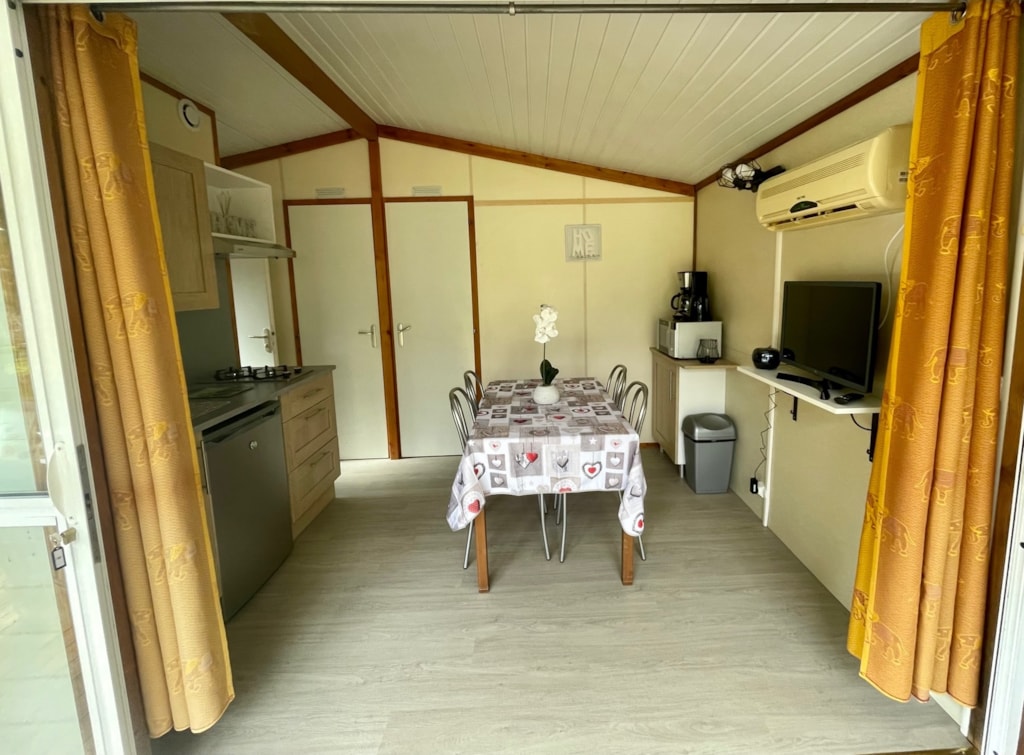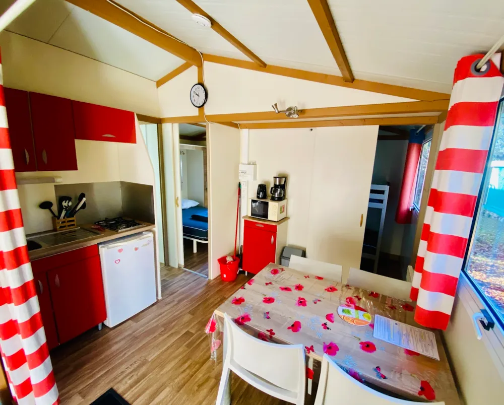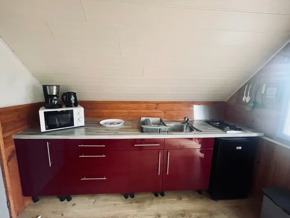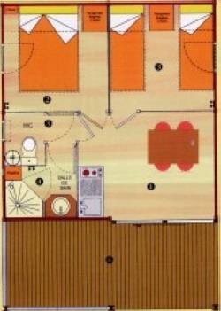 Chalet composé de : - 3 chambres (une chambre avec lit de 140x190 cm, une chambre avec lits superposés 80x190 et une chambre avec lits superposés 120x190 en bas et 90x190 en haut), - Une cuisine équipée d'un réfrigérateur/congélateur, d'une plaque de cuisson 4 feux gaz, d'un micro-ondes, d'une cafetière, d'une bouilloire, de vaisselle et d'ustensiles de cuisine, - Un coin séjour avec canapé et télévision, - Une salle d'eau avec lavabo et douche. - WC séparé. - Une terrasse en bois de 15 m² couverte avec salon de jardin.