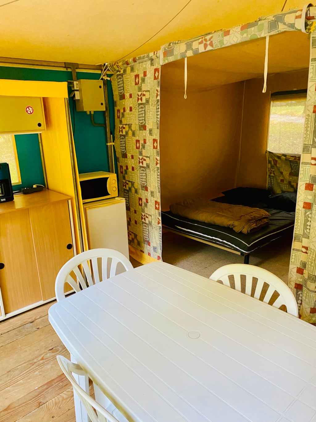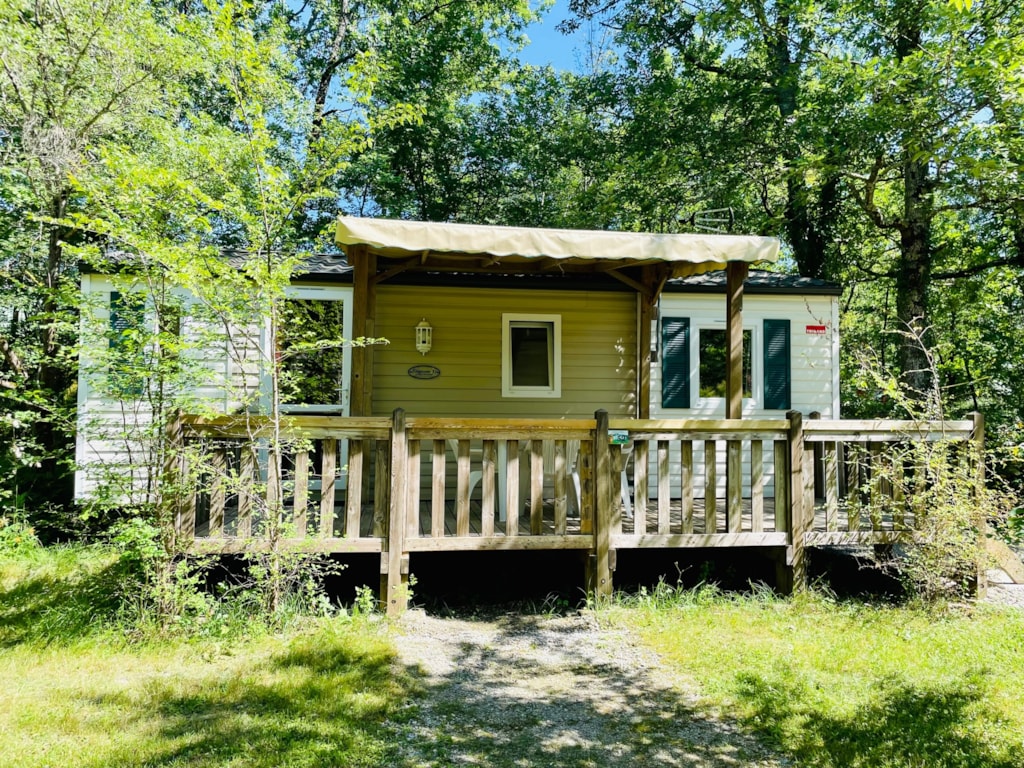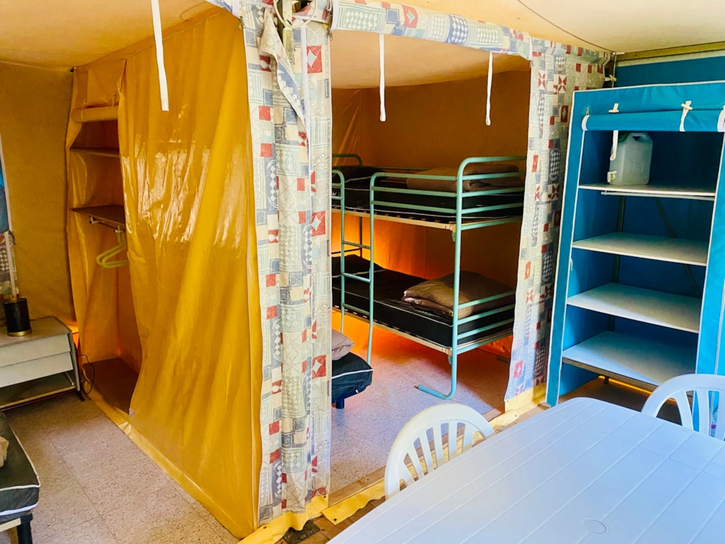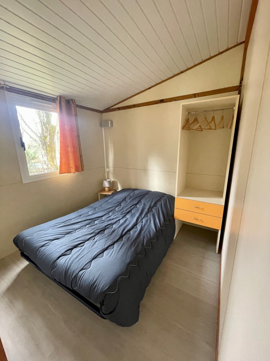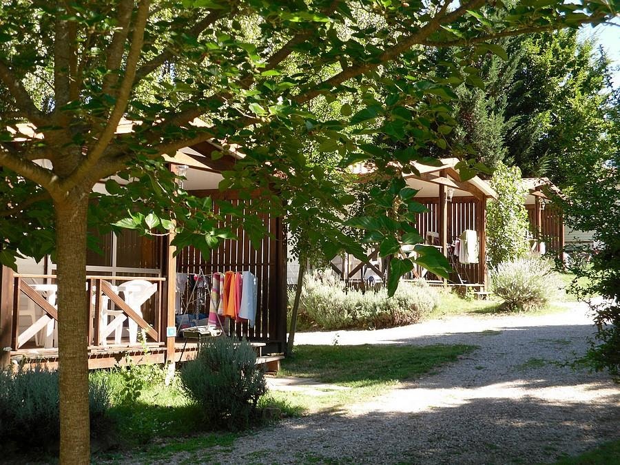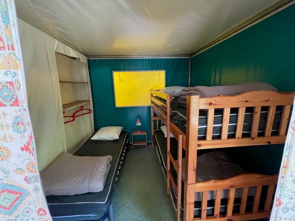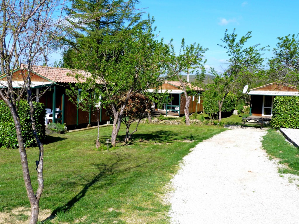 Chalet composé de : - 3 chambres (une chambre avec lit de 140x190 cm, une chambre avec lits superposés 80x190 et une chambre avec lits superposés 120x190 en bas et 90x190 en haut), - Une cuisine équipée d'un réfrigérateur/congélateur, d'une plaque de cuisson 4 feux gaz, d'un micro-ondes, d'une cafetière, d'une bouilloire, de vaisselle et d'ustensiles de cuisine, - Un coin séjour avec canapé et télévision, - Une salle d'eau avec lavabo et douche. - WC séparé. - Une terrasse en bois de 15 m² couverte avec salon de jardin.