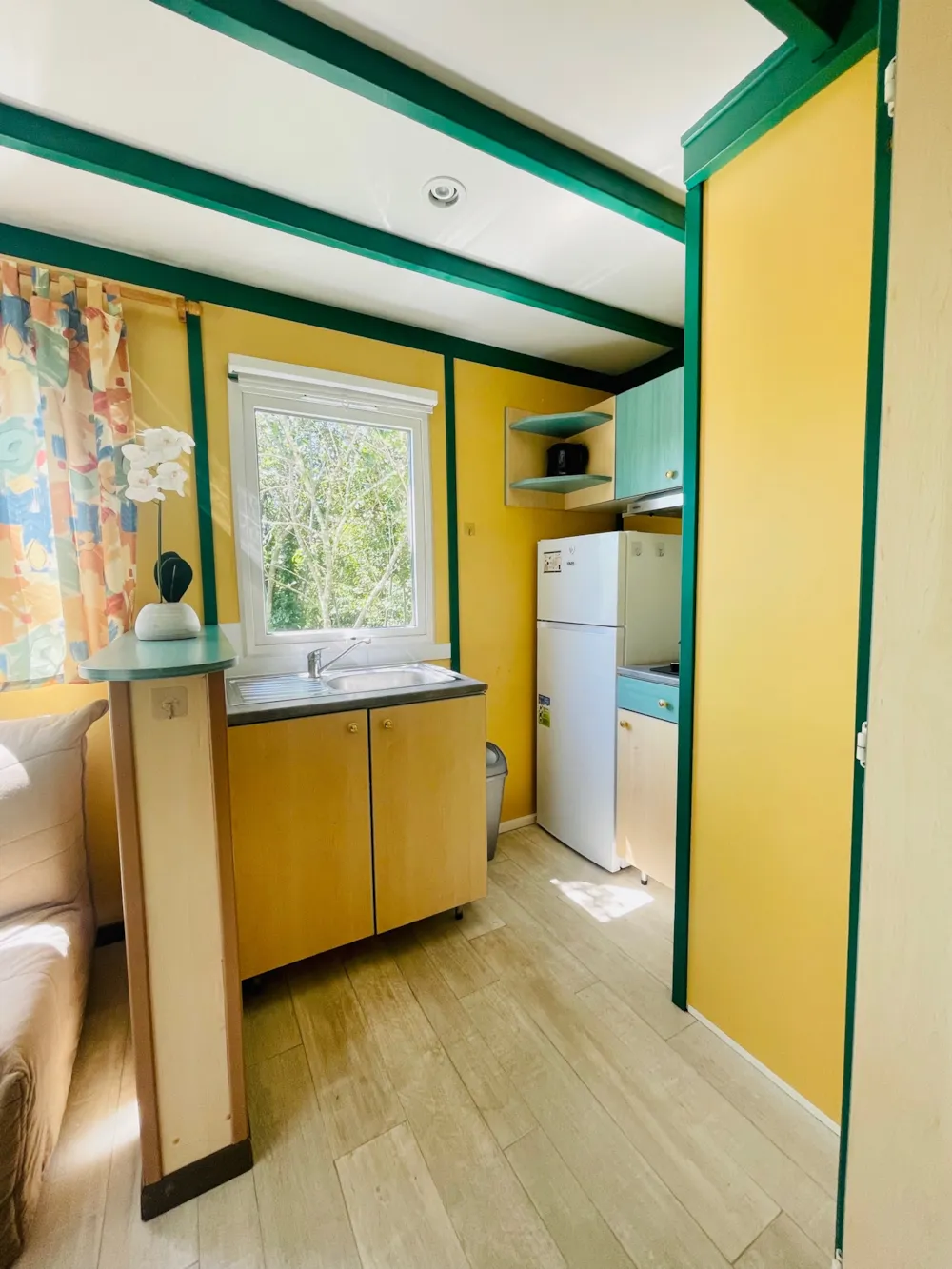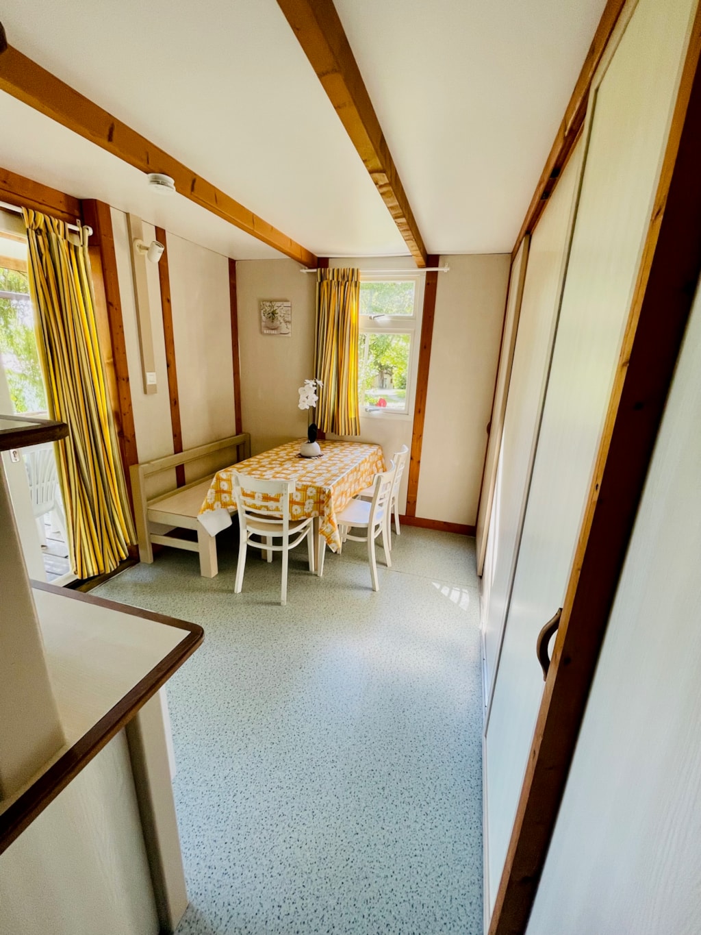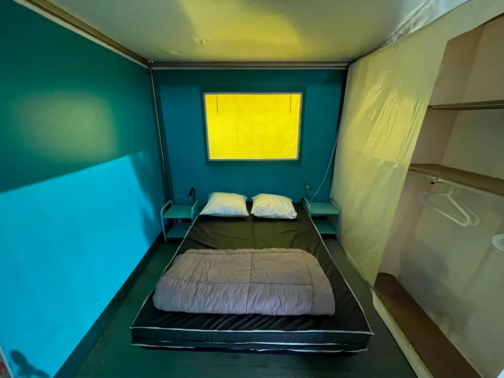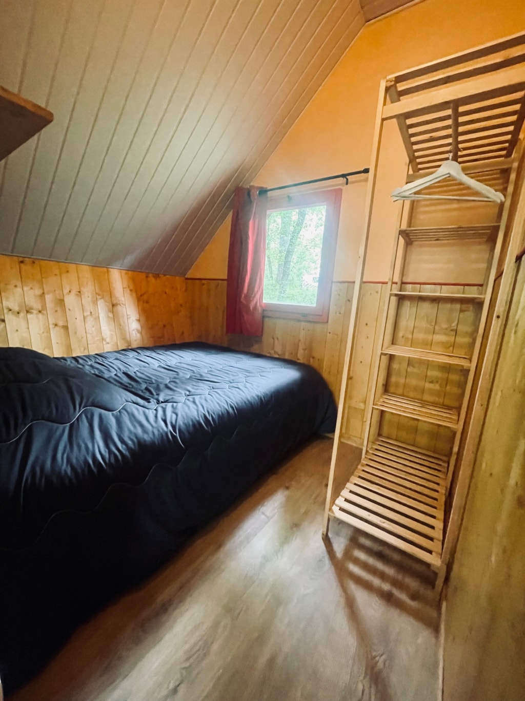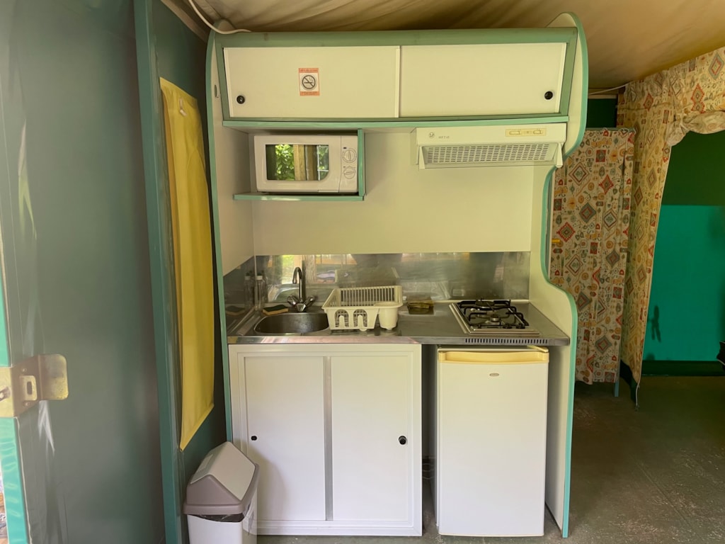Chalet composé de : - 3 chambres (une chambre avec lit de 140x190 cm, une chambre avec lits superposés 80x190 et une chambre avec lits superposés 120x190 en bas et 90x190 en haut), - Une cuisine équipée d'un réfrigérateur/congélateur, d'une plaque de cuisson 4 feux gaz, d'un micro-ondes, d'une cafetière, d'une bouilloire, de vaisselle et d'ustensiles de cuisine, - Un coin séjour avec canapé et télévision, - Une salle d'eau avec lavabo et douche. - WC séparé. - Une terrasse en bois de 15 m² couverte avec salon de jardin.