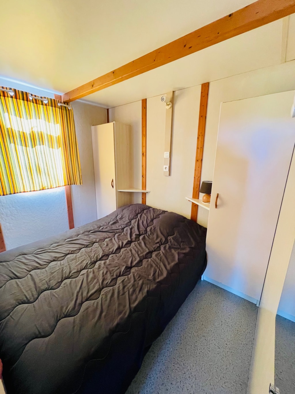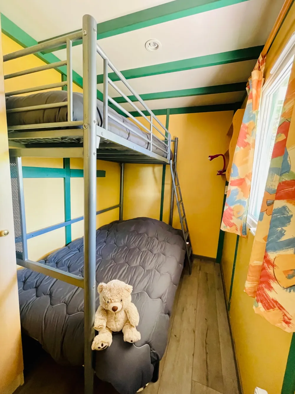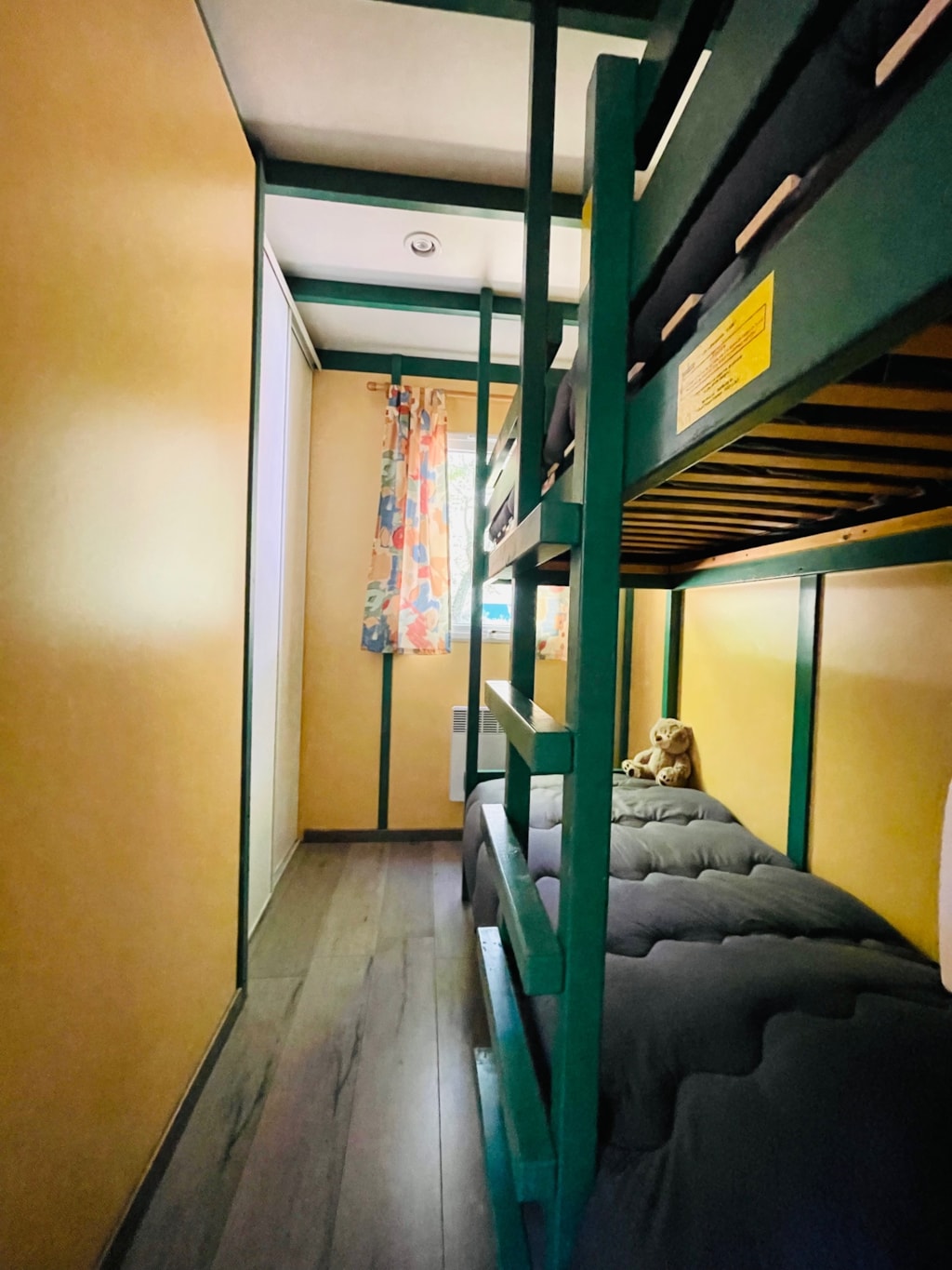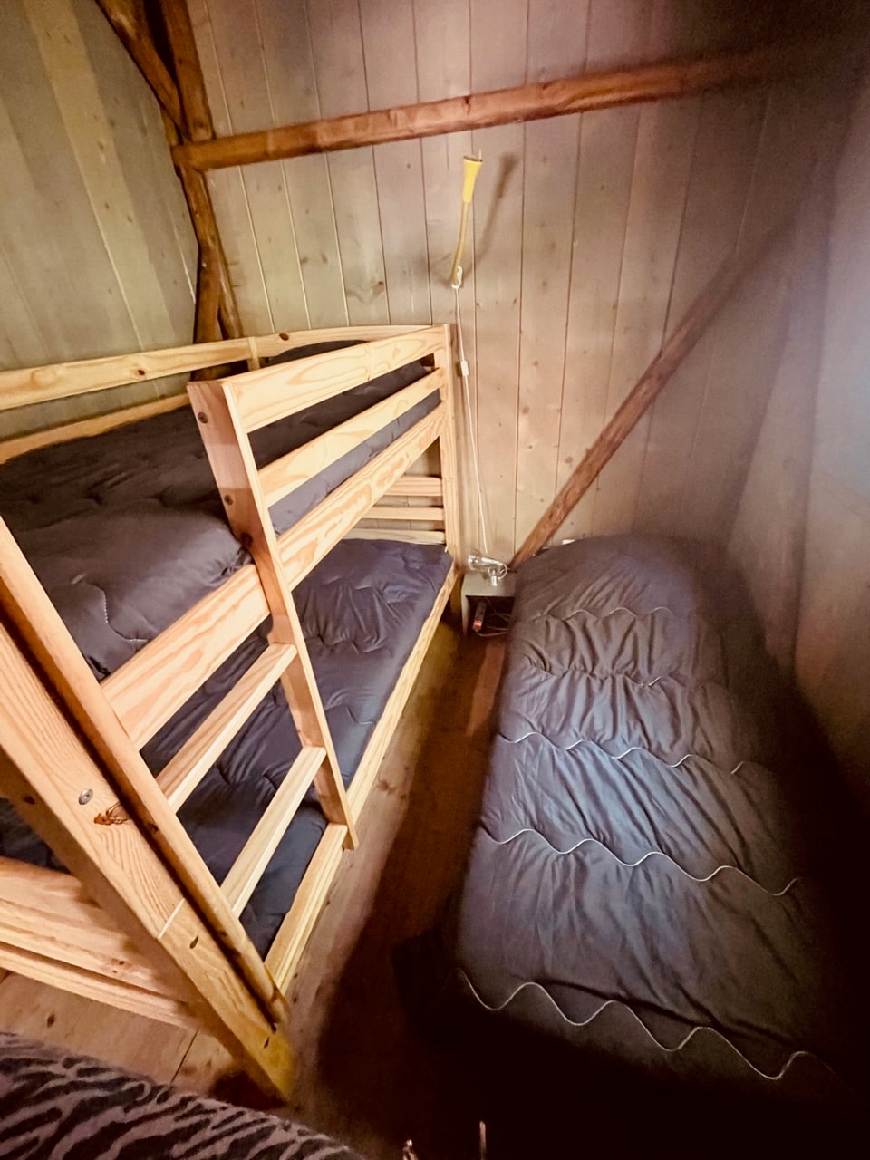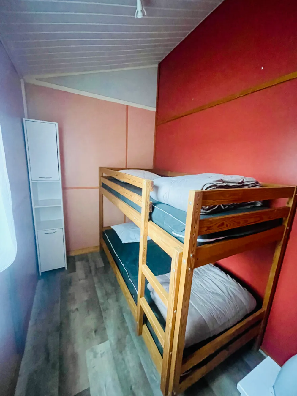 - 2 chambres (une chambre avec lit de 140x190 cm et une chambre avec lits superposés 140x190 en bas et 90x190 cm en haut). Couvertures et oreillers fournis, draps non fournis (en supplément).