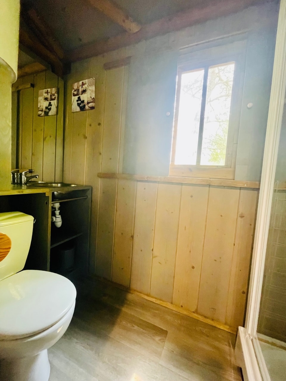 Cabane des "Robinson", toute en bois sur pilotis composée de : - 2 chambres (une chambre avec un lit de 140X190, l'autre chambre avec 3 lits de 80X190 dont 1 superposé), - Un canapé type BZ dans le salon (non dédié au couchage), - Une kitchenette équipée d'un réfrigérateur avec petit congélateur, d'un réchaud 2 feux gaz, d'un micro-ondes, d'une cafetière électrique, d'une bouilloire, de vaisselle et d'ustensiles de cuisine, - Une salle d'eau avec lavabo, douche et WC, - Une grande terrasse bois couverte de 12m² avec salon de jardin bois et transats.