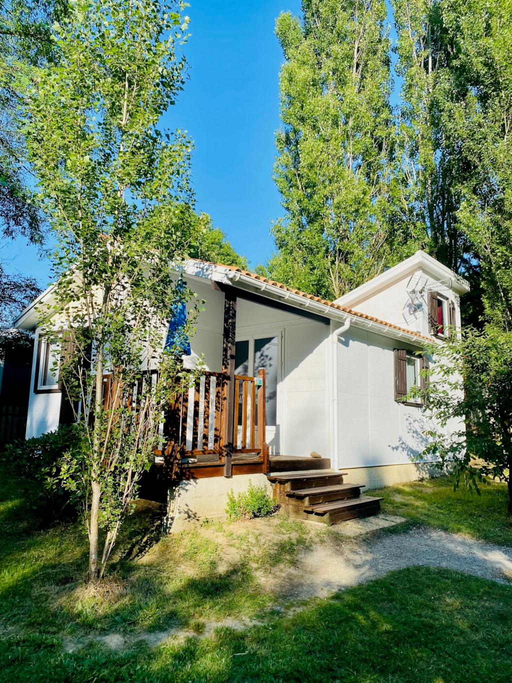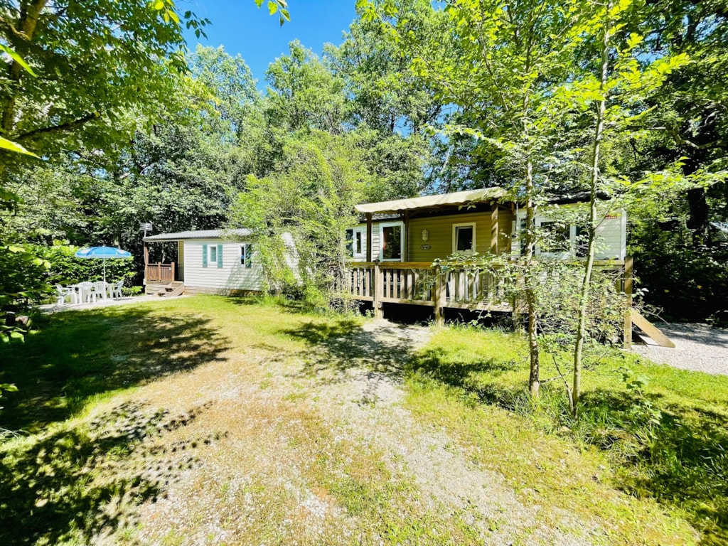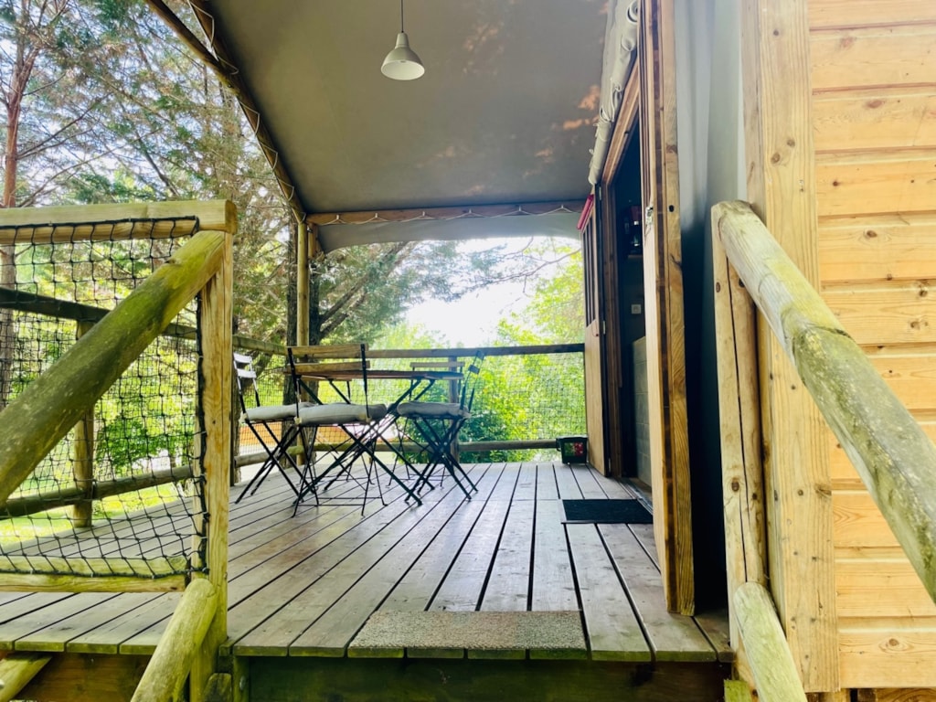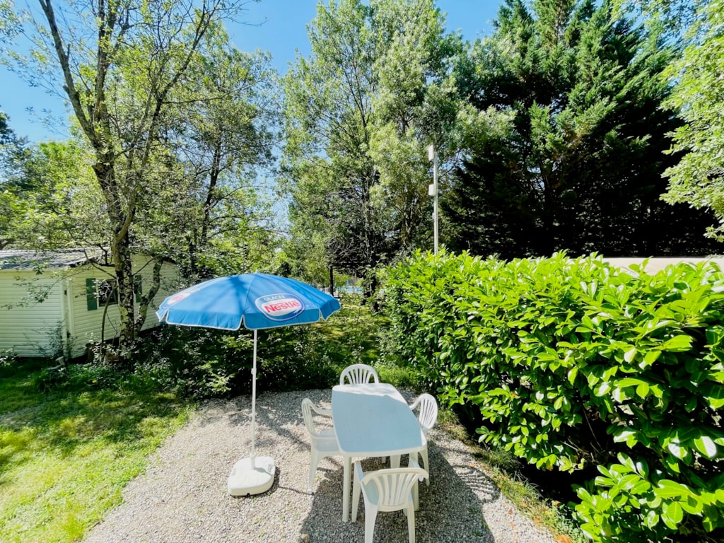 - Une terrasse en bois de 15 m² couverte et ombragée avec salon de jardin.