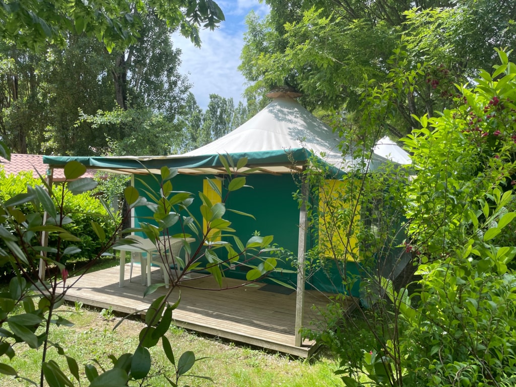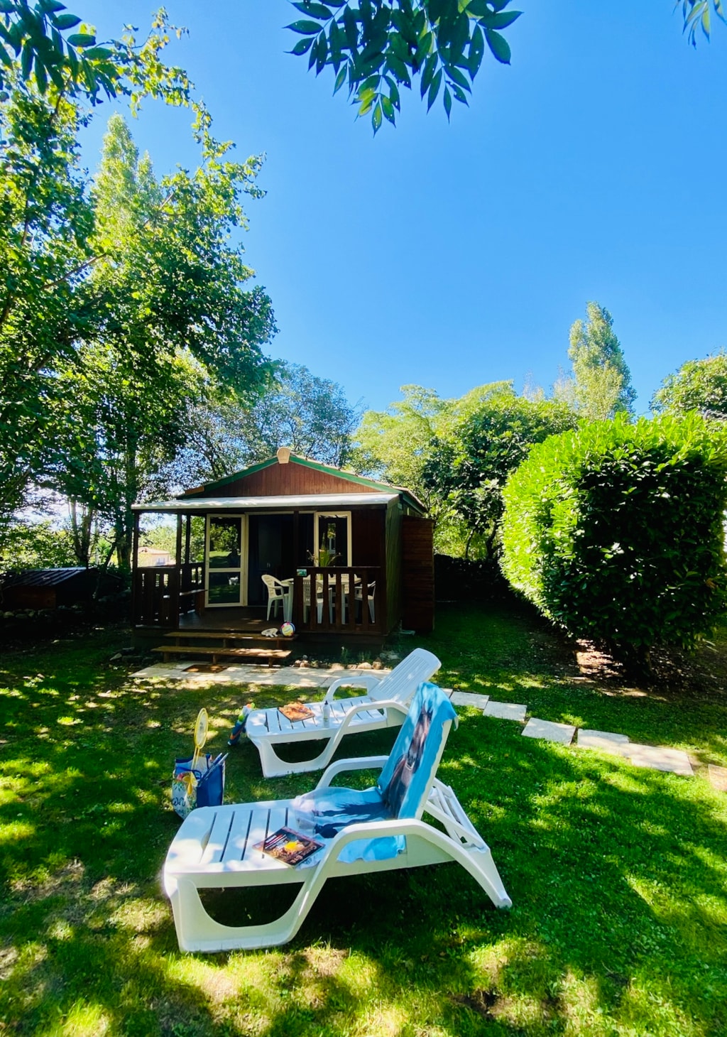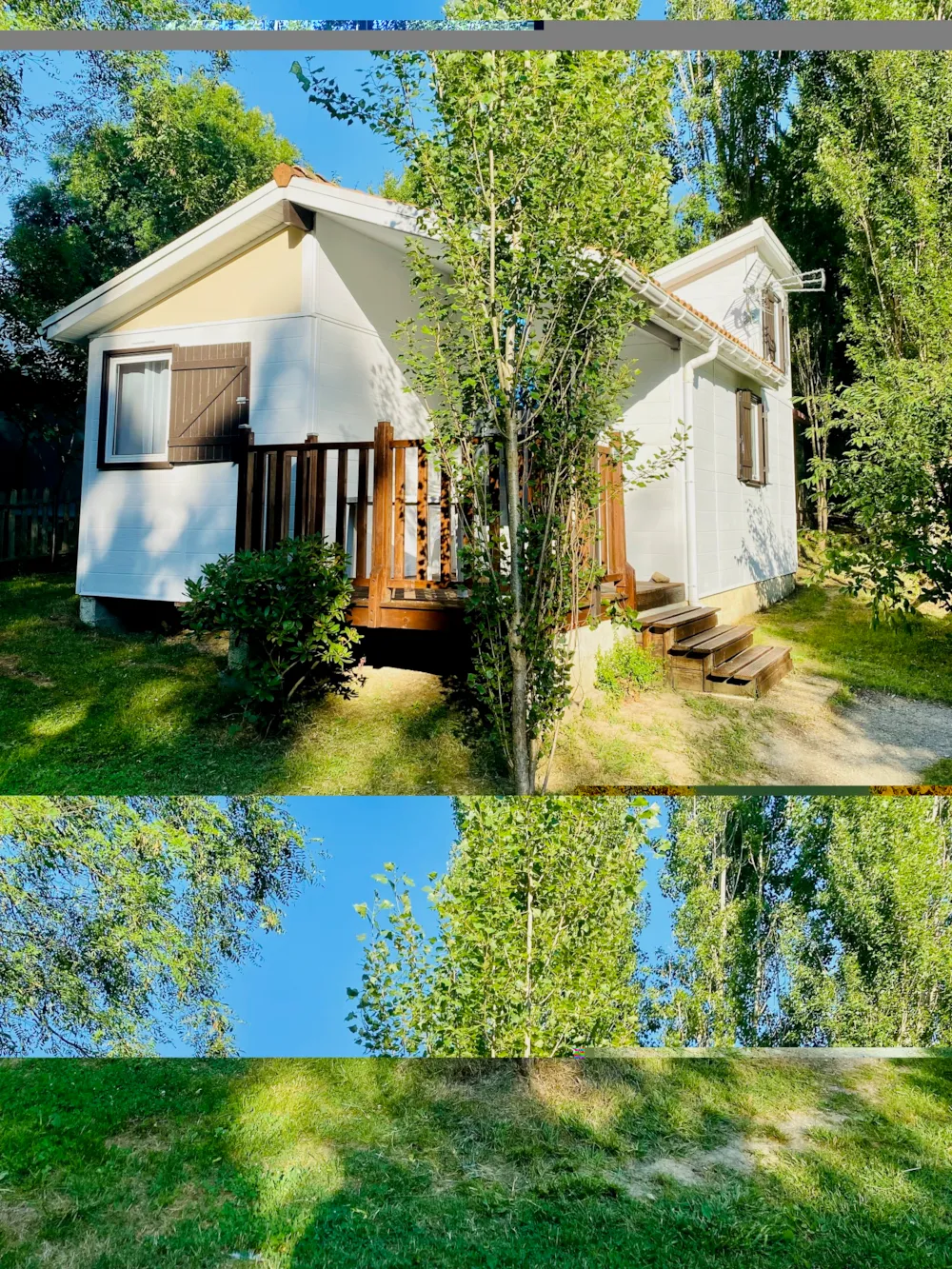 - Une terrasse en bois de 15 m² couverte et ombragée avec salon de jardin.