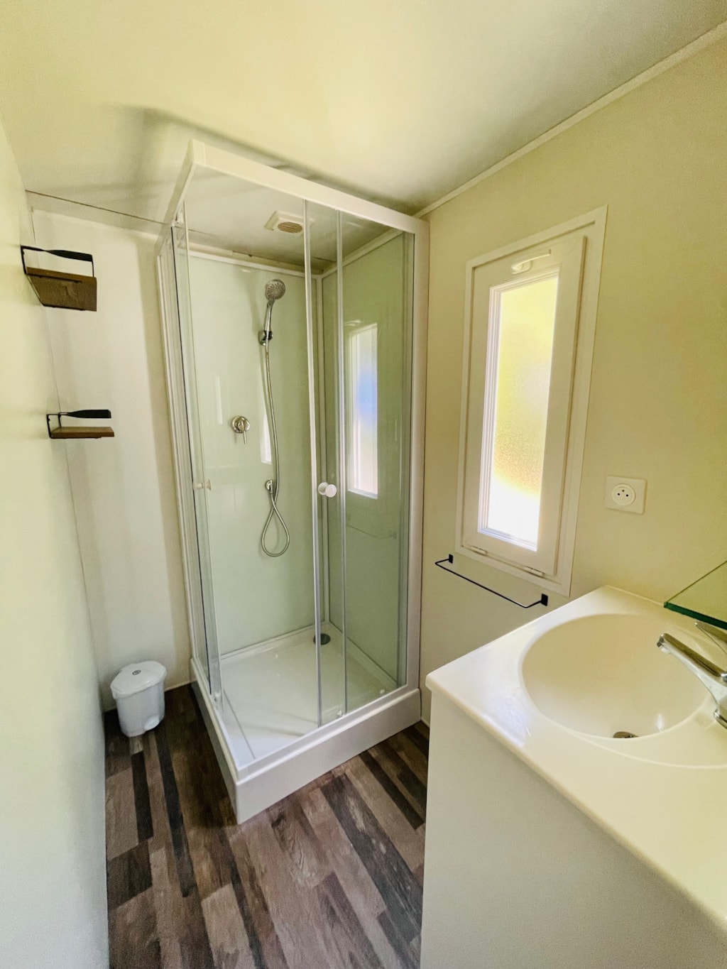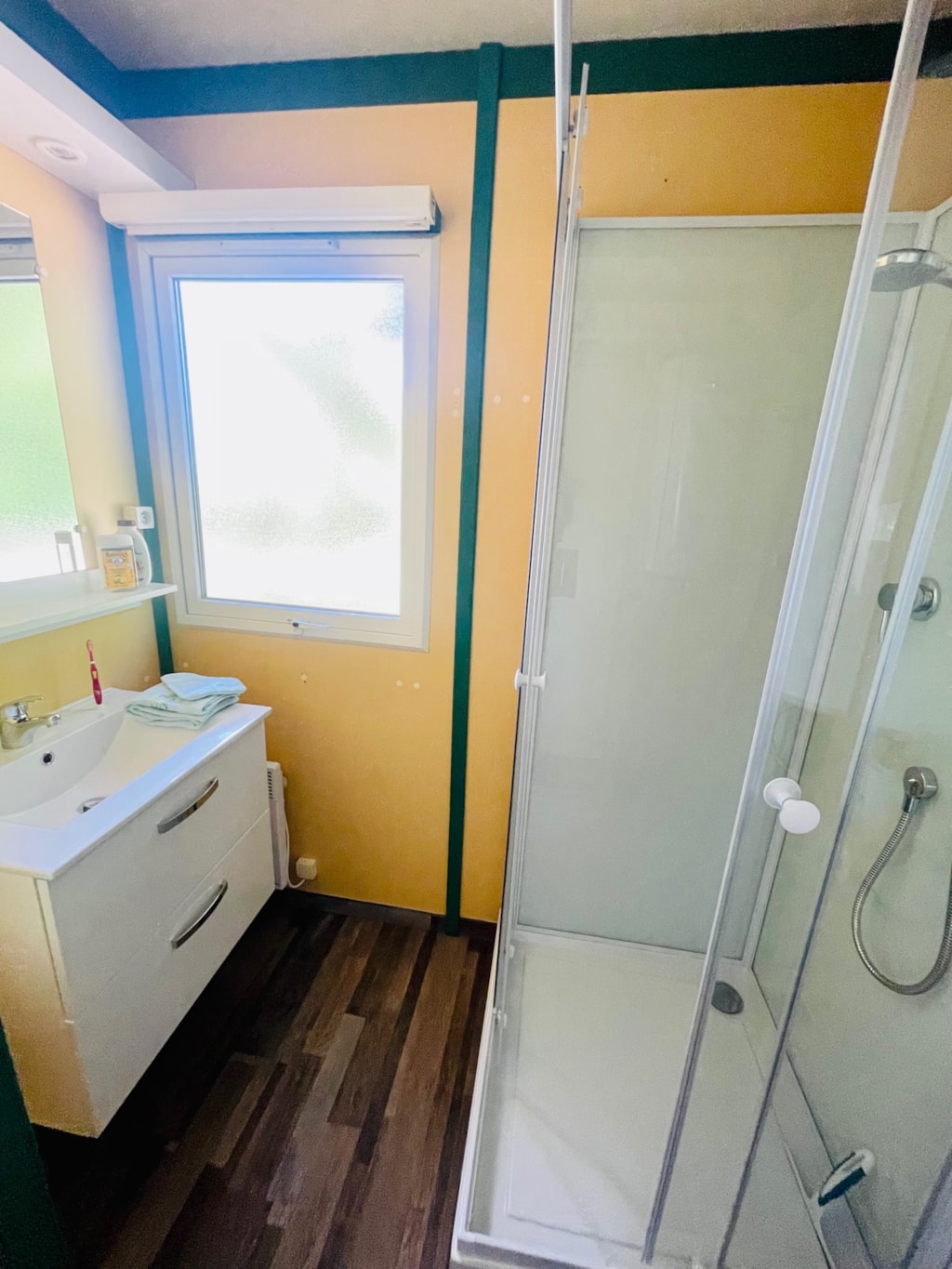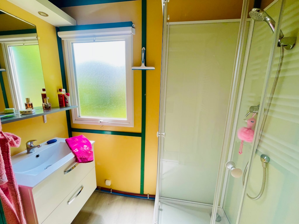 - Une salle d'eau avec lavabo et douche.