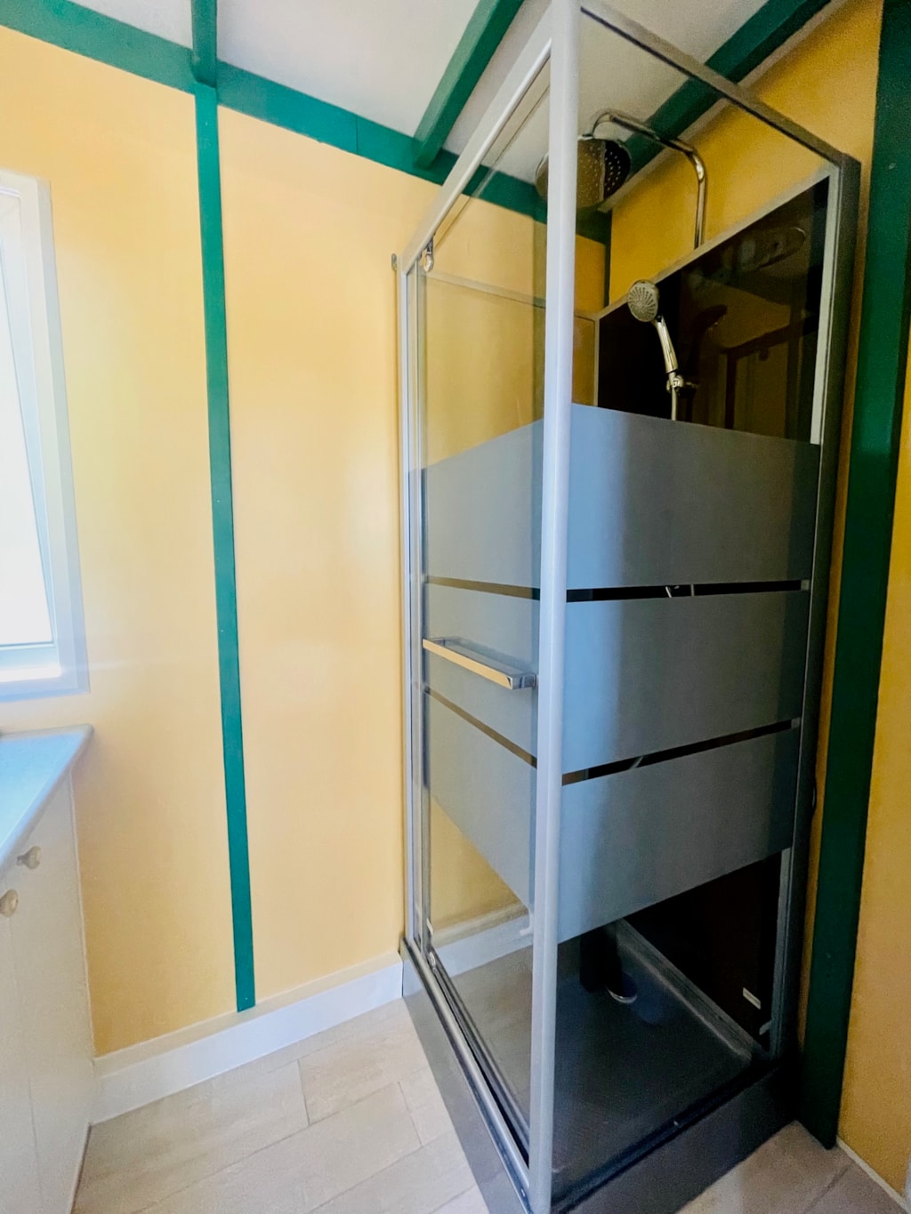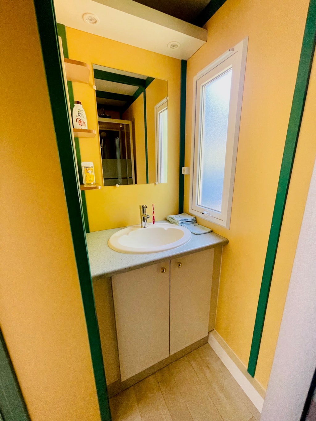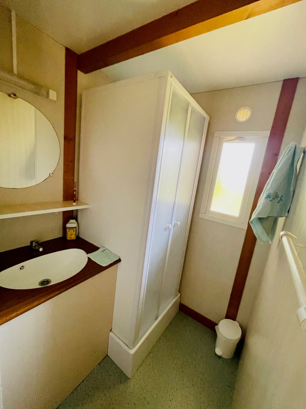 - Une salle d'eau avec lavabo et douche.