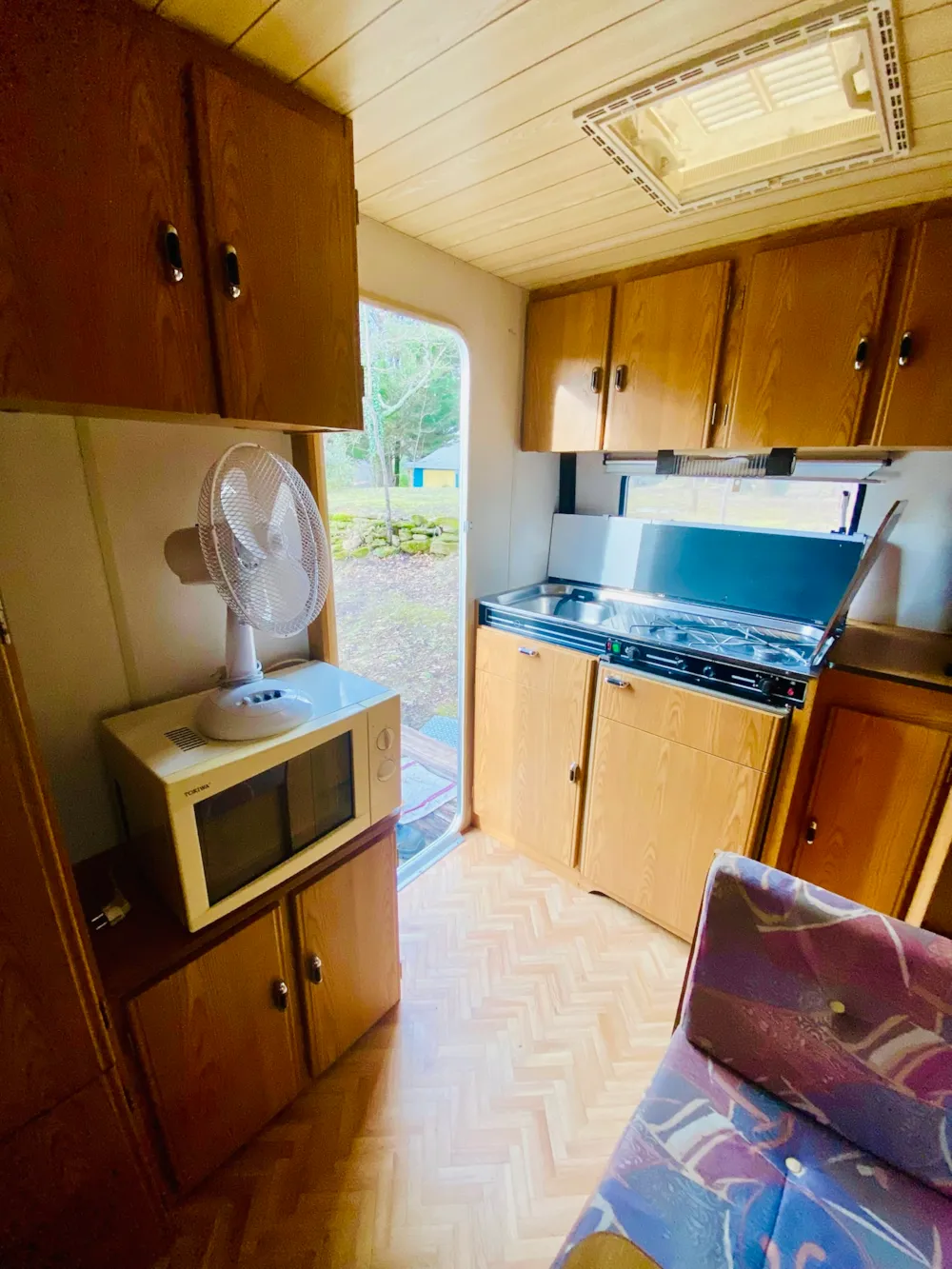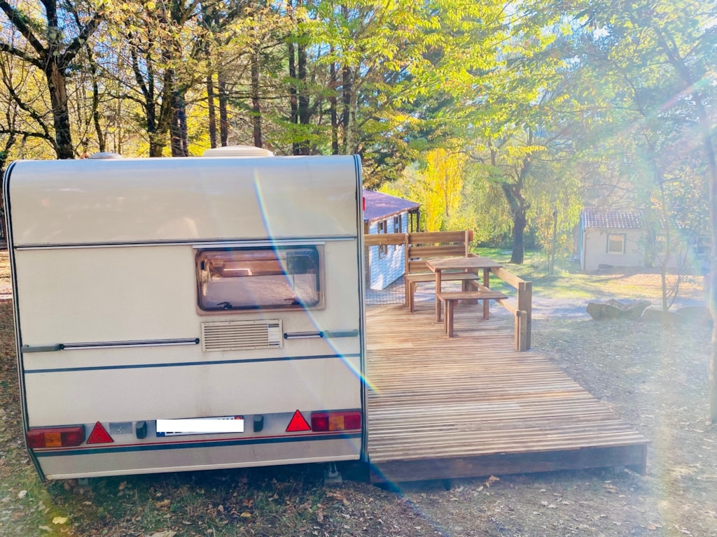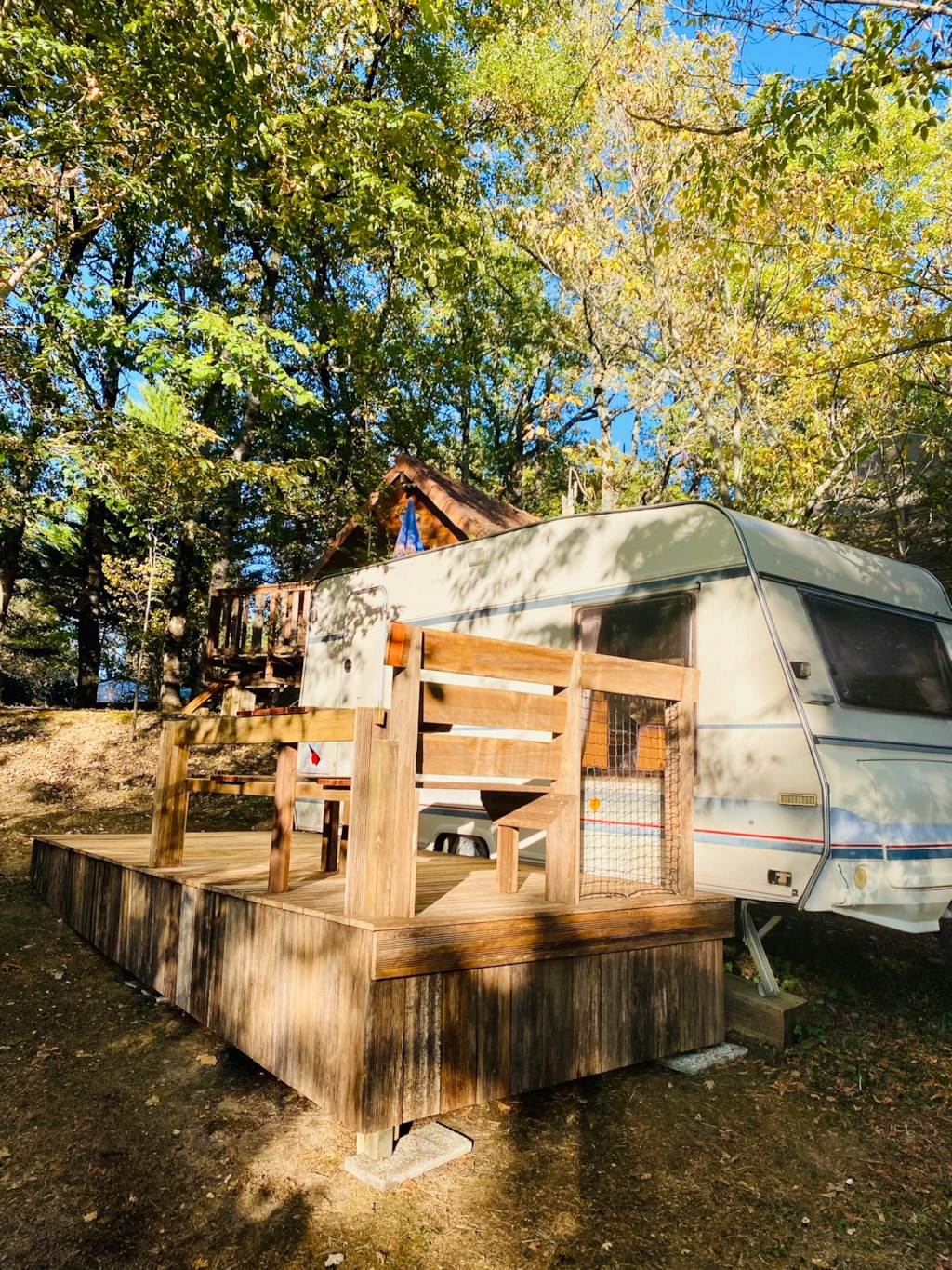 Hinweis: Es ist nicht möglich, ein Zelt auf dem Platz des Wohnwagens (am Hang) aufzustellen.