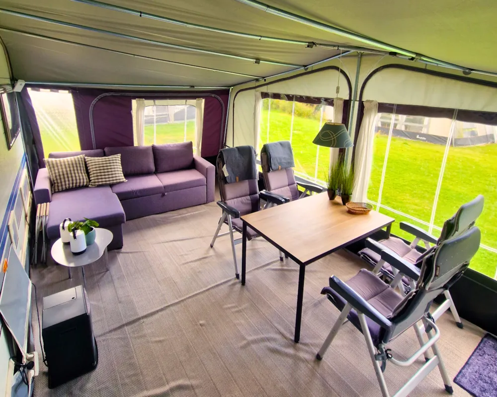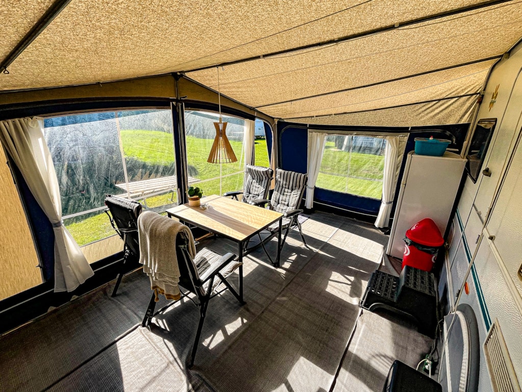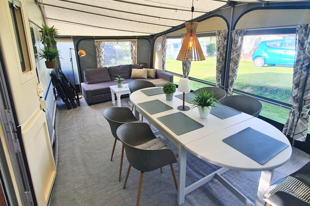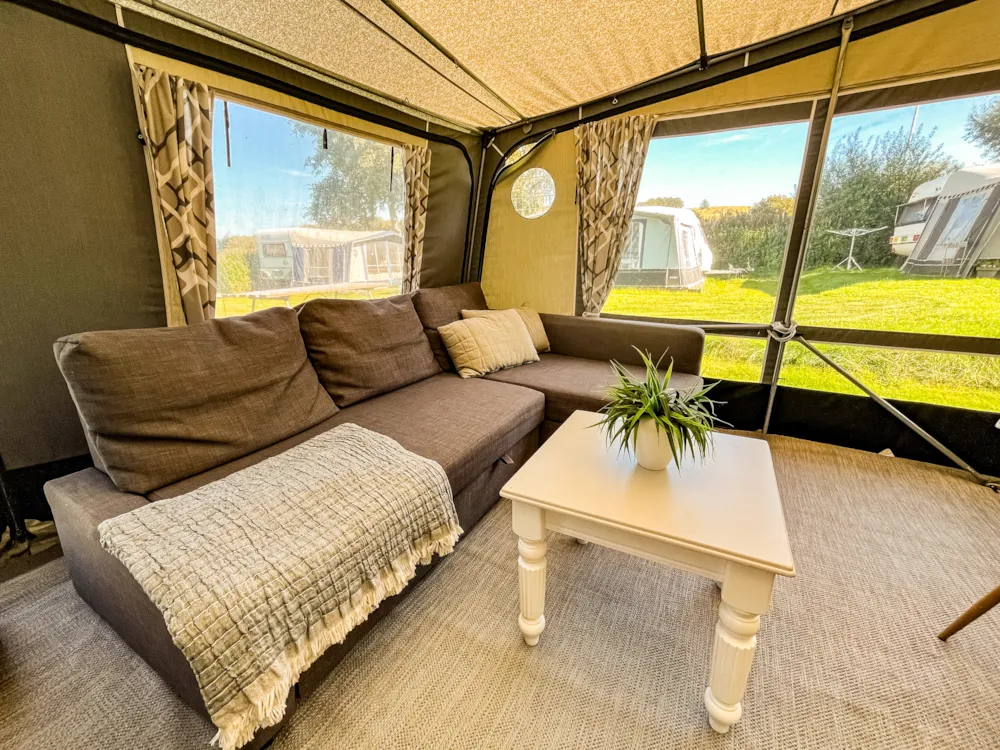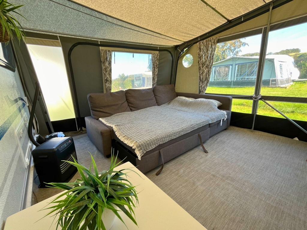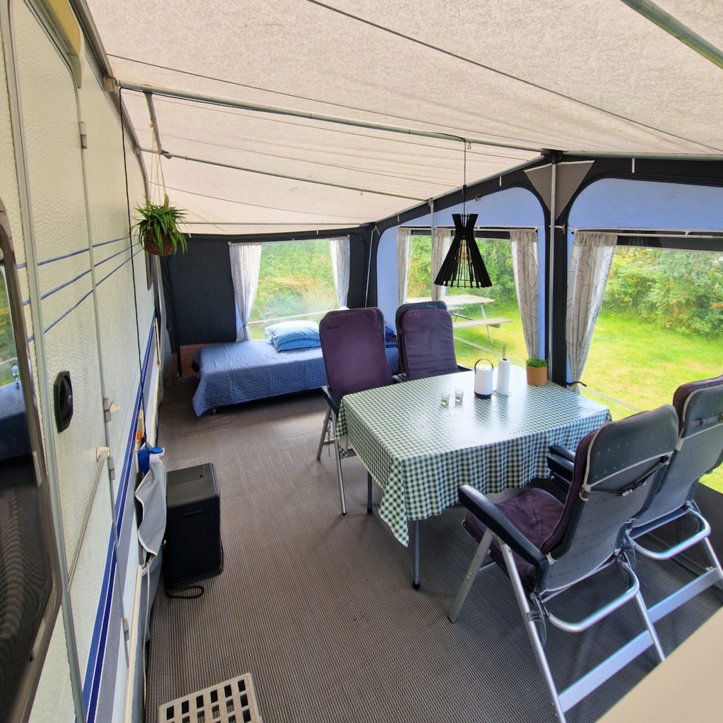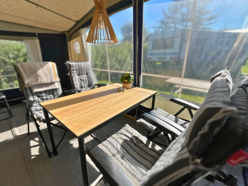 Wohnwagen und Vorzelt sind entsprechend der Atmosphäre des Campingplatzes gestaltet: gemütlich, ruhig, komfortabel und familienfreundlich.