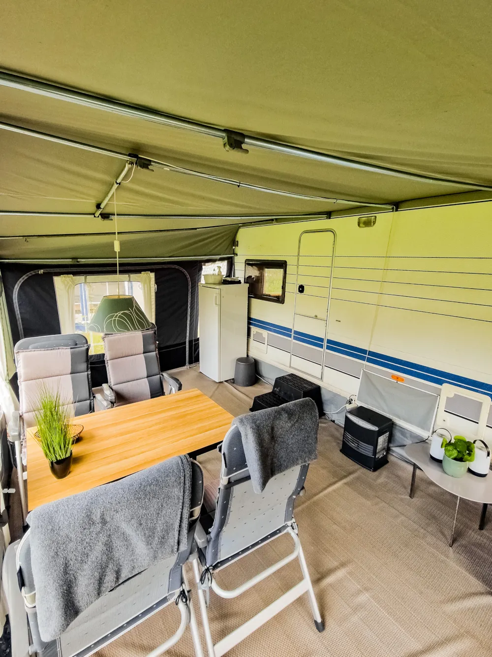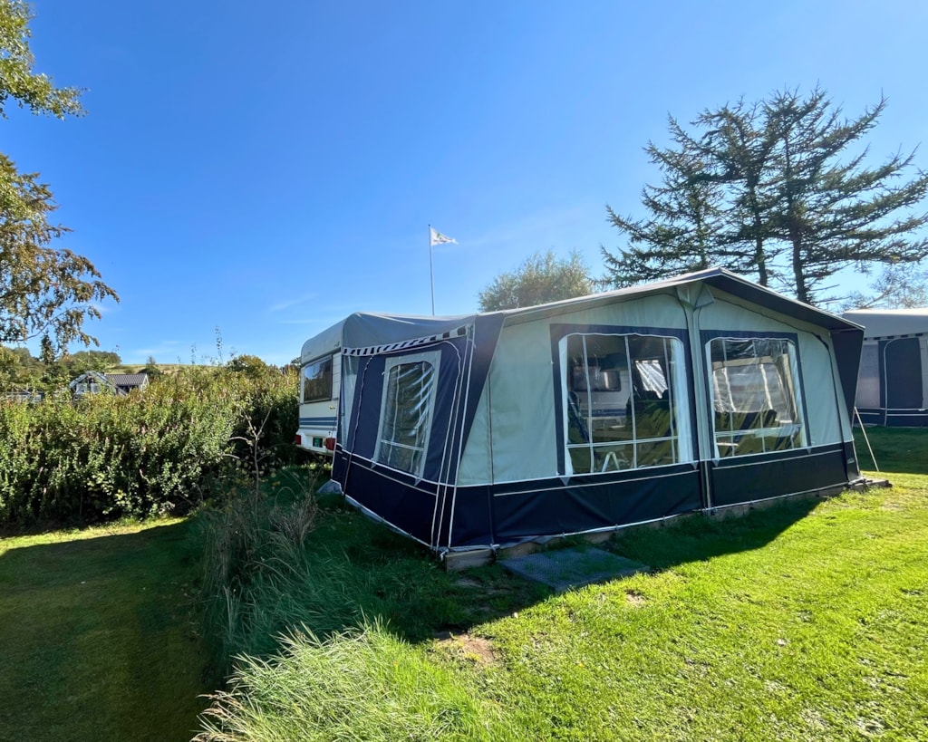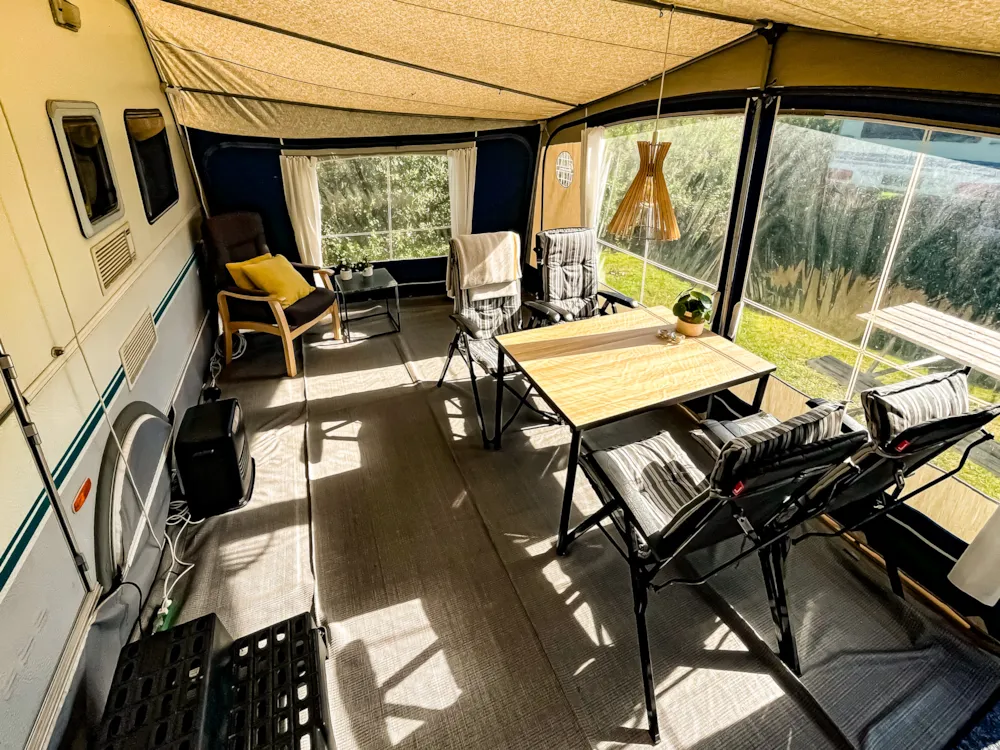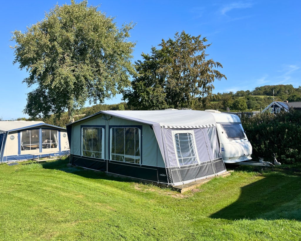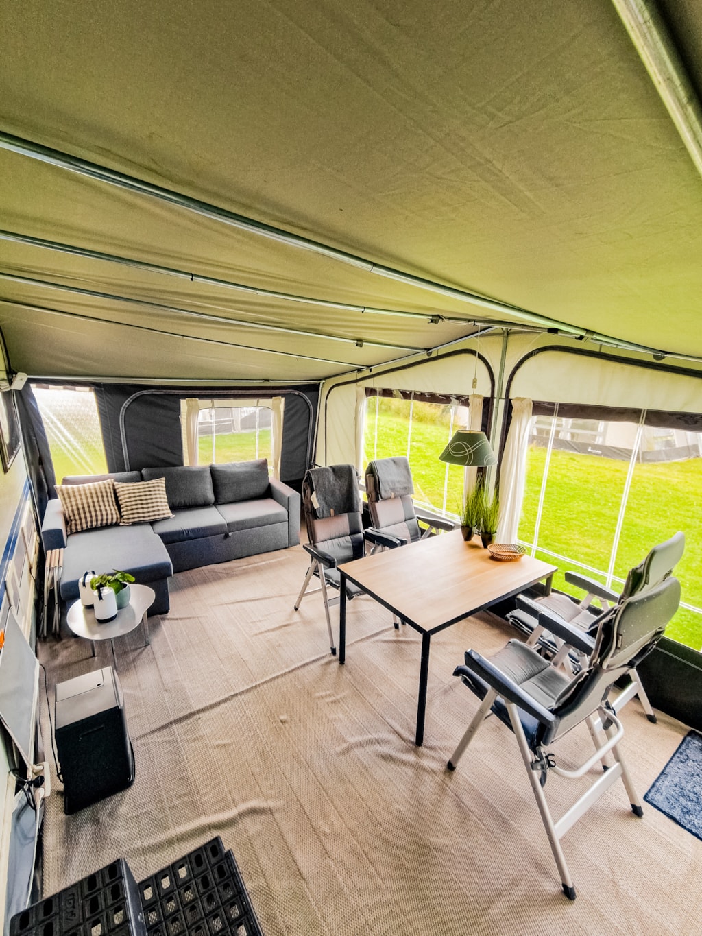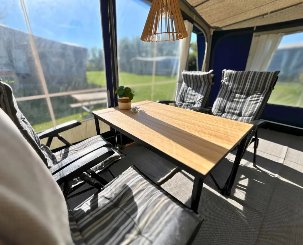 Wohnwagen und Vorzelt sind entsprechend der Atmosphäre des Campingplatzes gestaltet: gemütlich, ruhig, komfortabel und familienfreundlich.