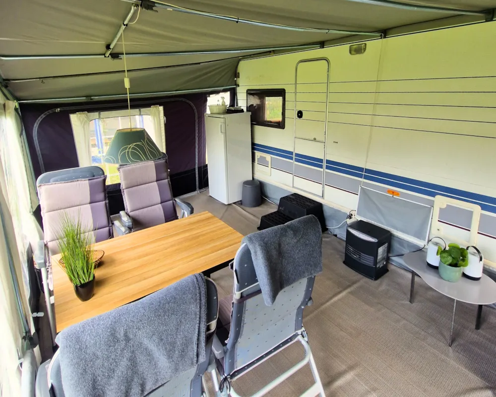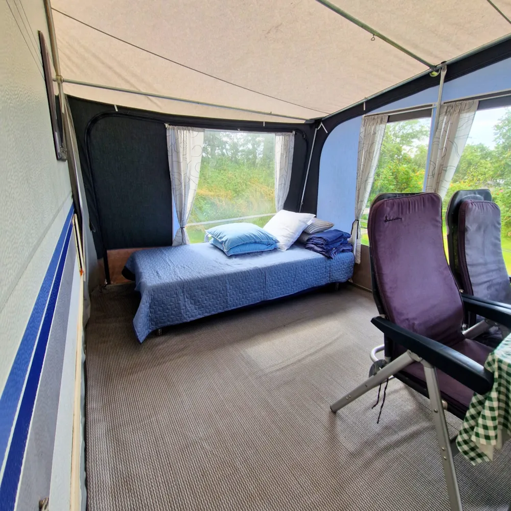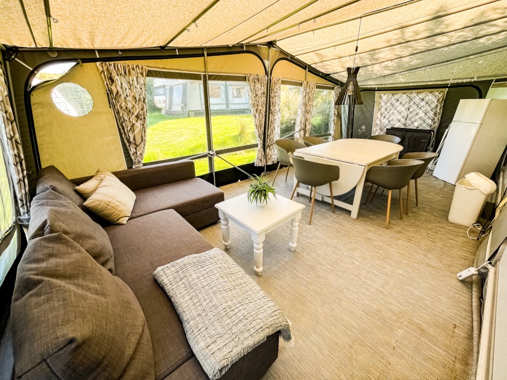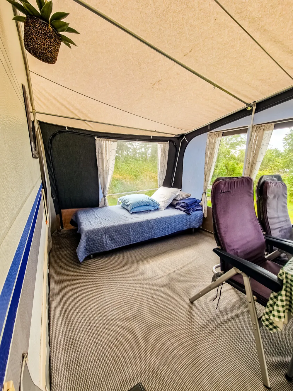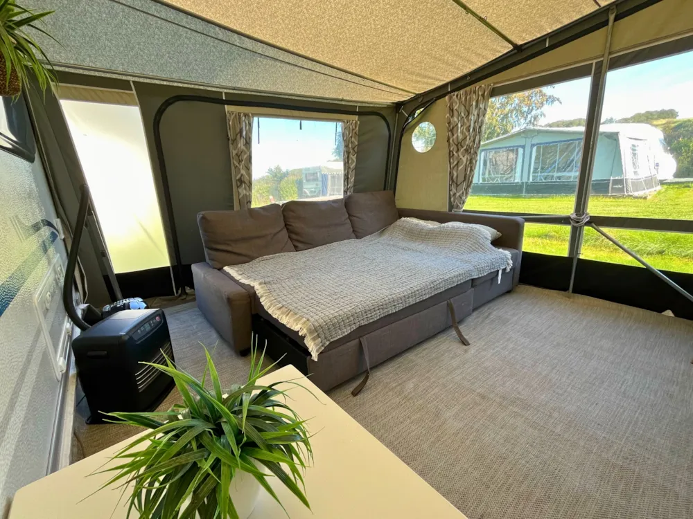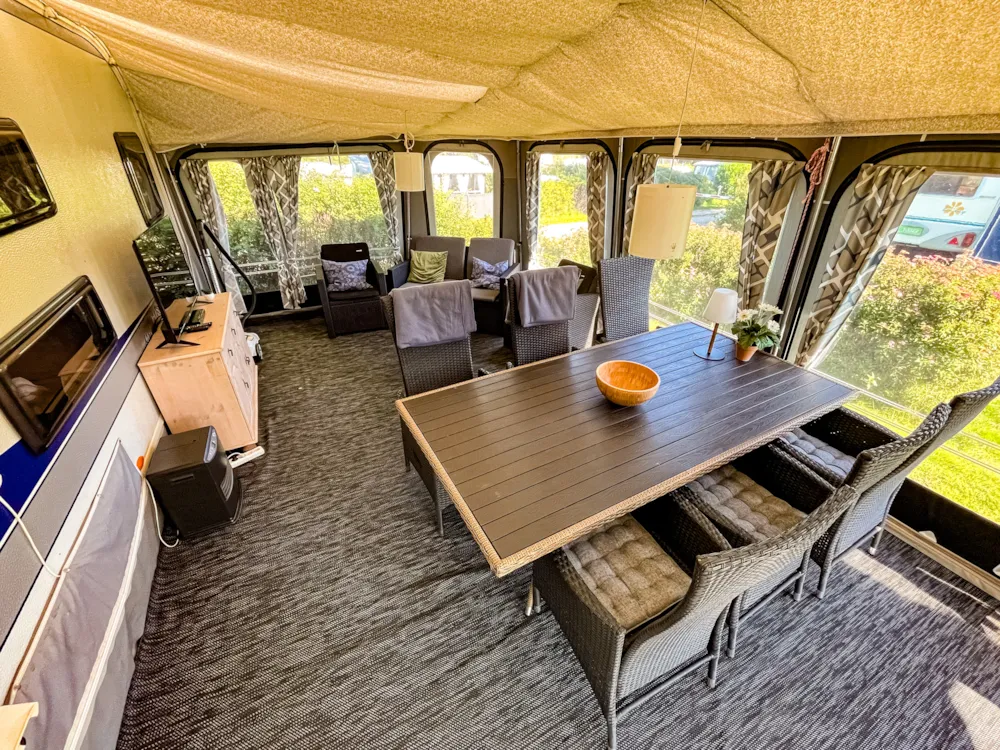 Wohnwagen und Vorzelt sind entsprechend der Atmosphäre des Campingplatzes gestaltet: gemütlich, ruhig, komfortabel und familienfreundlich.