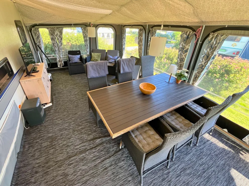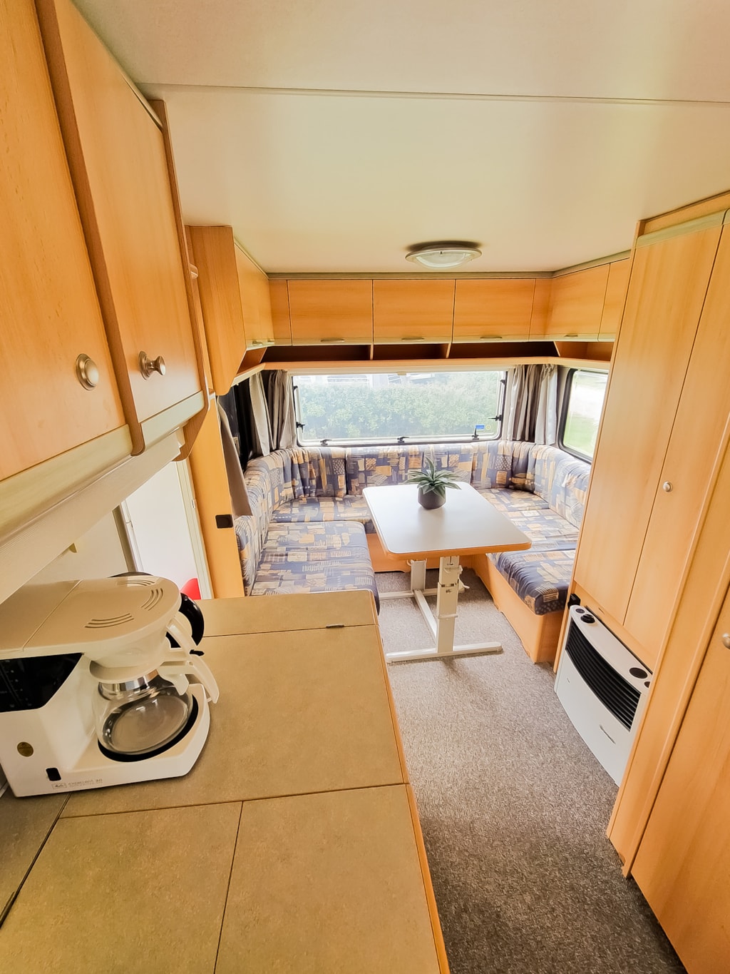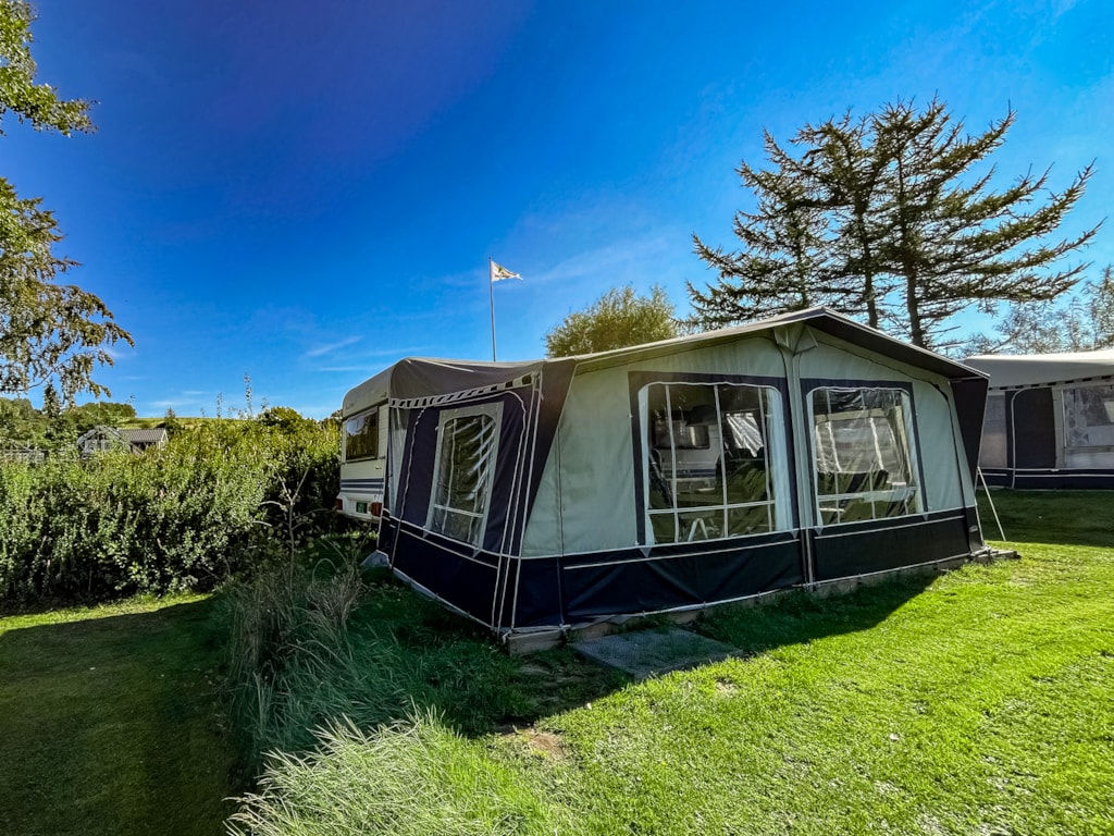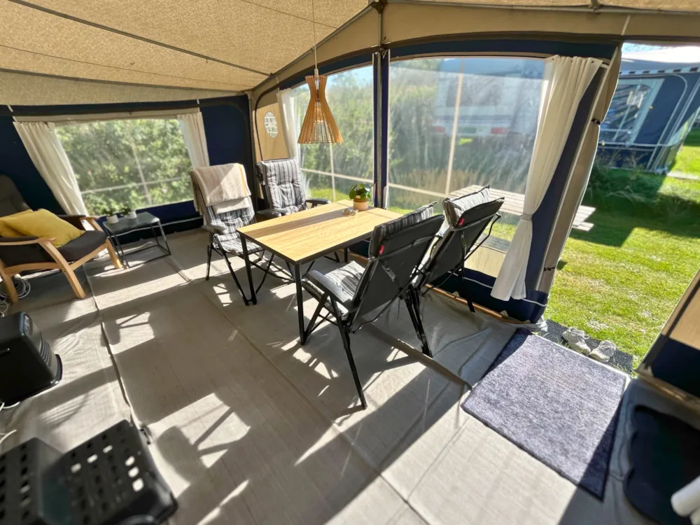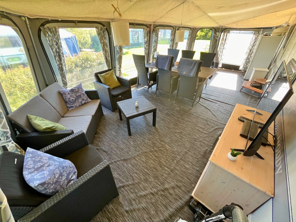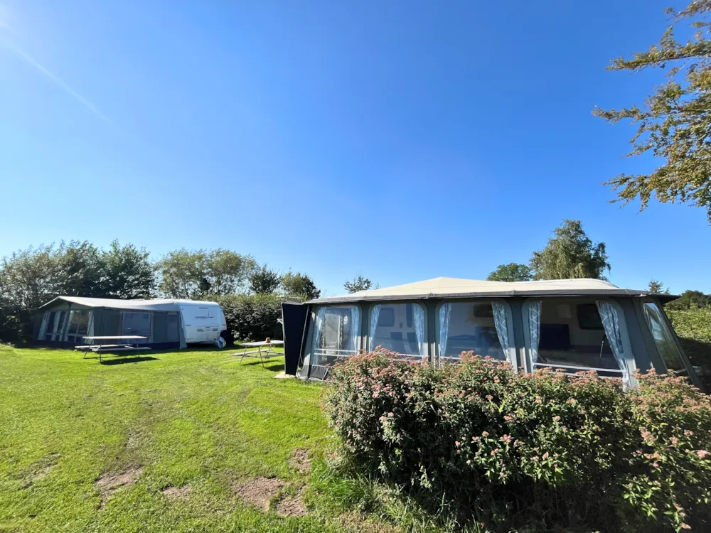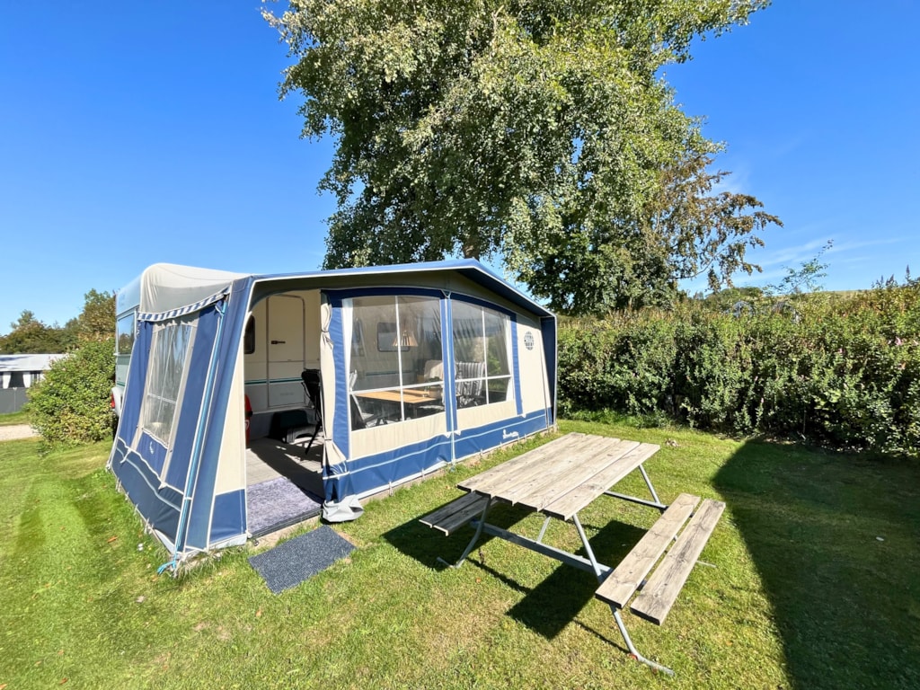 Wohnwagen und Vorzelt sind entsprechend der Atmosphäre des Campingplatzes gestaltet: gemütlich, ruhig, komfortabel und familienfreundlich.