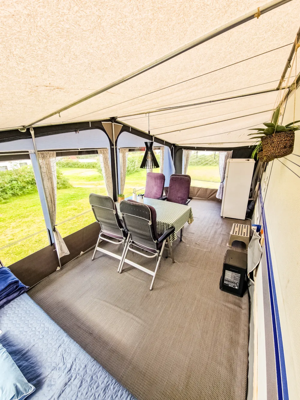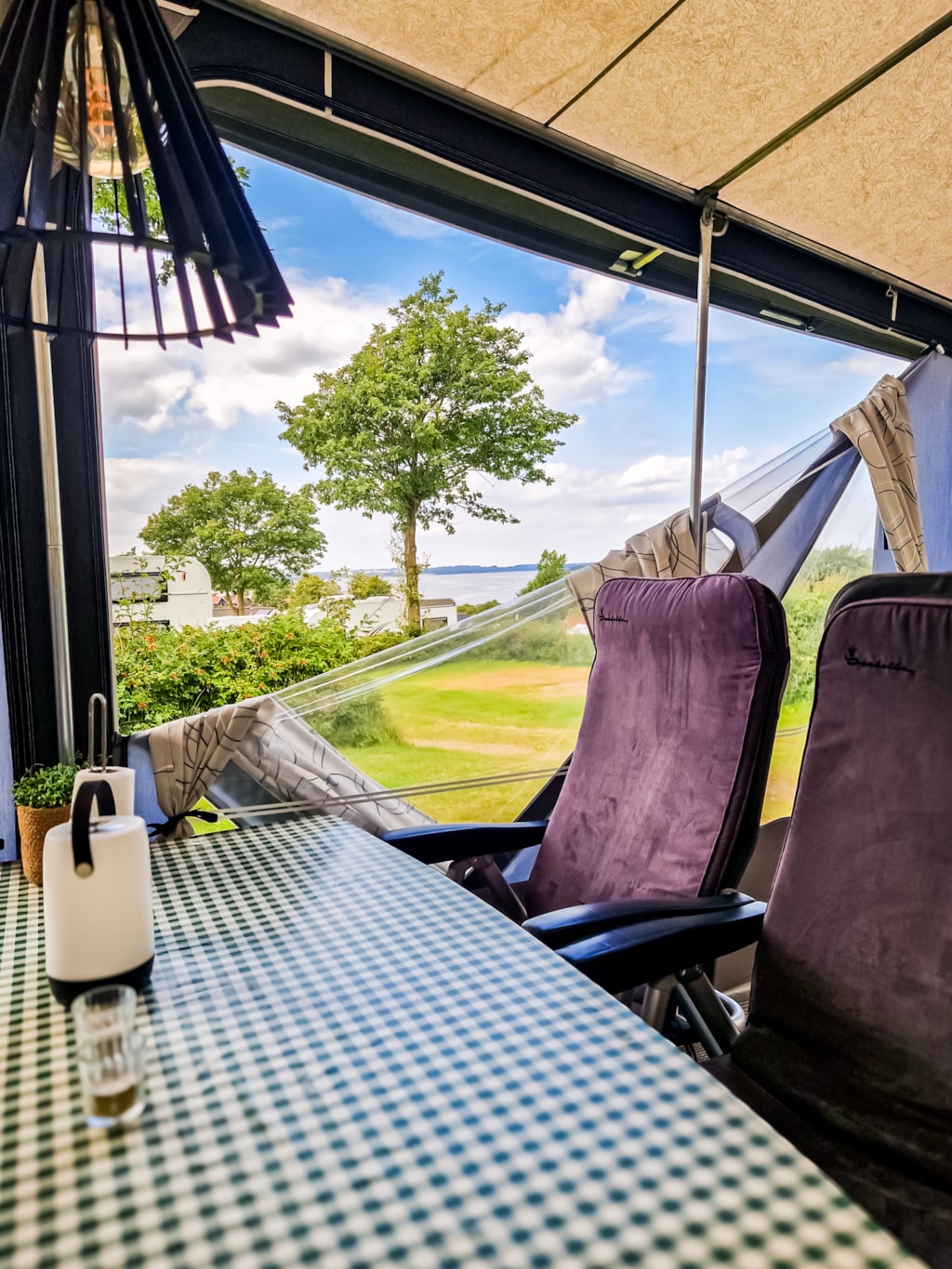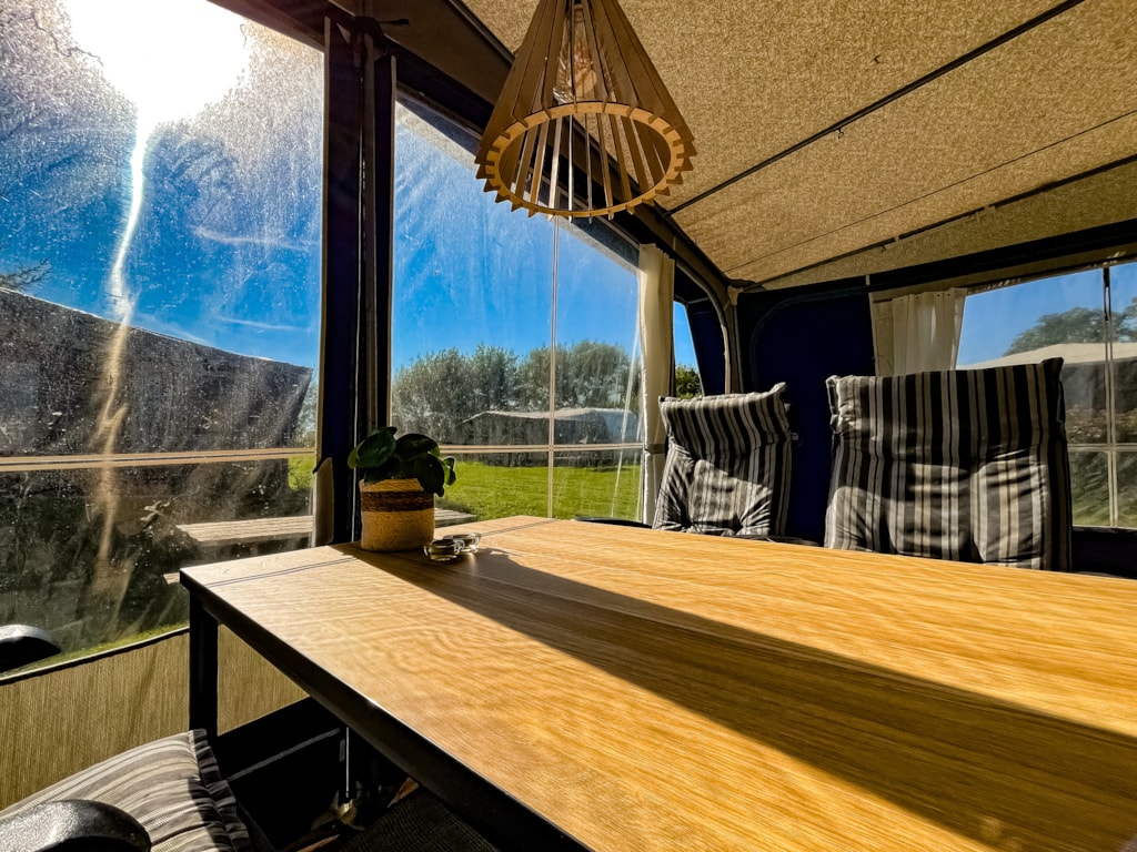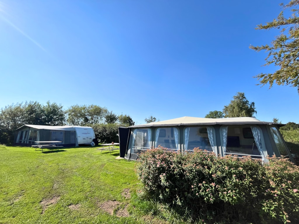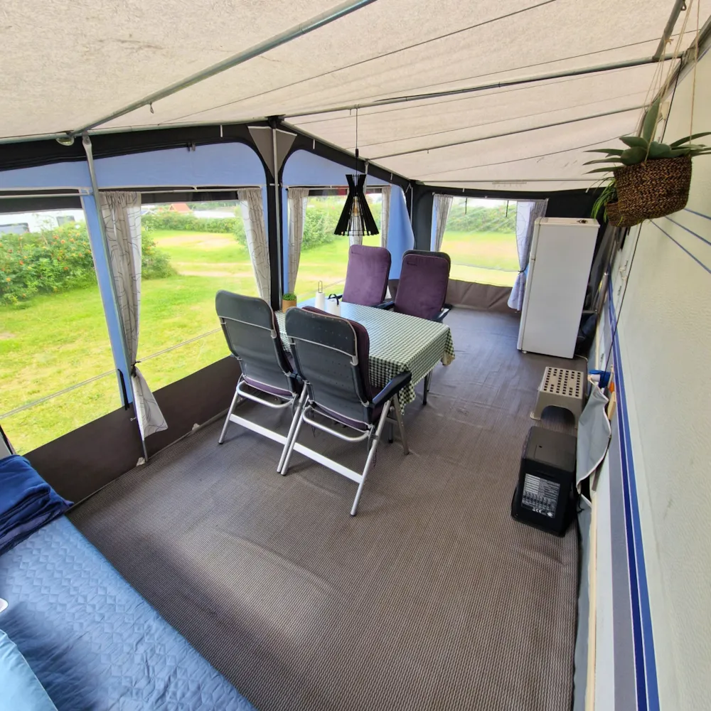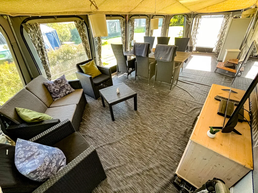 Wohnwagen und Vorzelt sind entsprechend der Atmosphäre des Campingplatzes gestaltet: gemütlich, ruhig, komfortabel und familienfreundlich.