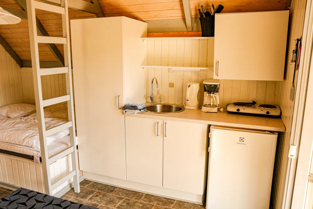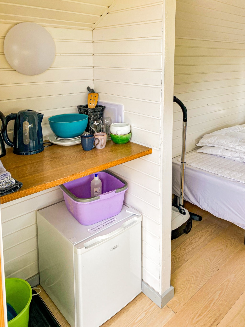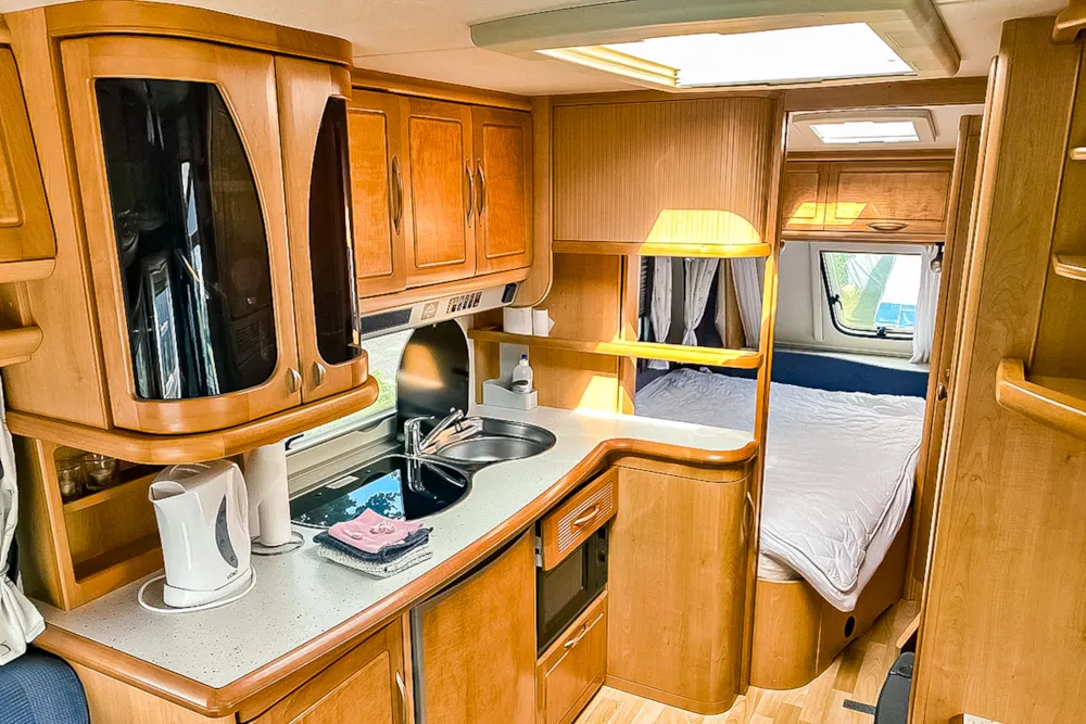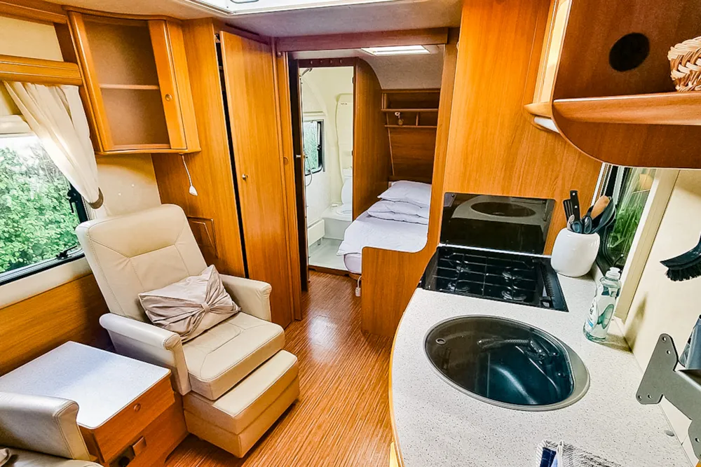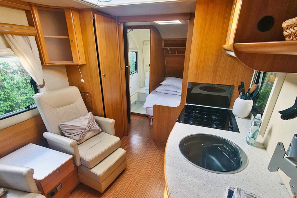 Im Vorzelt gibt es 6 Sitzplätze und einen Kühlschrank. Gasherde und Öfen im Transporter dürfen nicht genutzt werden. Es gibt ein elektrisches Kochfeld.