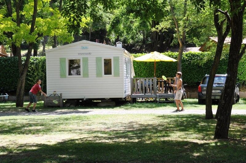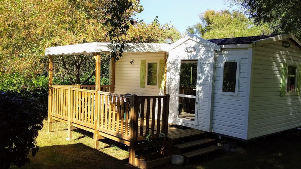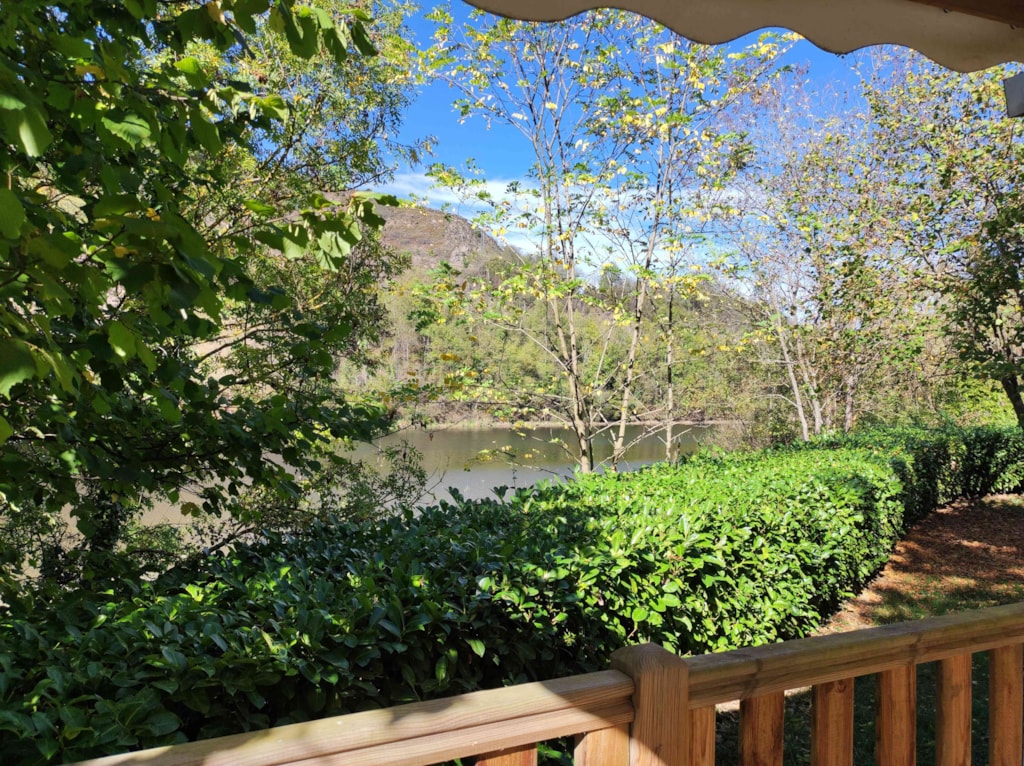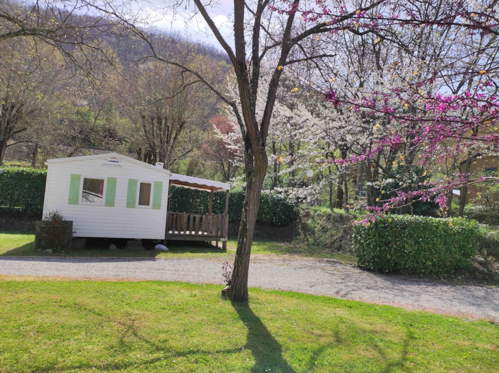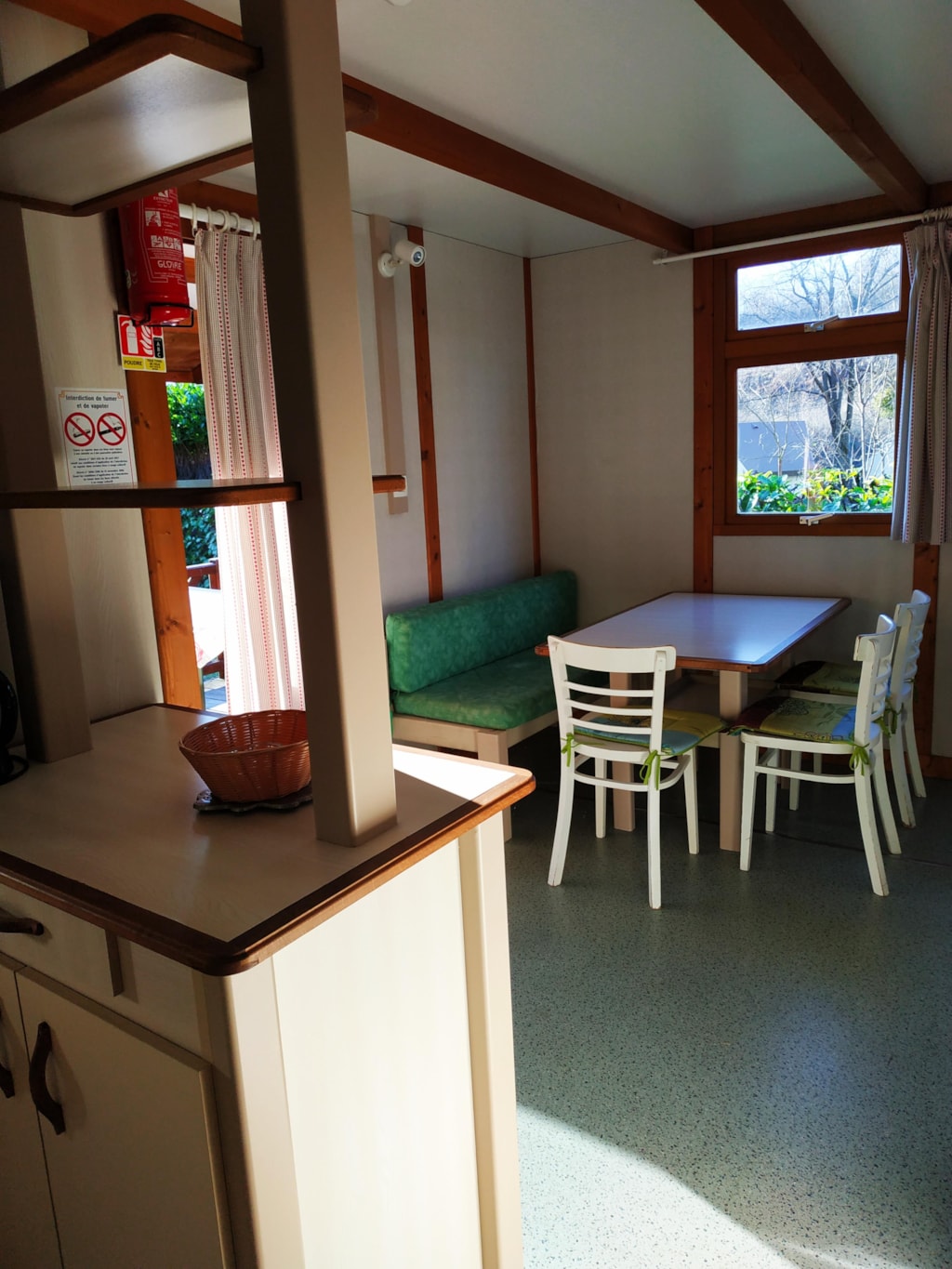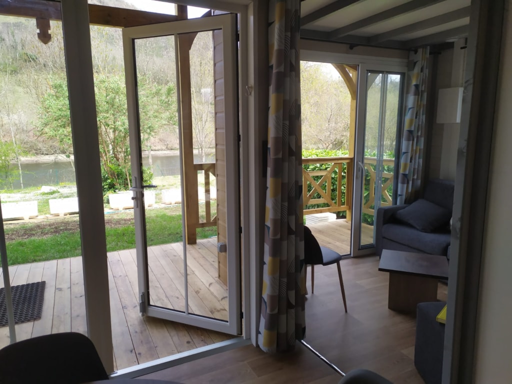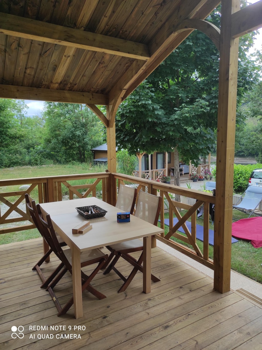 Eco-Lodge 17 m² + halbüberdachte Terrasse. Ideal, um den Campingplatz zu entdecken und mit der Familie zur Quelle zurückzukehren. Hund sozial und geimpft an der Leine akzeptiert. Kategorie 1 und 2 verboten.