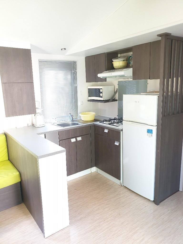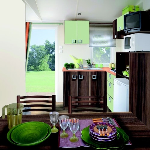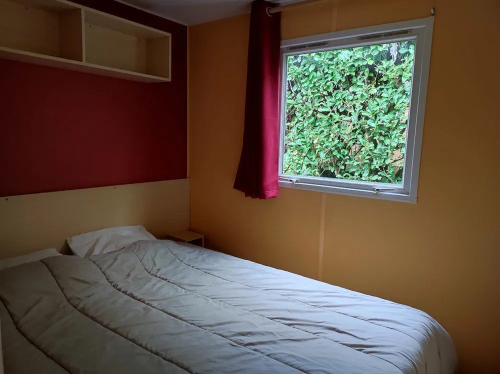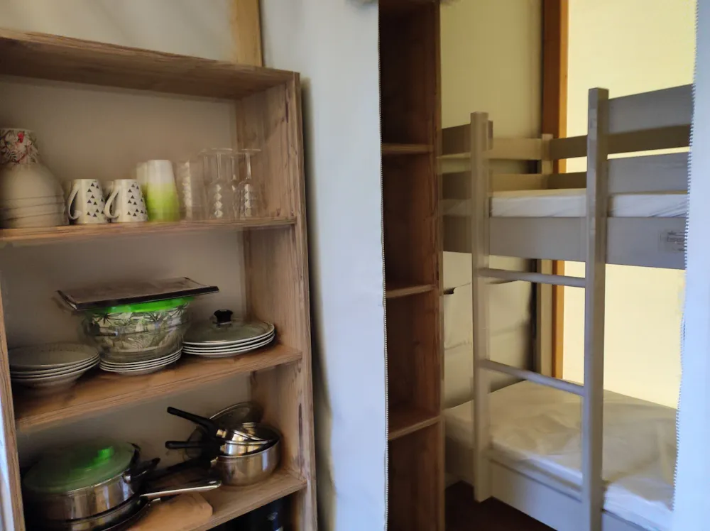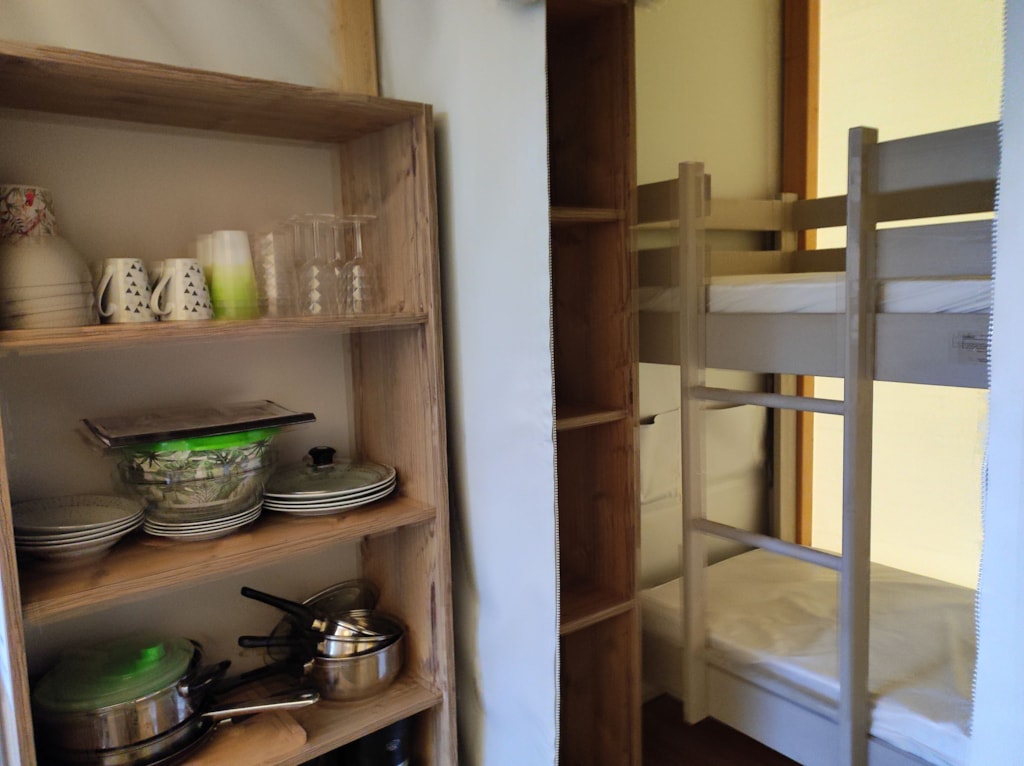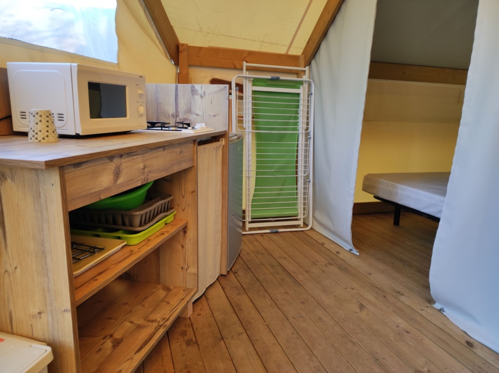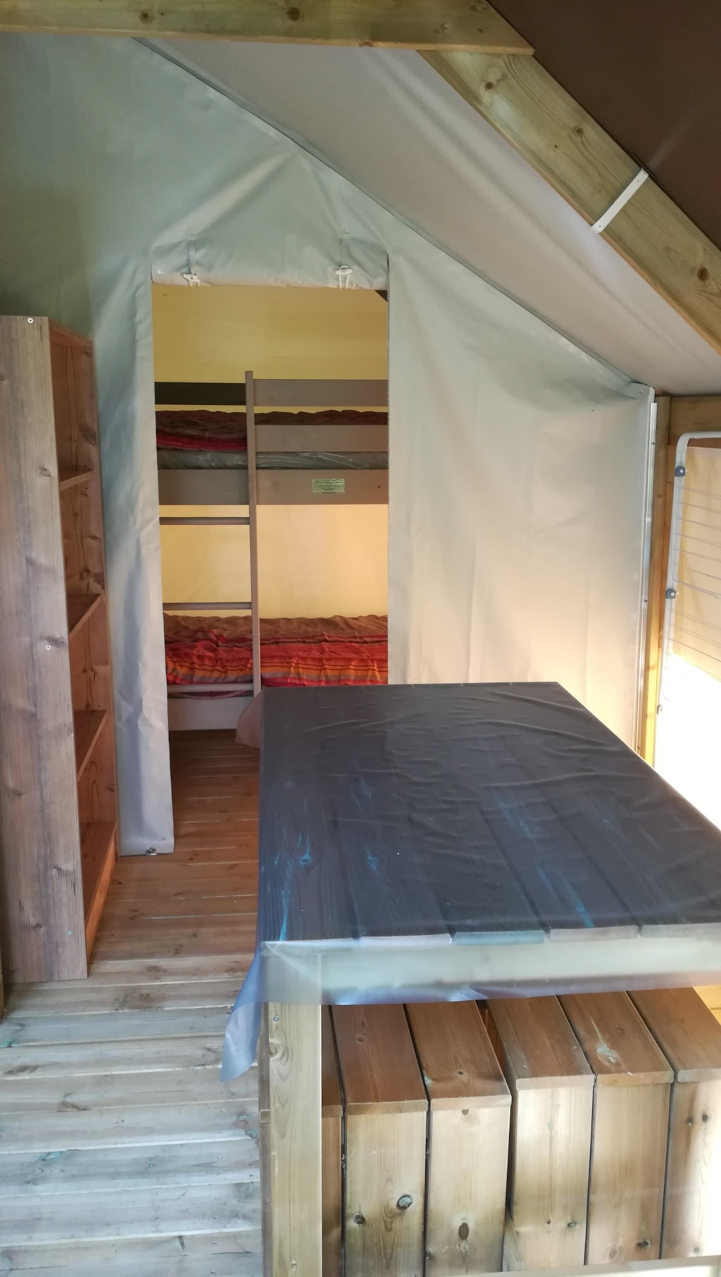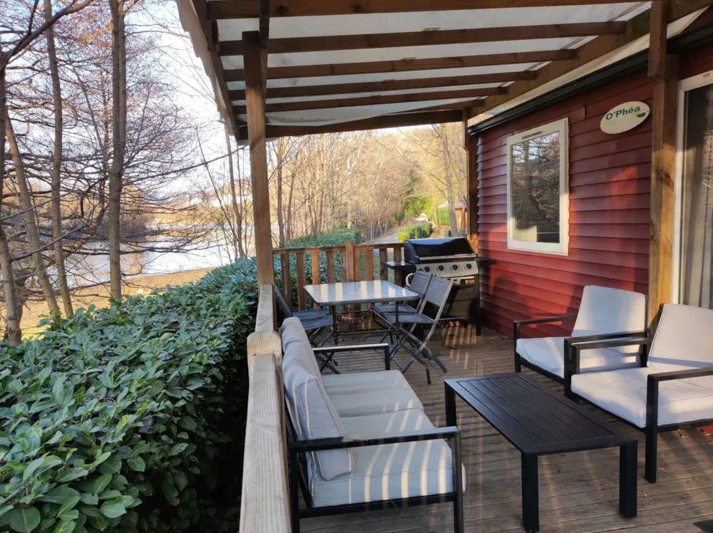 Eco-Lodge 17 m² + halbüberdachte Terrasse. Ideal, um den Campingplatz zu entdecken und mit der Familie zur Quelle zurückzukehren. Hund sozial und geimpft an der Leine akzeptiert. Kategorie 1 und 2 verboten.