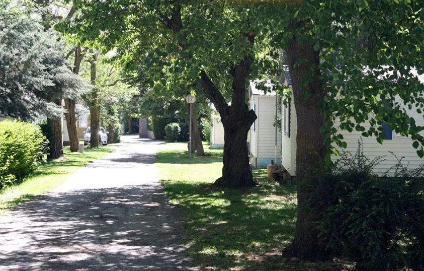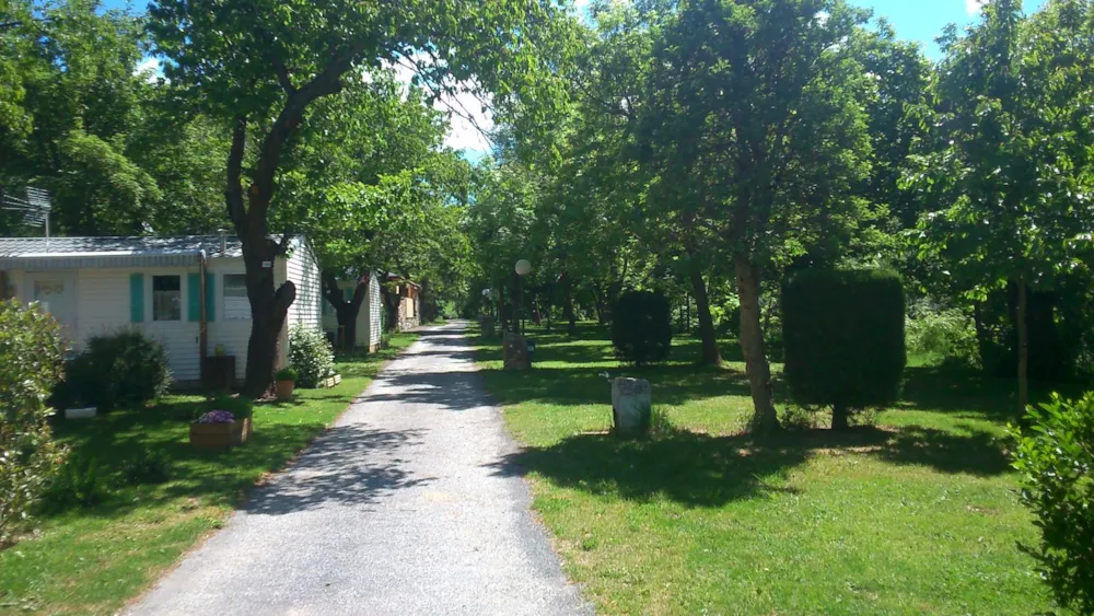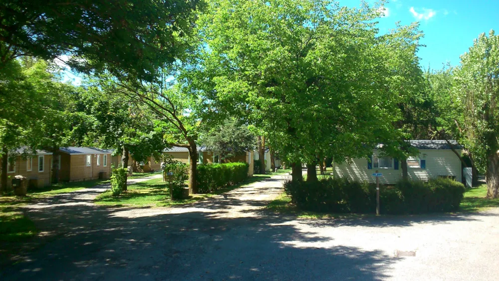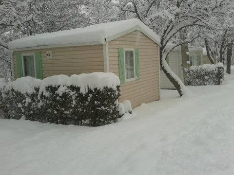 Camping avec piscine, Anémone, mobilhome 16m², situé, en bord de rivière, une chambre indépendante, salle de séjour, cuisine équipée, salle d'eau et WC , terrasse ombragée et salon de jardin, antenne tv.