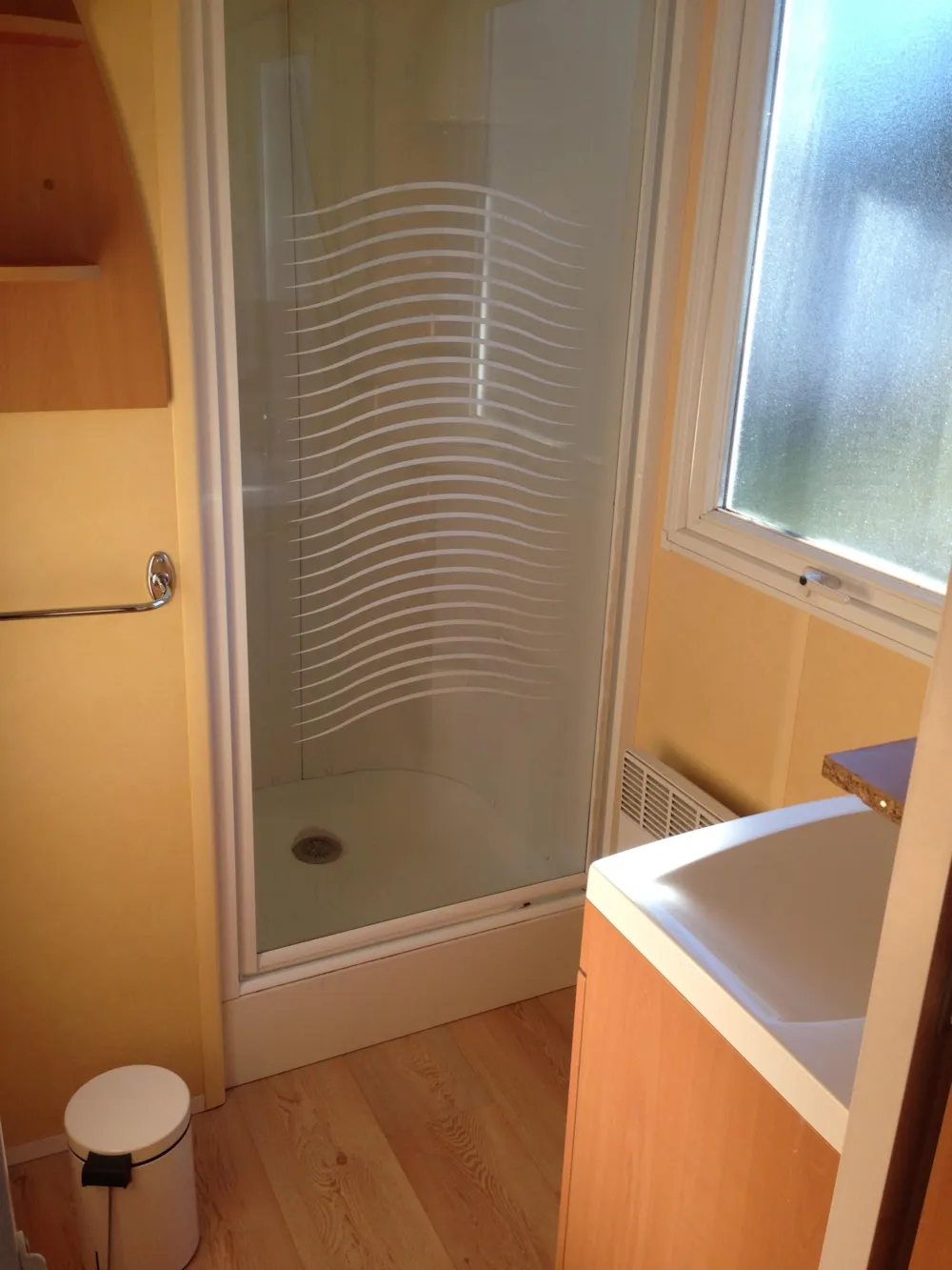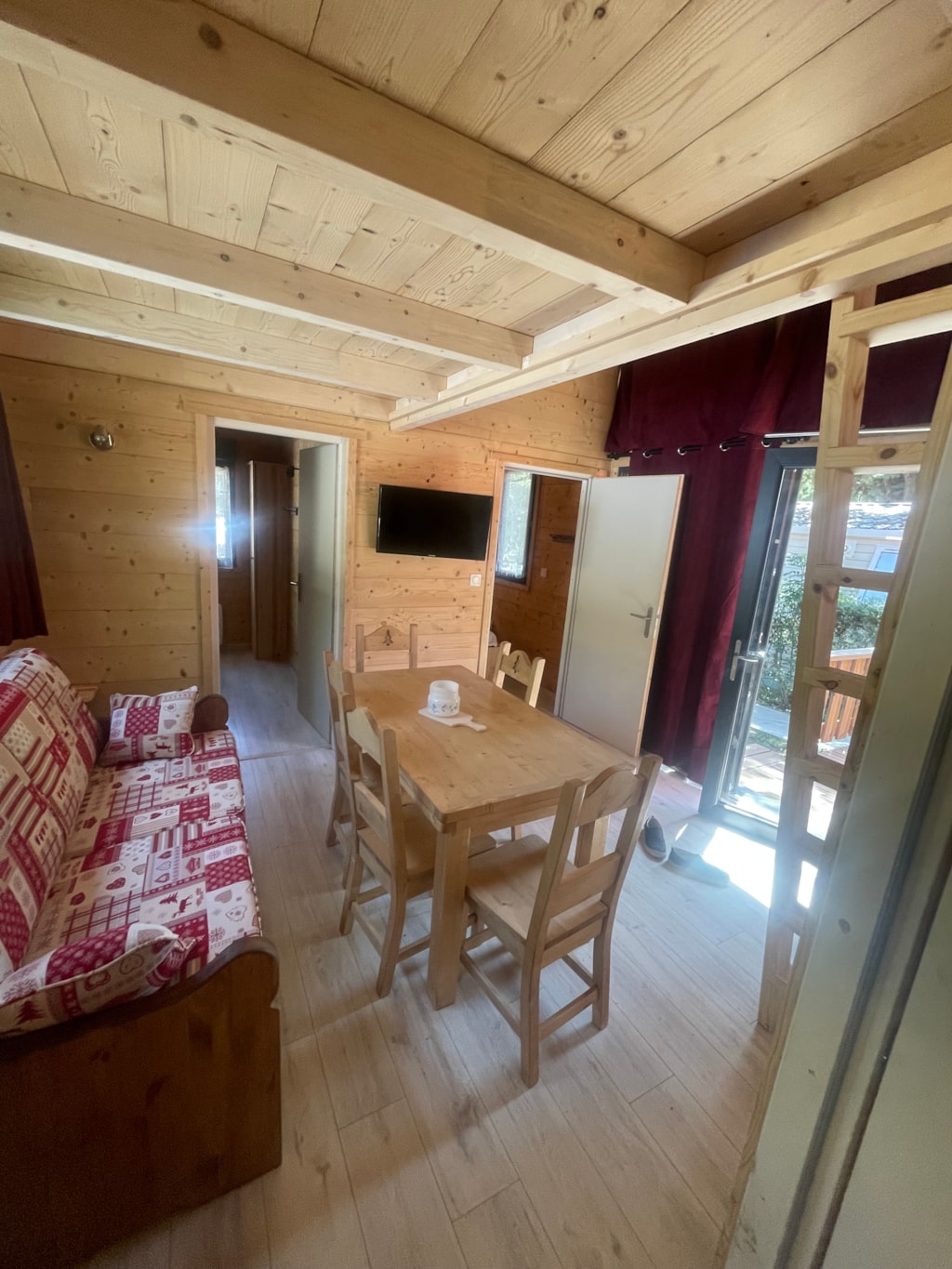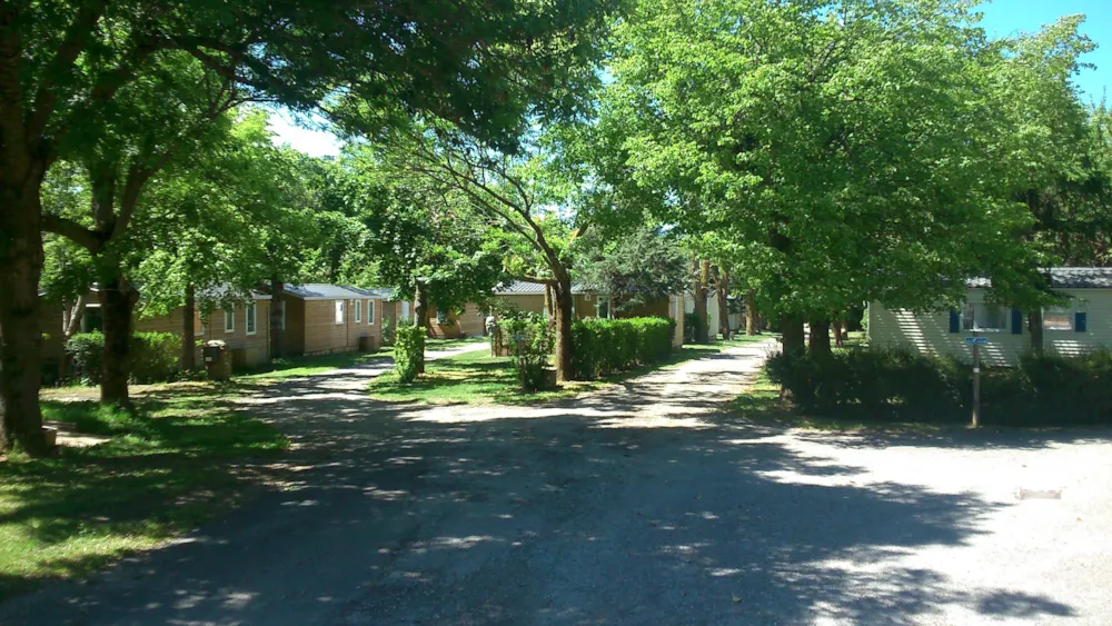Narcisse mobilhome 26m2, deux chambres, cuisine équipée, salle de séjour, salle d'eau avec douche et WC séparés, terrasse ombragée, salon de jardin, store, camping avec piscine et pataugeoire.