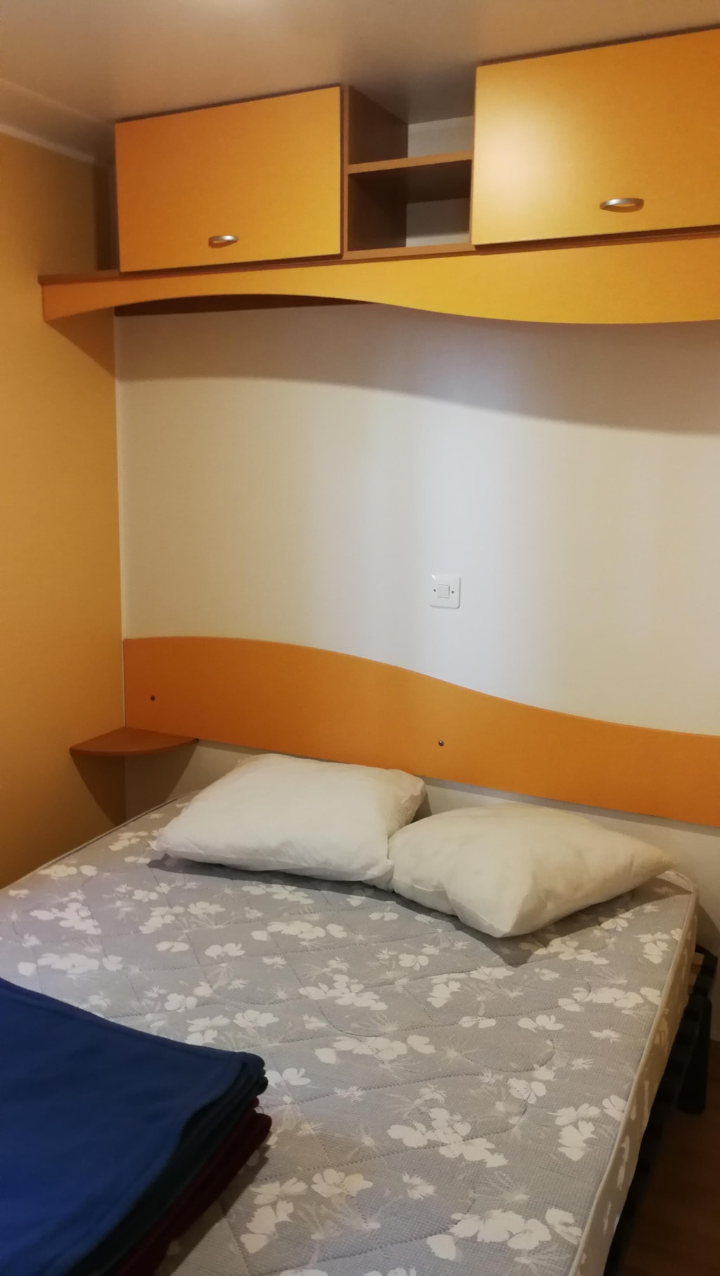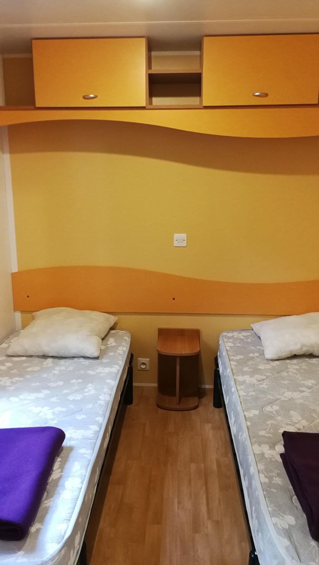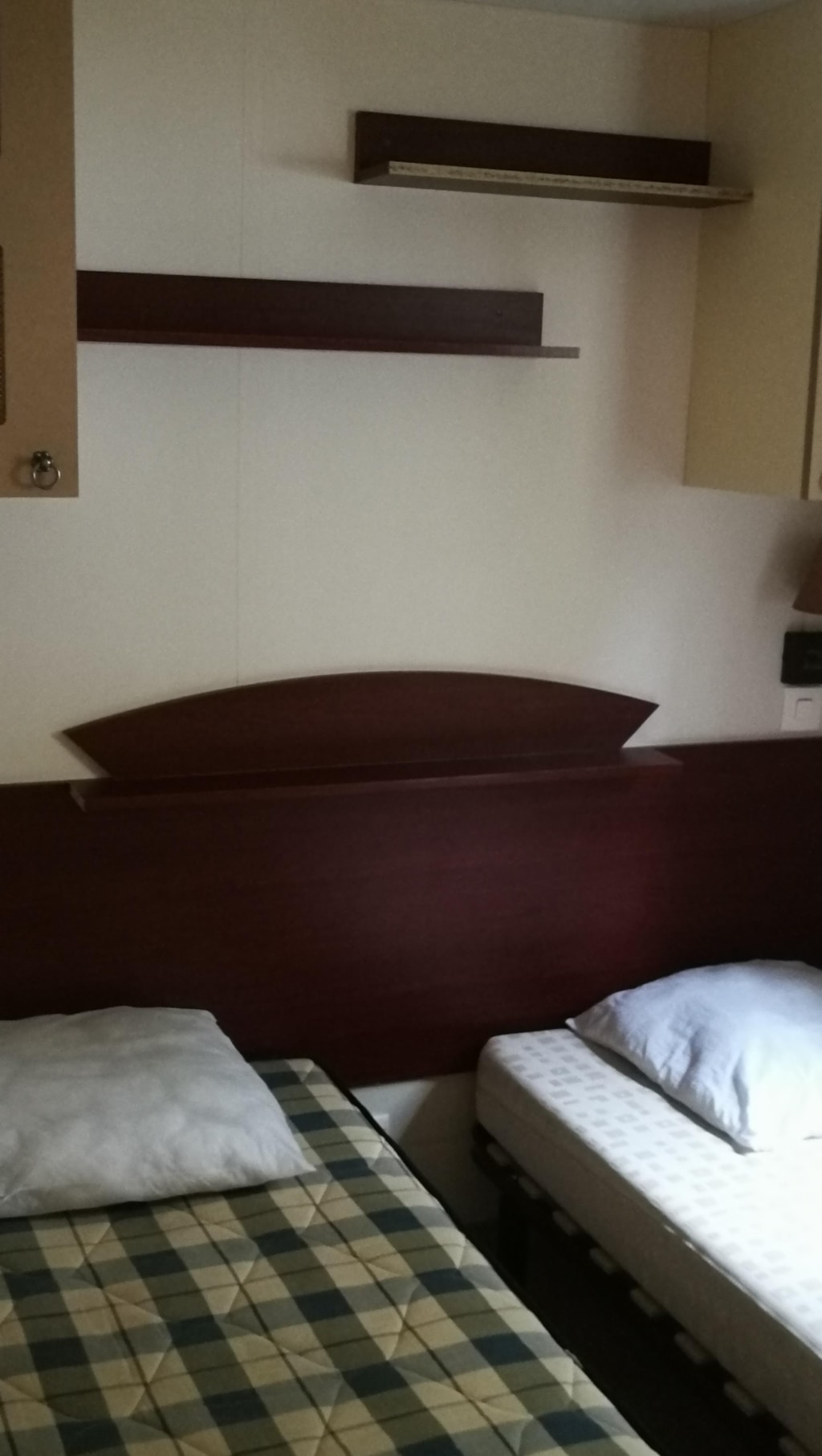 Mobil-home avec deux chambres (1 lit 140 et 2 lits 80), cuisine, salon avec canapé convertible, salle de douche et wc séparés, terrasse avec salon de jardin et parasol, équipé TV, vaisselle, micro onde, cafetière...