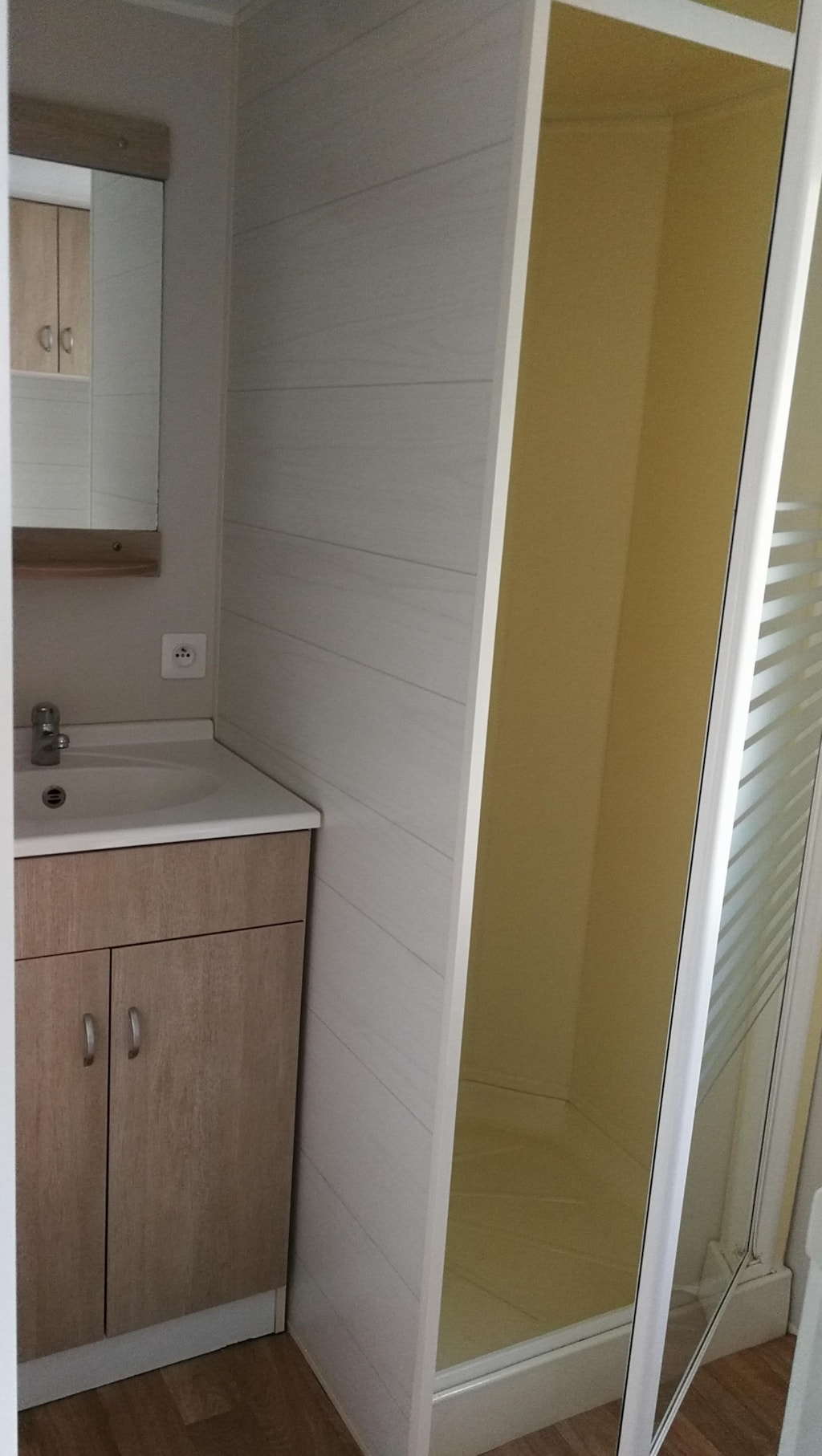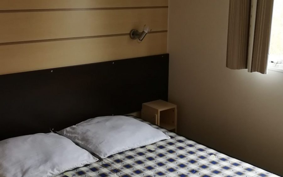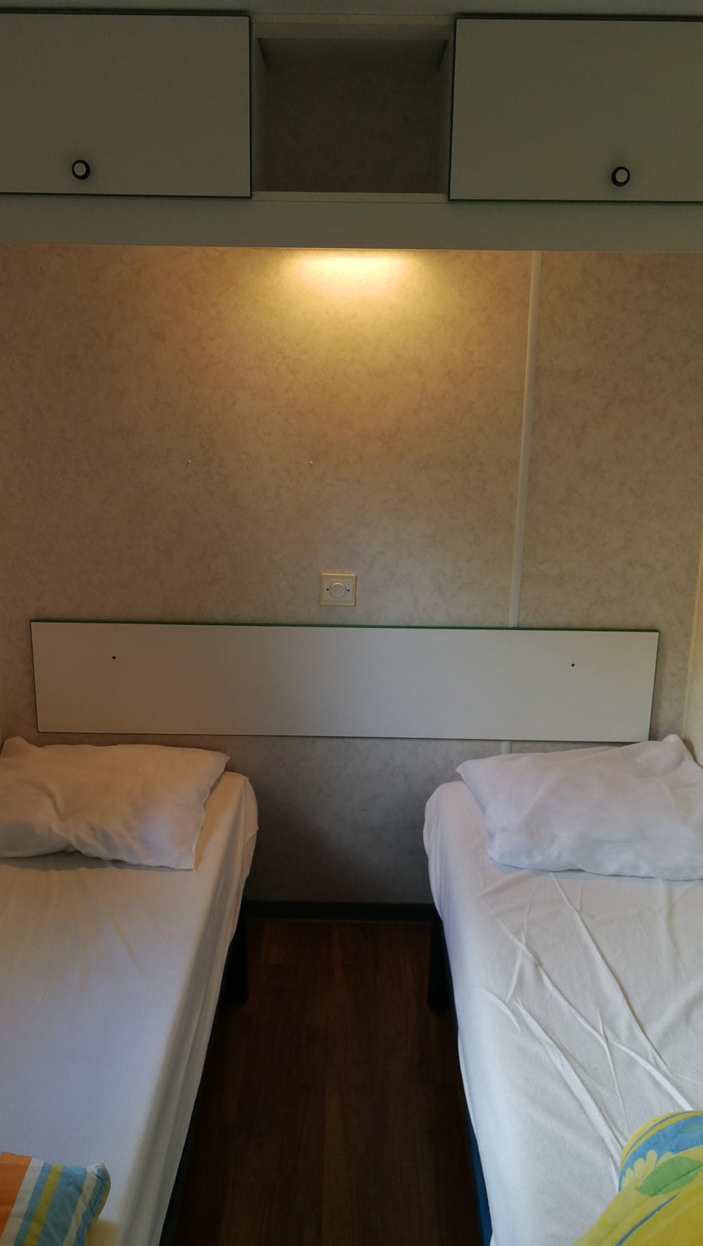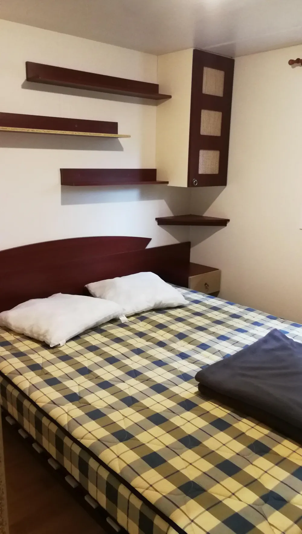 Mobil-home avec deux chambres (1 lit 140 et 2 lits 80), cuisine, salon avec canapé convertible, salle de douche et wc séparés, terrasse avec salon de jardin et parasol, équipé TV, vaisselle, micro onde, cafetière...