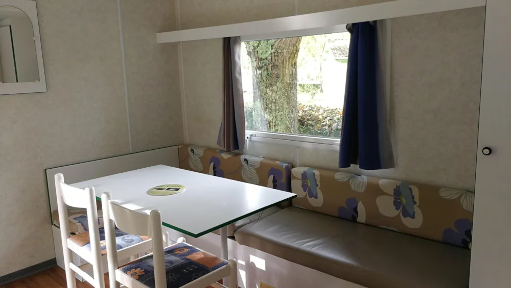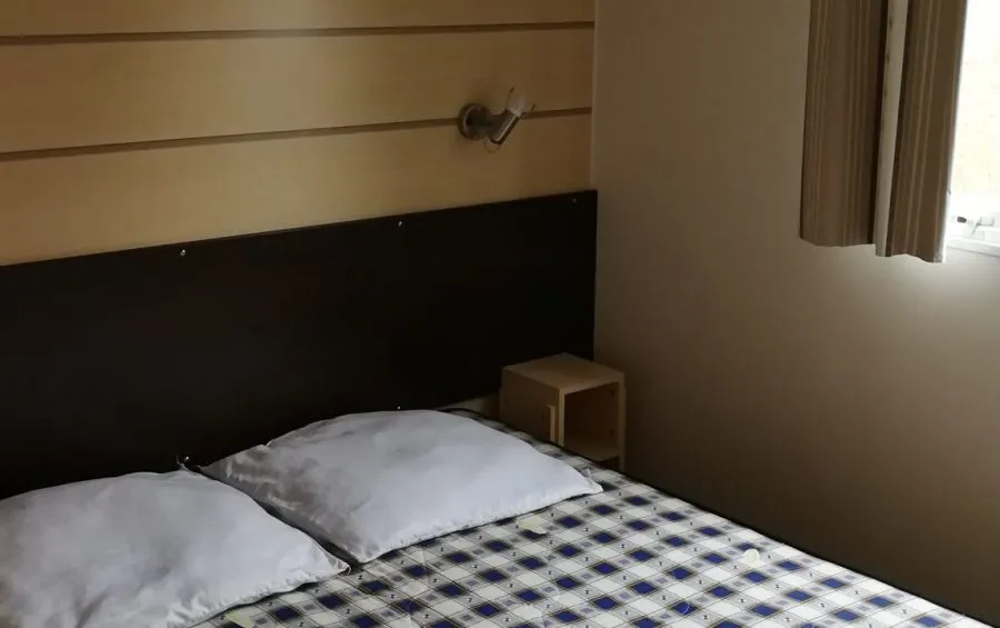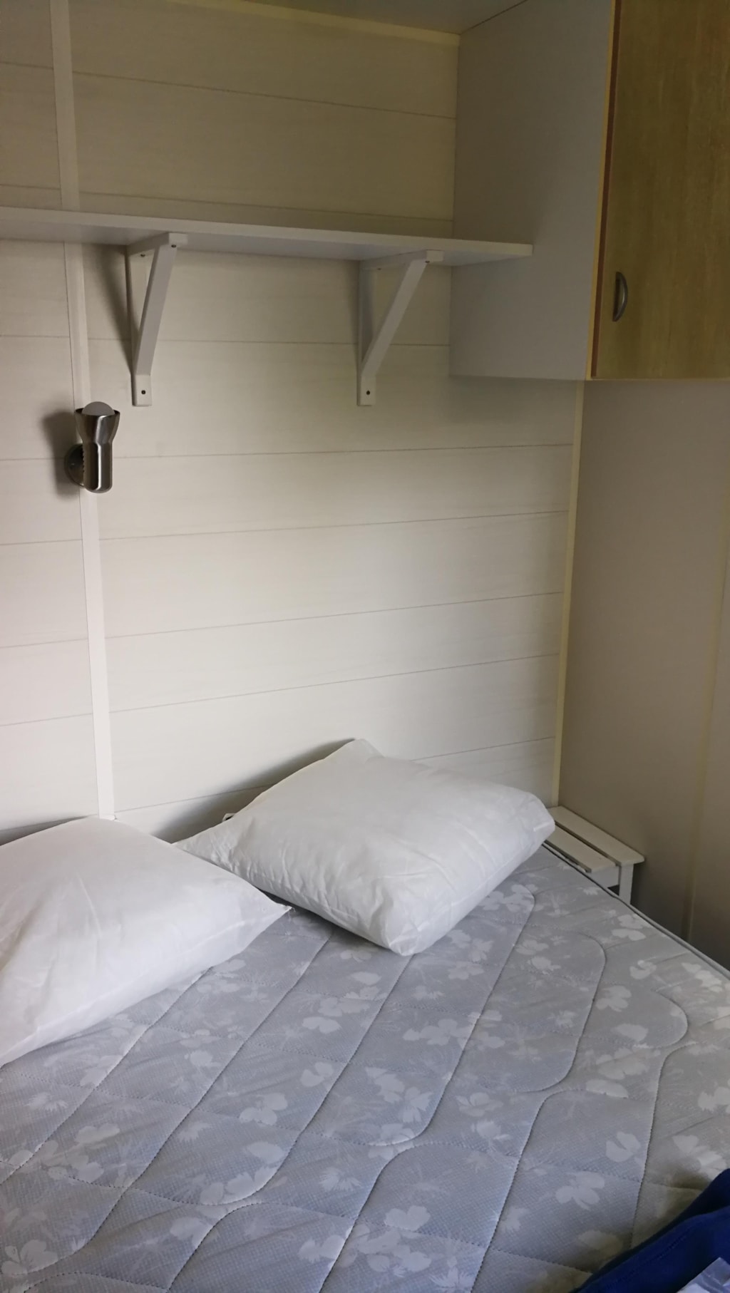 Mobil-home avec une grande chambre parentale (1 lit de 140x190) comprenant un petit lit d'appoint (60x190). Il est équipé d'un coin cuisine dans le séjour avec TV, vaisselle, micro-onde, d'une salle d'eau et d'un wc séparé. Une belle terrasse avec salon de jardin et parasol y est accolé.