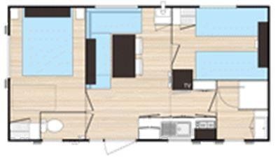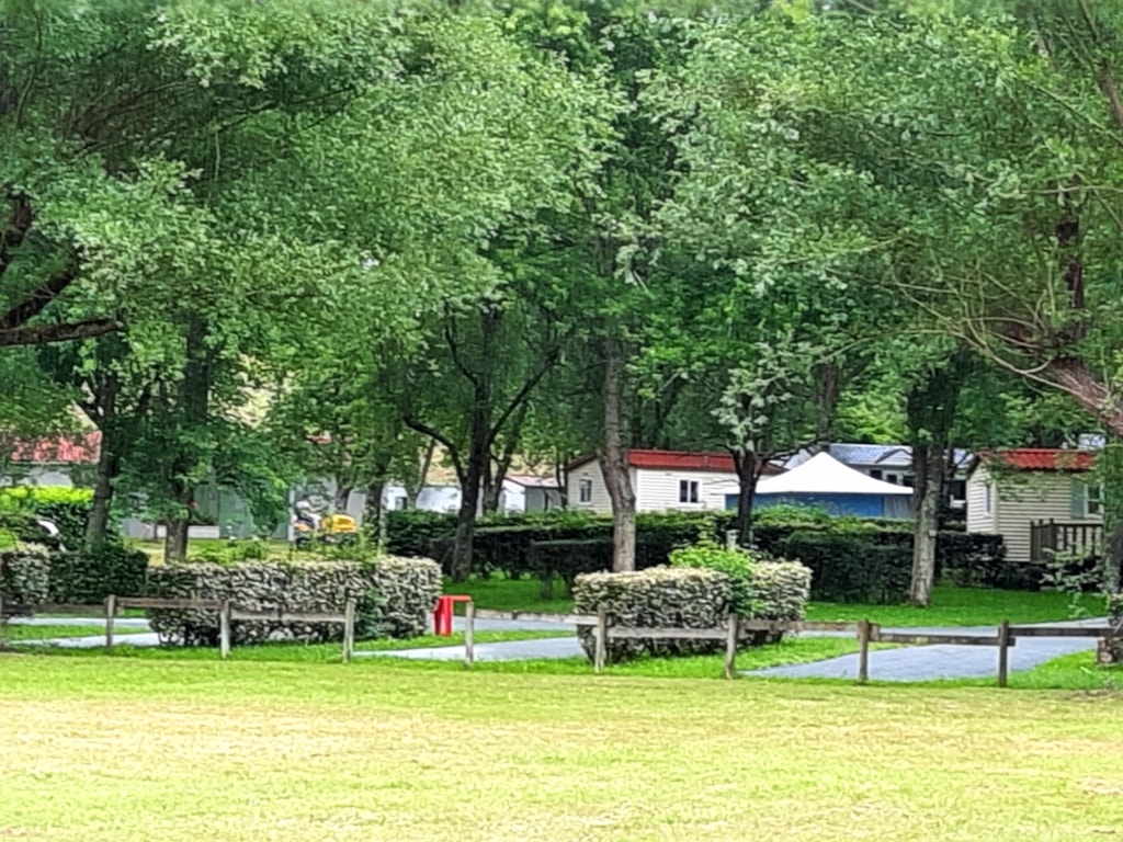 Mobil-home avec trois chambres (1 lit 140 et 4 lits 80), cuisine, salon, WC et salle de bains, terrasse avec salon de jardin parasol, équipé TV, vaisselle, micro onde, cafetière, frigo congélateur...