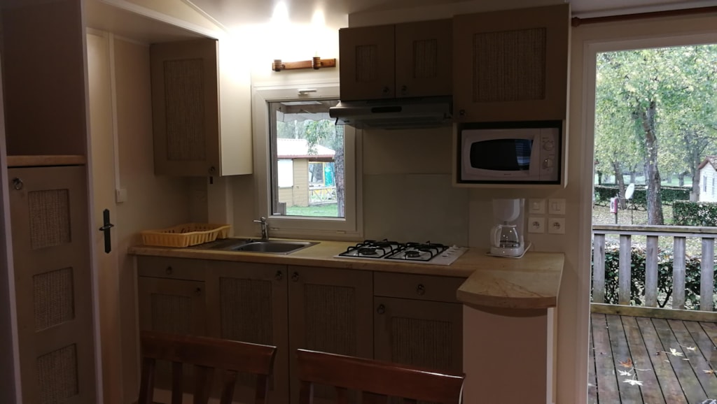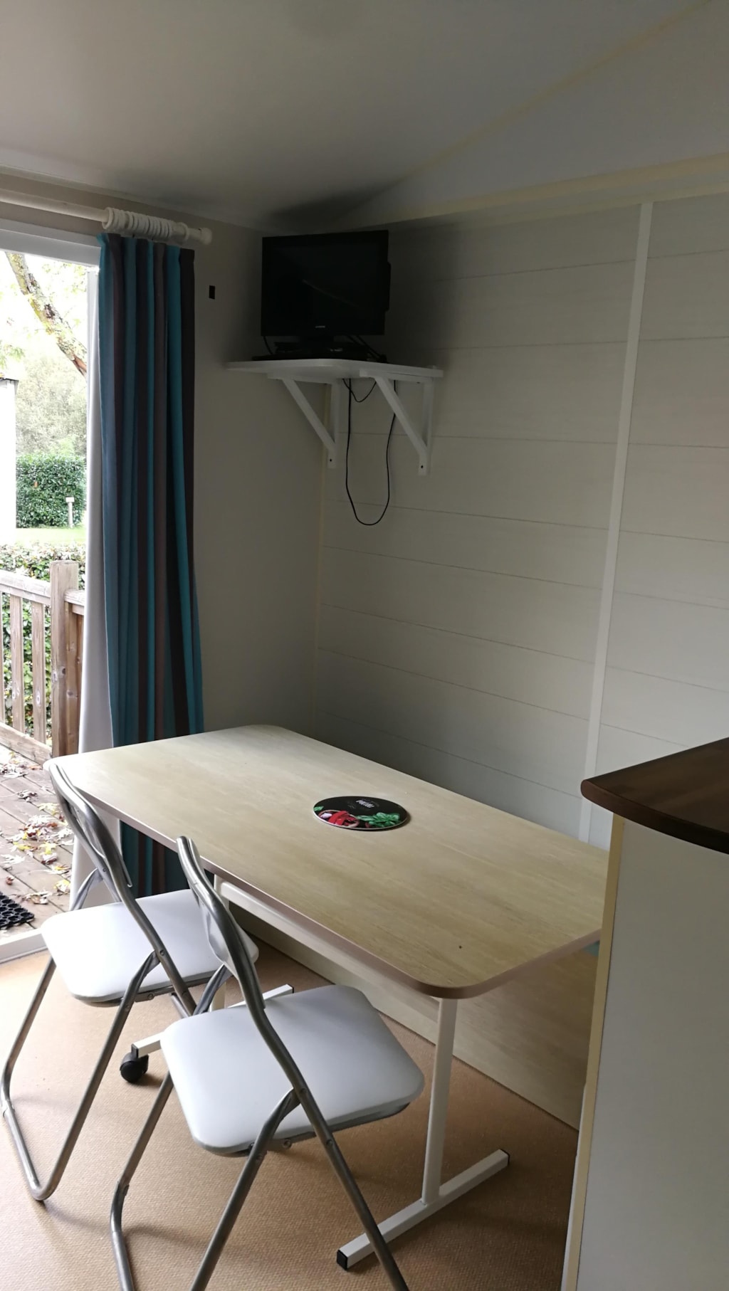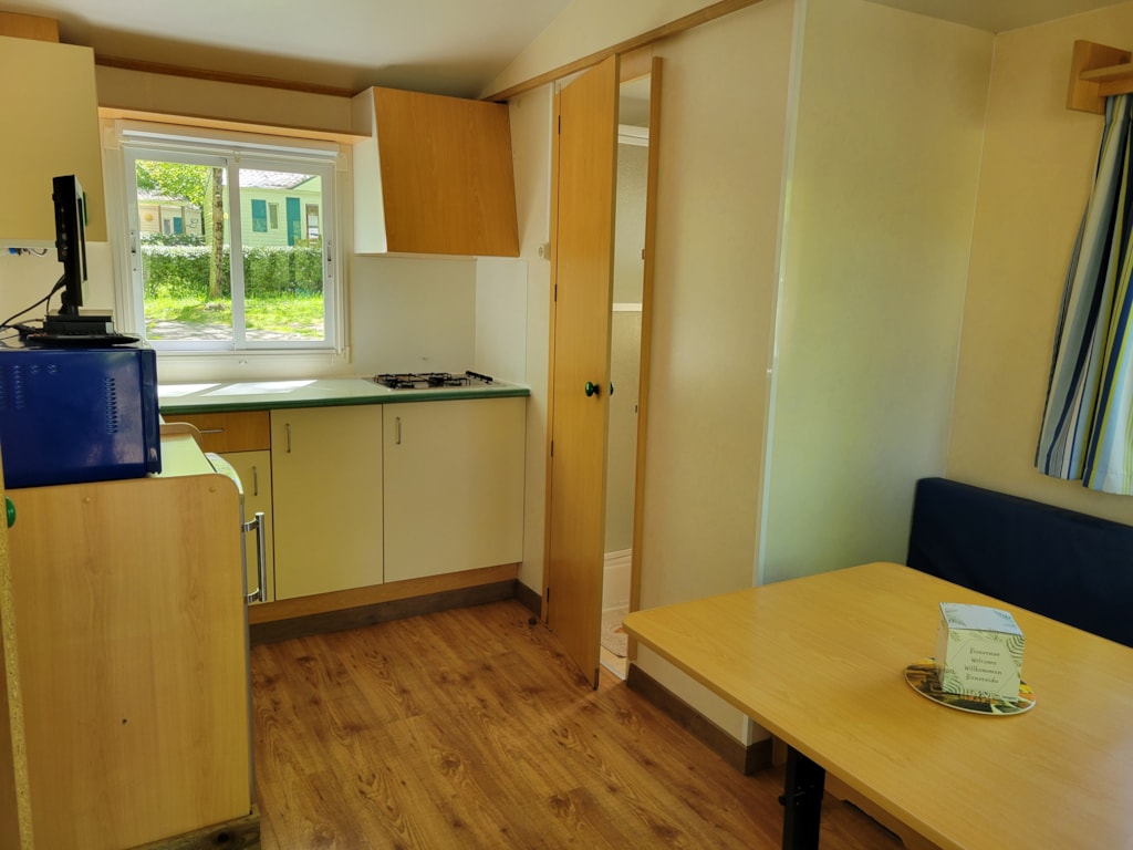 Mobil-home avec deux chambres (1 lit 140 et deux lits 60), cuisine, salon, WC et salle de bains, terrasse avec salon de jardin parasol, équipé TV, vaisselle, micro onde, cafetière...