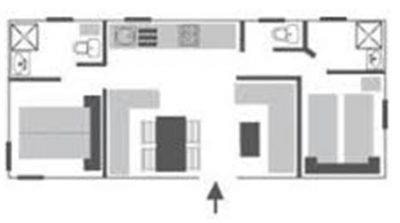 Mobil-home avec deux chambres (1 lit 140 et deux lits 80), cuisine séparée, salon avec canapé convertible, WC et salle de bains, terrasse semi couverte avec salon de jardin et bain de soleil, équipé TV, vaisselle, micro onde, cafetière, four, hotte...
