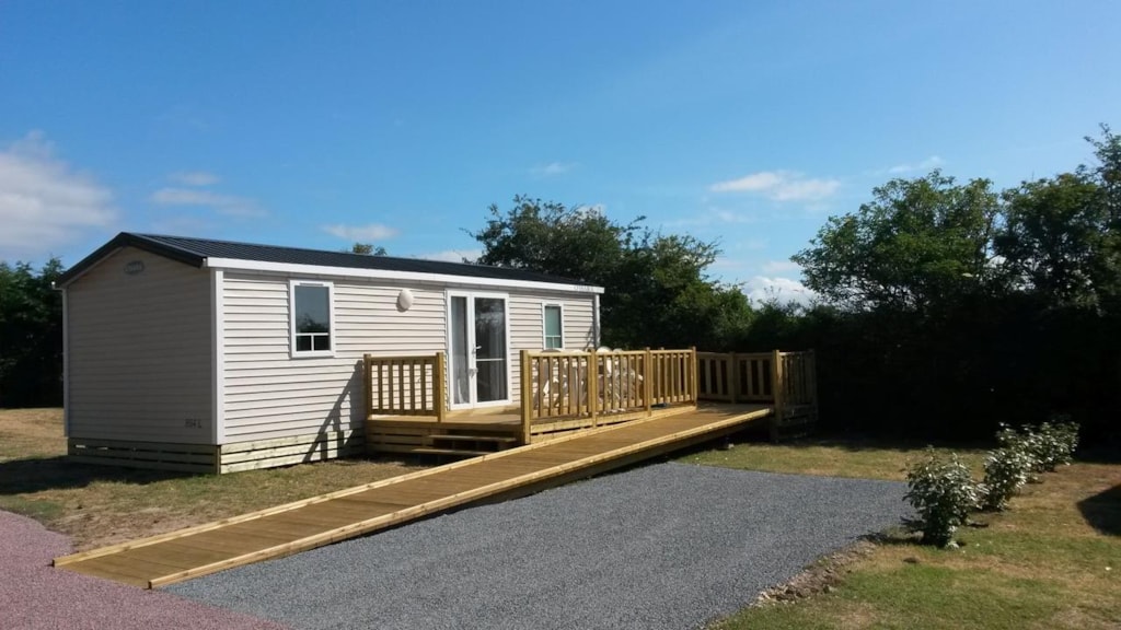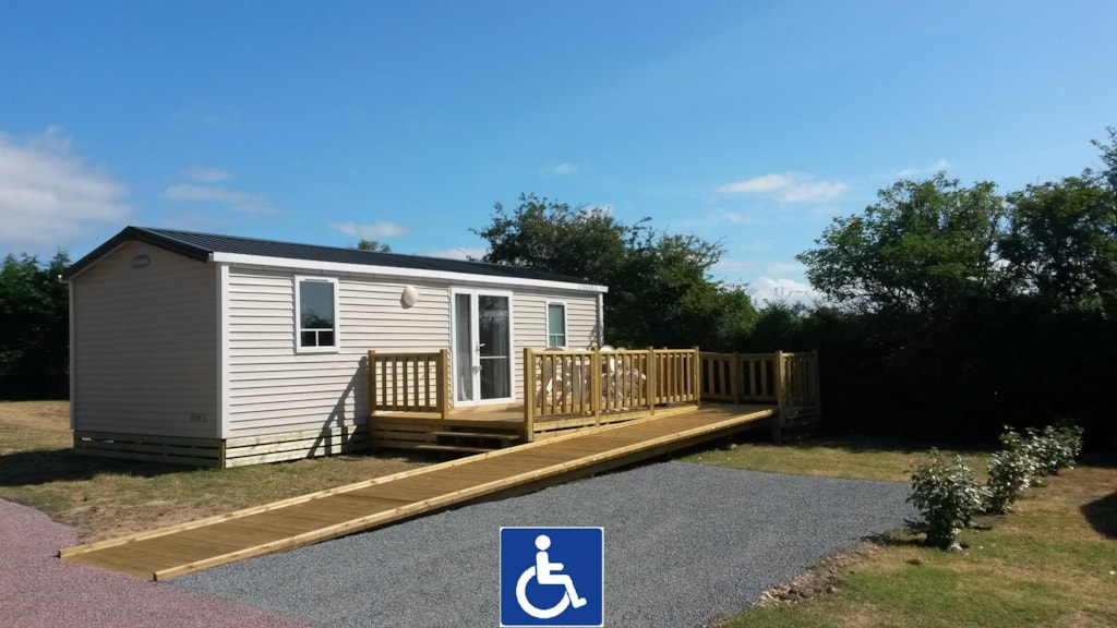 Mobil home pour personnes handicapées ou à mobilité réduite PMR de dernière génération. Il est également possible à la location pour des personnes valides. Hébergement récent (-5ans) et confortable, il est installé sur une parcelle d’environ 120 m² délimitée par une haie avec terrasse surélevée demi-couverte et rampe d'accès PMR. Couverture totale du terrain de camping en wifi.