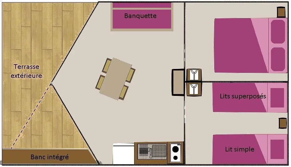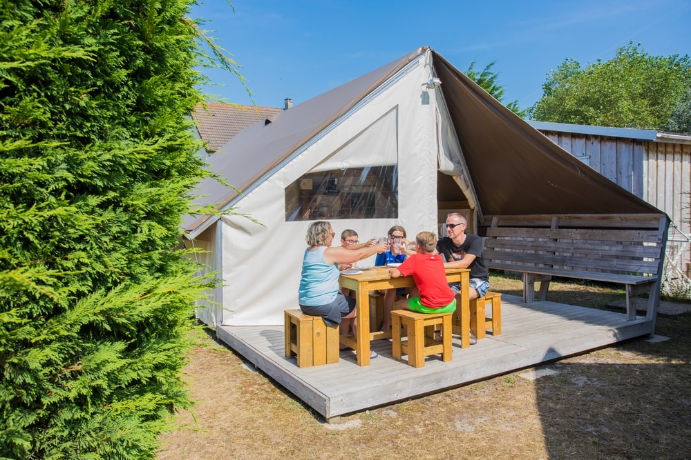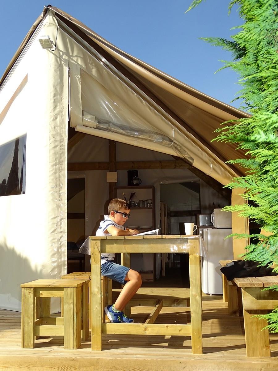 Le Sahari Lodge , l’essence du camping associé au confort ! Avec ses 21m², ce lodge écoresponsable vous fera redécouvrir grâce à son confort, le dépaysement du camping sous tente. Ils sont installés sur des parcelles d’environ 90 m², à proximité du bloc sanitaire, avec une terrasse caillebotis, banc et parasol. Connexion wifi possible avec couverture totale du camping (payant) Equipement intérieur : -Un espace séjour-cuisine avec table, tabourets et banquette, plaque de cuisson, évier avec eau froide, réfrigérateur top, cafetière électrique, micro-onde, batterie de cuisine et de vaisselle. - Une chambre (lit 2 places 140x190cm) + une chambre avec lits superposés (2 lits de 80x190cm) + un lit (80x190cm). Le Sahari Lodge n’est équipés de sanitaires. Max 5 personnes par Sahari Lodge (enfants compris). Les tentes supplémentaires de sont pas acceptées sur l’emplacement. Fournis : couvertures et oreillers – matériel de cuisine et d’entretien. Non fourni : draps/taies, serviettes de toilette, torchons. Prêt de chaise et de lit bébé selon disponibilités. Possibilité de forfait nettoyage en fin de séjourLes animaux ne sont pas admis dans les Sahari Lodges. Hébergement non fumeur. Caution de 500€ demandée à l’arrivée. Restituée si location propre et en parfait état à la fin du séjour. Le Sahari Lodge n’est pas accessible aux personnes à mobilité réduite. HEURE D’ARRIVEE : 16h – HEURE DE DEPART : entre 8h30 et 10h. RETROUVEZ TOUTES LES CONDITIONS SUR LE SITE DANS LES PAGES HEBERGEMENTS ET TARIFS LOCATIONS !