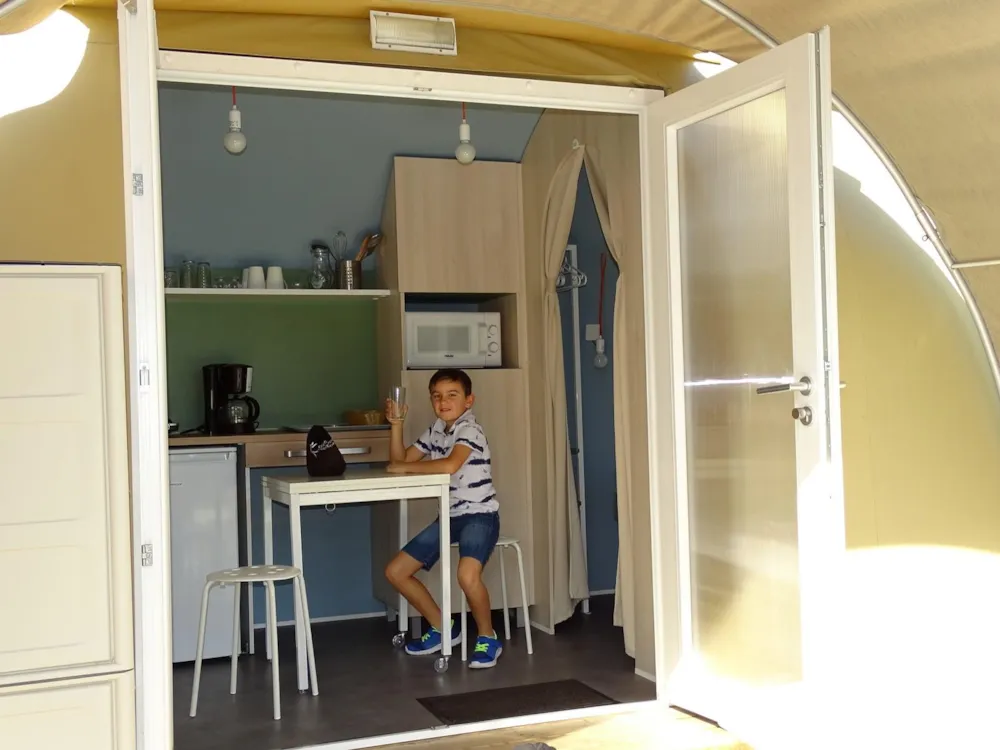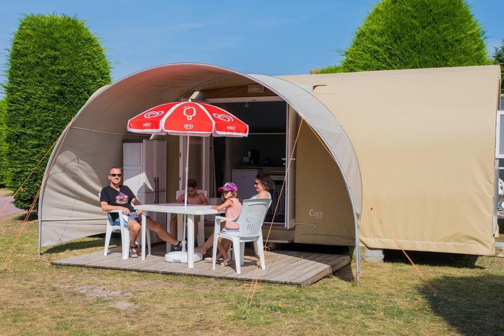 Le Coco Sweet, moitié mobil home, moitié tente, mais totalement insolite ! Avec ses 16 m² pour 4 personnes, ce concept fun est à la fois fonctionnel, cosy, ludique et douillet pour séjourner en camping autrement. Ils sont installés sur des parcelles d’environ 90 m², à proximité du bloc sanitaire, avec une terrasse caillebotis et un salon de jardin avec parasol. Connexion wifi possible avec couverture totale du camping (payant) Equipement intérieur : -Un espace central cuisine avec table escamotable et tabourets, plaque de cuisson, réfrigérateur top, cafetière électrique, micro-onde, batterie de cuisine et de vaisselle. - Une chambre (lit 2 places 140x190cm) avec rangement penderie et un séjour-chambre 2 banquettes-lits simples de 80x190cm avec 2 bacs de rangements. Le Coco Sweet n’est équipé ni d’arrivée d’eau ni de sanitaires. Point d’eau juste à côté. Max 4 personnes par Coco sweet (enfants compris). Les tentes supplémentaires de sont pas acceptées sur l’emplacement. Fournis : couvertures et oreillers – matériel de cuisine et d’entretien. Non fourni : draps/taies, serviettes de toilette, torchons. Prêt de chaise et de lit bébé selon disponibilités. Possibilité de forfait nettoyage en fin de séjour Les animaux ne sont pas admis dans les Coco Sweet. Hébergement non fumeur. Caution de 500€ demandée à l’arrivée. Restituée si location propre et en parfait état à la fin du séjour. Le Coco sweet n’est pas accessible aux personnes à mobilité réduite. HEURE D’ARRIVEE : 16h – HEURE DE DEPART : entre 8h30 et 10h. RETROUVEZ TOUTES LES CONDITIONS SUR LE SITE DANS LES PAGES HEBERGEMENTS ET TARIFS LOCATIONS !