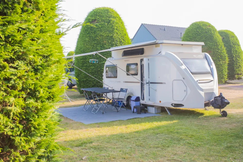 Emplacement de camping avec électricité de 10 ampères comprise. Nos emplacements de camping sont herbeux et délimités par des cyprès qui vous procureront un ombrage partiel tout au long de la journée. Spacieux avec environ 90 m² de surface et offrant tous le branchement en électricité, vous pourrez aisément y installer l’ensemble de votre matériel et profiter des vacances dans votre tente, caravane ou camping-car. Le bloc sanitaire, confortable, est équipé de cabines individuelles, de cabine bébé, d’eau chaude à tous les postes et à volonté, de lave-linge et sèche-linge. La couverture totale du terrain de camping en wifi vous permettra de rester facilement connectés avec vos amis depuis votre emplacement et en tout point du terrain de camping.