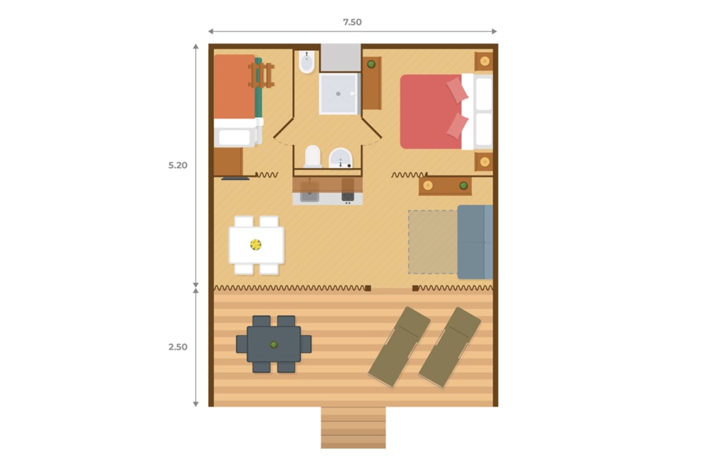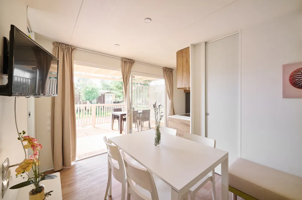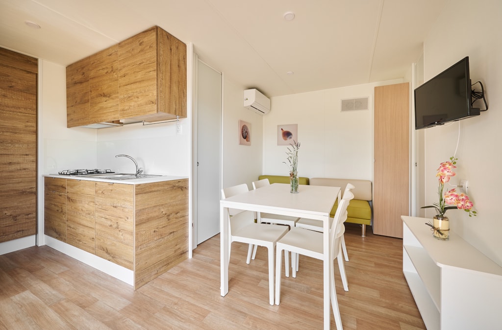 Maya ist das Mobilheim, das sich durch die Raffinesse der Ausstattung und ein warmes, einladendes Design auszeichnet und einen komfortablen, erholsamen Aufenthalt bietet. Es ist mit Klimaanlage, TV und elektronischem Safe ausgestattet, um Ihnen alle Annehmlichkeiten Ihres Urlaubs zu garantieren.