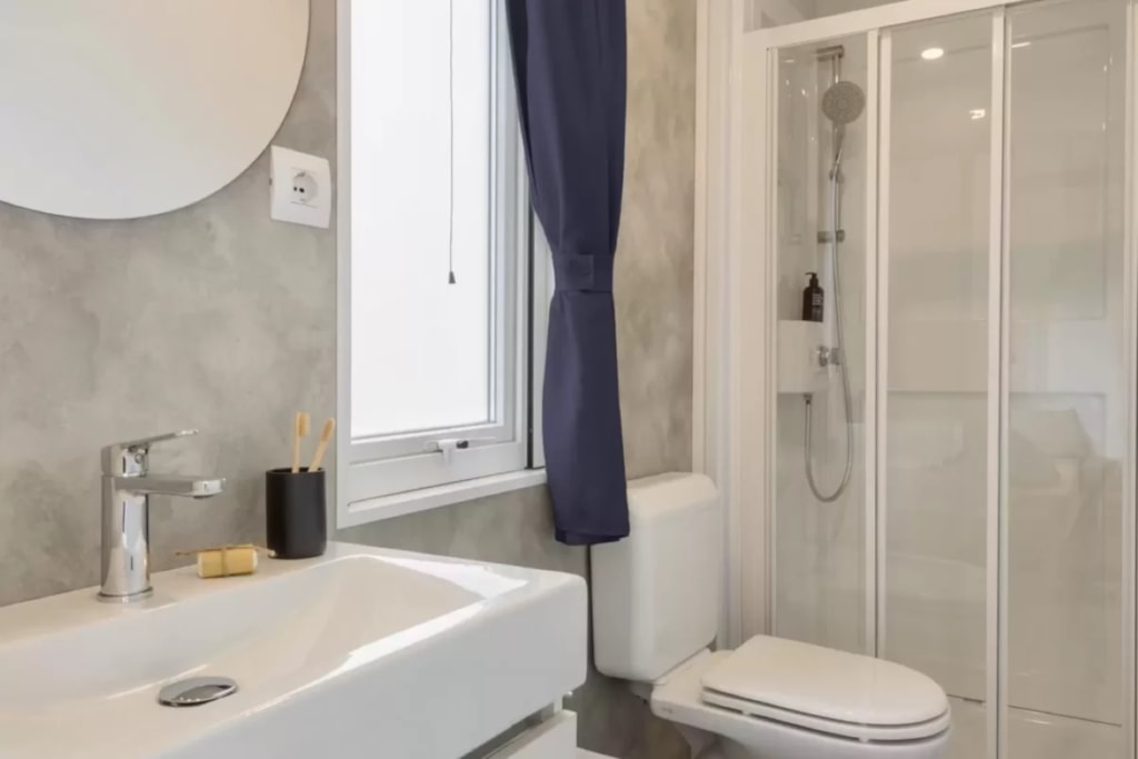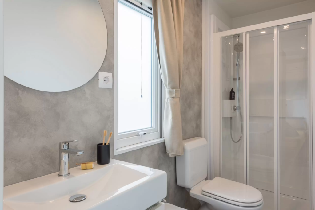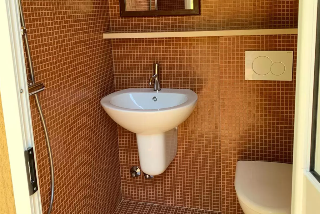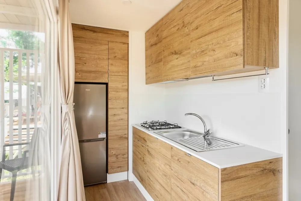 Im Inneren finden Sie eine praktische Küchenzeile mit Mikrowelle und Kühlschrank mit Doppeltür, während das Badezimmer volle Funktionalität und Komfort bietet.
