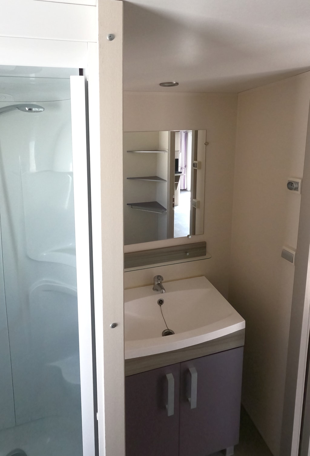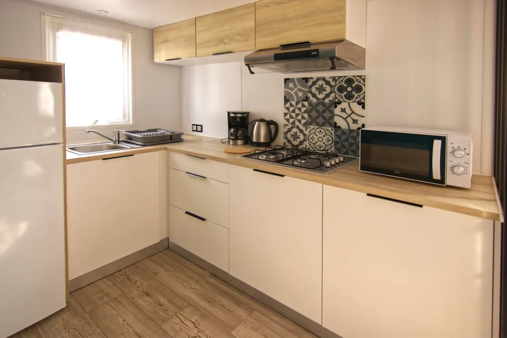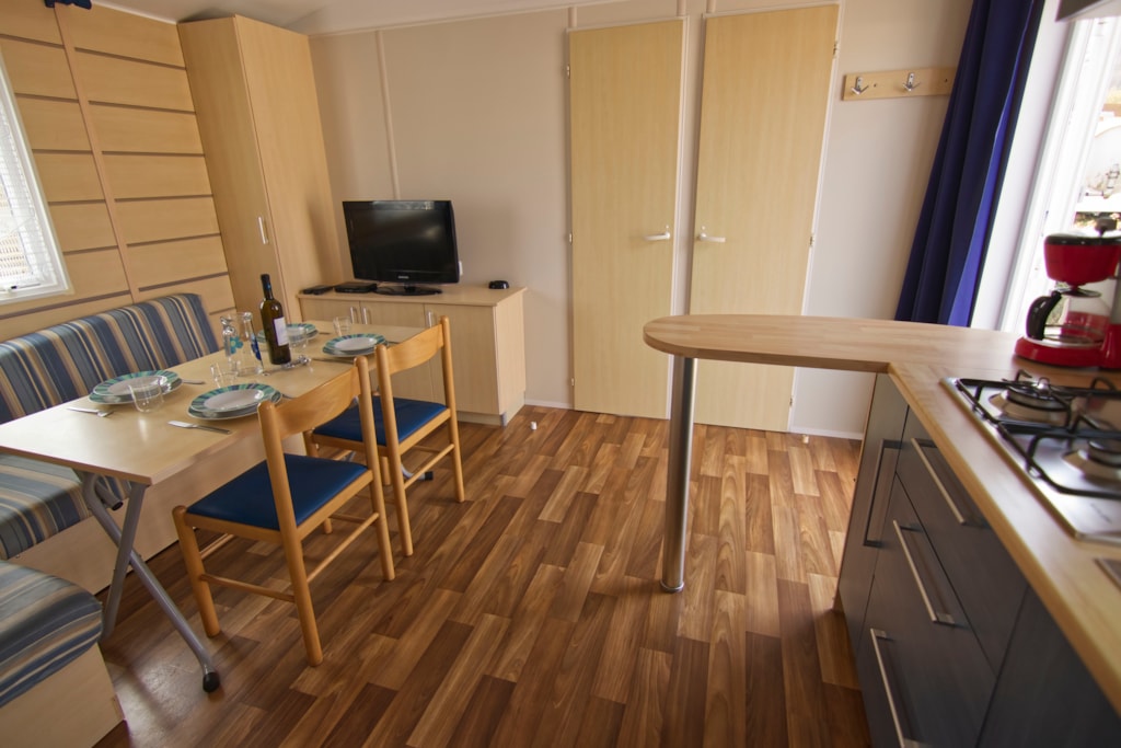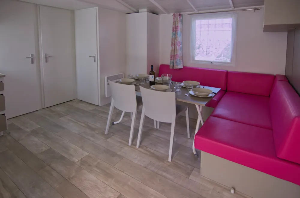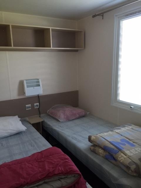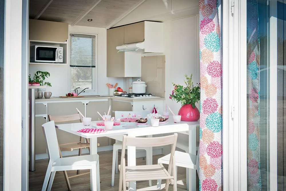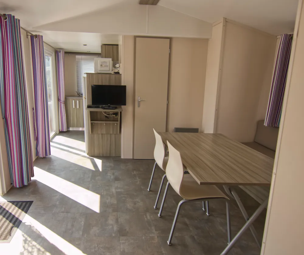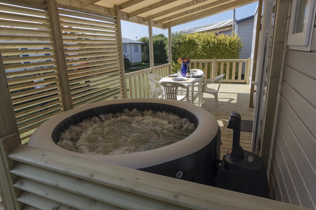 Mobil-home, 2 chambres, 30 m2, conçu pour rendre vos vacances plus confortables. Terrasse couverte, salon de jardin, une grande salle de bain, WC separé. Cuisine tout equipée, micro-onde, cafetière et lave-vaisselle. Télévision. Chauffage dans toutes les chambres. WiFi Gratuit, SPA PRIVATIFS COUVERTE !
