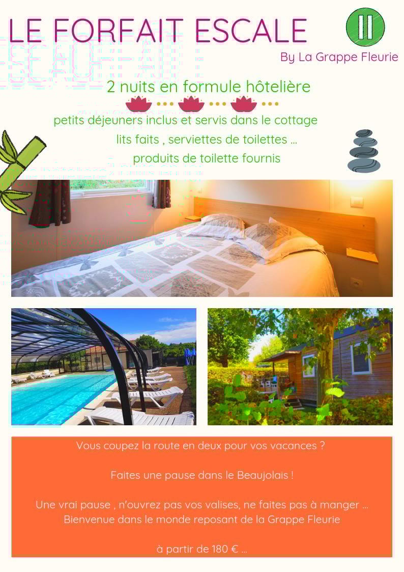 Sie teilen die Straße in zwei für Ihren Urlaub? Machen Sie eine Pause im La Grappe Fleurie im Hotelservice! Öffnen Sie nicht Ihr Gepäck, sorgen Sie sich nicht um das Frühstück! Gönnen Sie sich eine echte Pause! Dieses Paket beinhaltet 2 Übernachtungen in 2 oder 3 Schlafzimmern (je nach Familienzusammensetzung) für 2 bis 6 Personen mit Bett (en) bei Ankunft gemacht + Handtücher + Pflegeset + Frühstück + kostenlose Endreinigung. Die Unterkunft wird je nach Familienzusammensetzung und Verfügbarkeit angeboten.