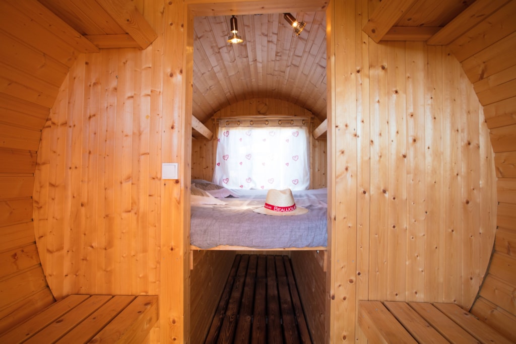 1 Zimmer in Form eines Fasses (ohne Sanitäranlagen und ohne Wasser) für 2 Personen. Zugang zu den Gemeinschaftssanitäranlagen.