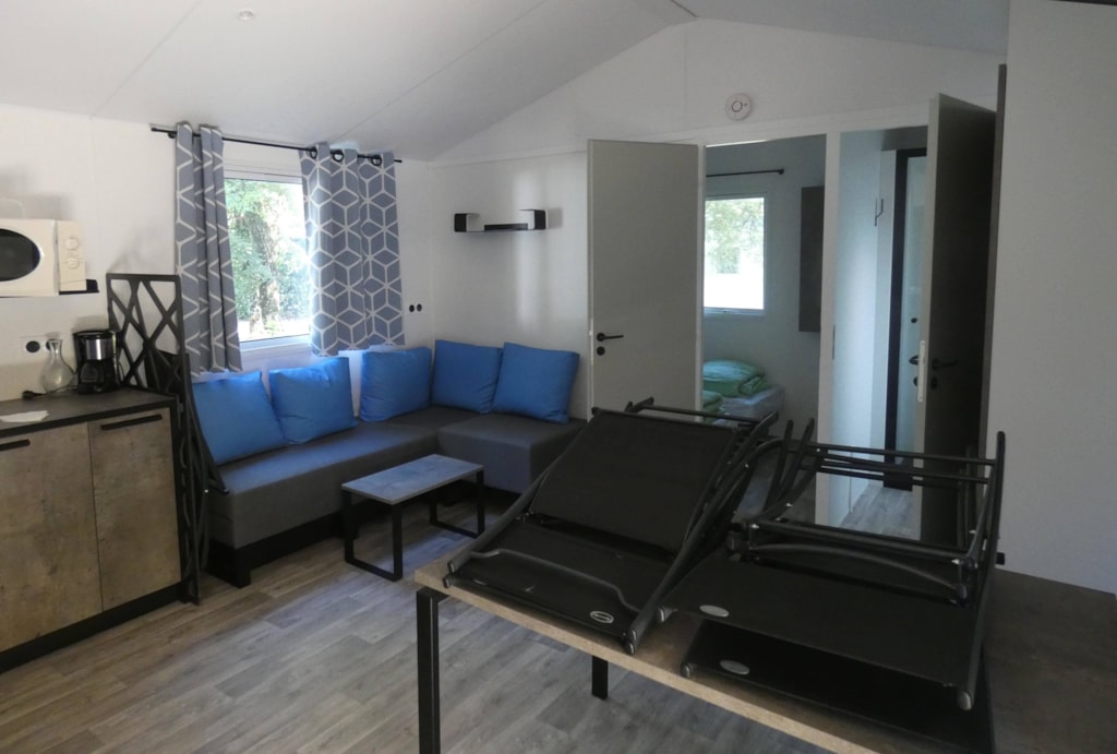 Das Mobilheim FIDJI ist ein geräumiges und modernes Mobilheim. Wohnzimmer, 2 Schlafzimmer, Küche. Offene Terrasse im Freien.