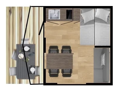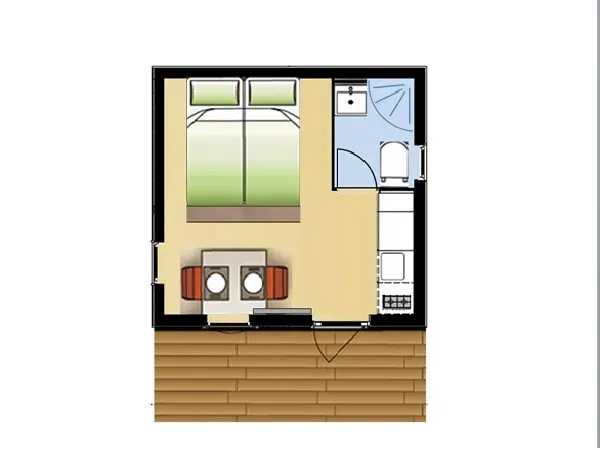 Ein funktionales und einfaches Familienzimmer, das sich ideal für eine kurze Übernachtung auf der Durchreise eignet. Hier bekommst du die entspannte Atmosphäre des Campingplatzes kombiniert mit einem festen Schlafplatz für die ganze Familie. Das Zimmer ist mit 4 Etagenbetten ausgestattet und bietet Platz für bis zu 4 Personen. Die Etagenbetten verfügen über Leitern und sind sowohl für Kinder als auch für Erwachsene leicht zu nutzen. Die Einrichtung kann von Zimmer zu Zimmer variieren, gemeinsam ist jedoch die einfache und praktische Lösung.