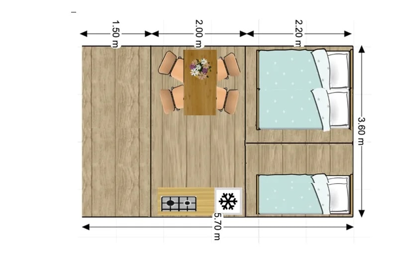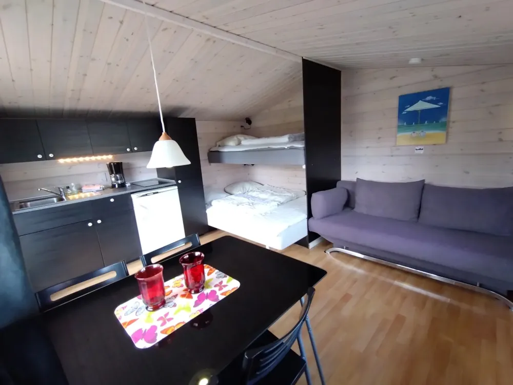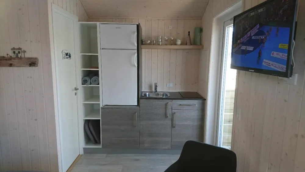 Eine klassische Campinghütte, bei der Einfachheit und Gemütlichkeit im Mittelpunkt stehen. Hier bekommst du ein authentisches Campingerlebnis mit der Möglichkeit, dich in deine eigenen vier Wände zurückzuziehen. Die Hütte ist 16 m² groß und besteht aus einem Raum mit insgesamt 4 Schlafplätzen, verteilt auf ein 3/4-Bett mit Etagenbett darüber sowie ein Schlafsofa. Die Hütten wurden 2015/2016 mit neuen Betten, Wänden, Decken, Isolierung und Küche renoviert und bieten dir eine gute und funktionale Basis während deines Aufenthalts. Die Küche ermöglicht die einfache Zubereitung kleiner Mahlzeiten.