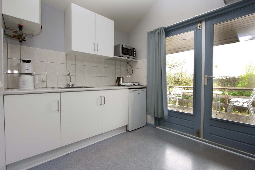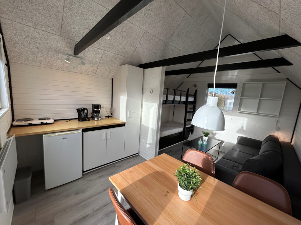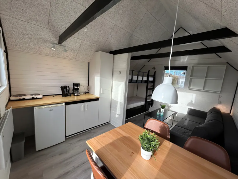 Jede Hütte ist 12 m² groß und für zwei Personen eingerichtet. Es gibt eine funktionale Kochnische mit Kochplatten, Kühlschrank, Kaffeemaschine, Geschirr und Kochutensilien – ideal, um deine Mahlzeiten selbst zuzubereiten. Im Inneren steht ein Esstisch, und auf der kleinen Terrasse mit Gartenmöbeln kannst du morgens die Sonne und deinen Kaffee genießen.
