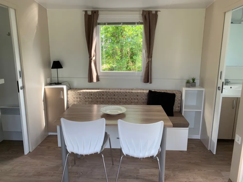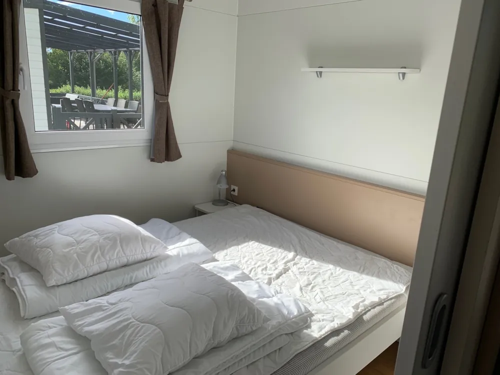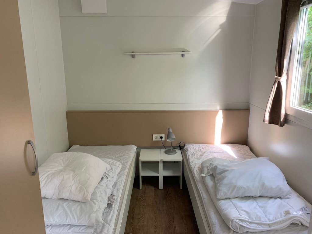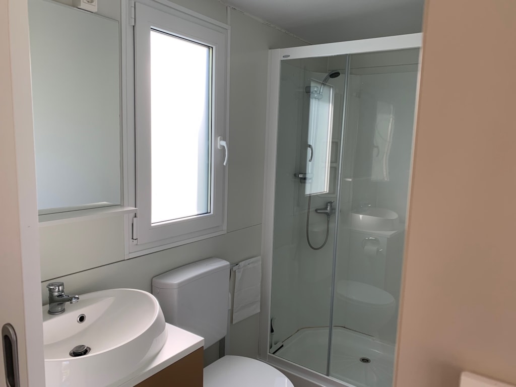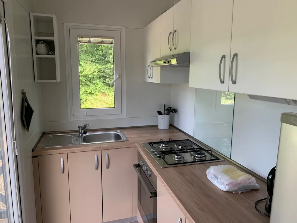 Das Mobilheim bietet Platz für bis zu 6 Personen und verfügt über ein eigenes Bad mit Toilette und Dusche. Die gut ausgestattete Küche hat einen Gasherd mit Backofen, einen großen Kühl-/Gefrierschrank, Kaffeemaschine, Wasserkocher, Geschirr und Kochutensilien – so kannst du problemlos Mahlzeiten für die ganze Familie zubereiten.
