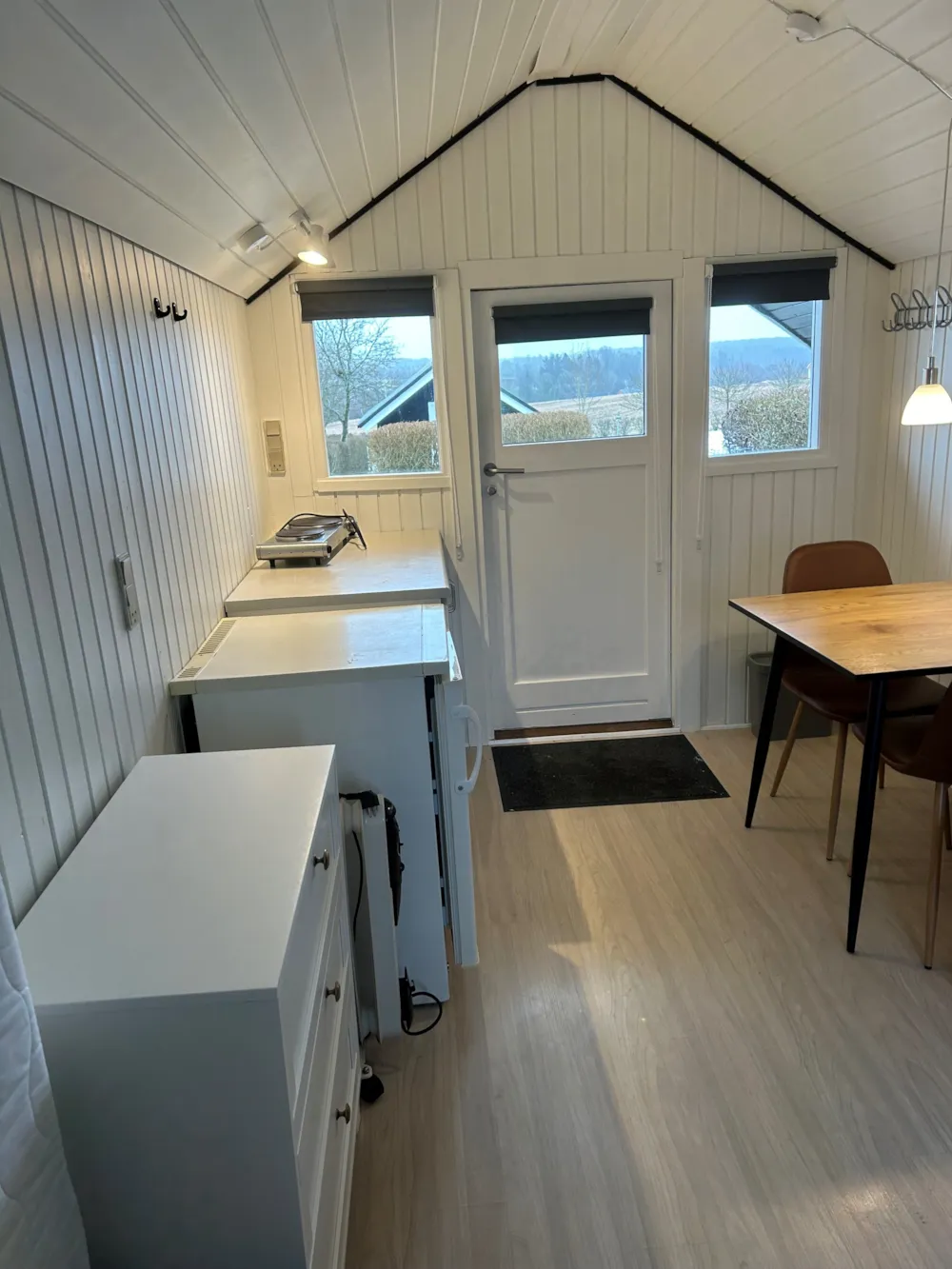 Die Hütte ist 8 m² groß und schlicht mit dem Nötigsten eingerichtet. Es gibt eine kleine Küchenzeile mit Kochplatte, Kühlschrank, Kaffeemaschine, Geschirr und Kochutensilien – perfekt für den Morgenkaffee oder eine einfache Ferienmahlzeit. Im Wohnbereich steht ein Esstisch mit Platz für zwei Personen. Draußen erwartet dich eine kleine Terrasse mit Gartenmöbeln, auf der du Sonne und Ruhe genießen kannst.