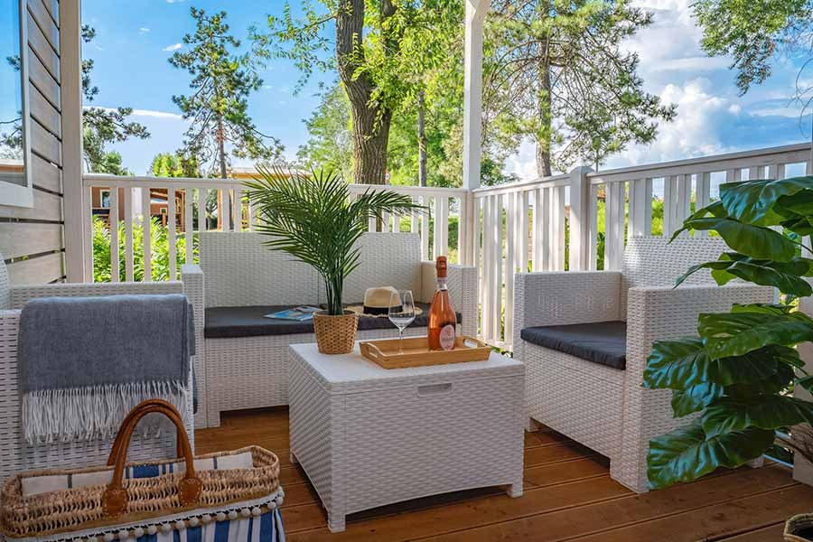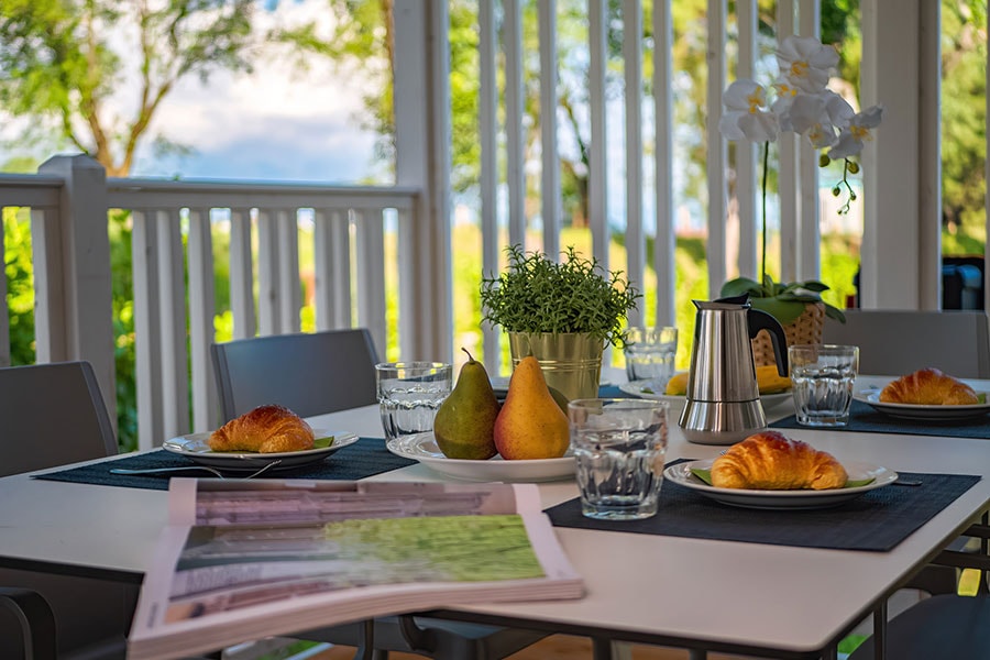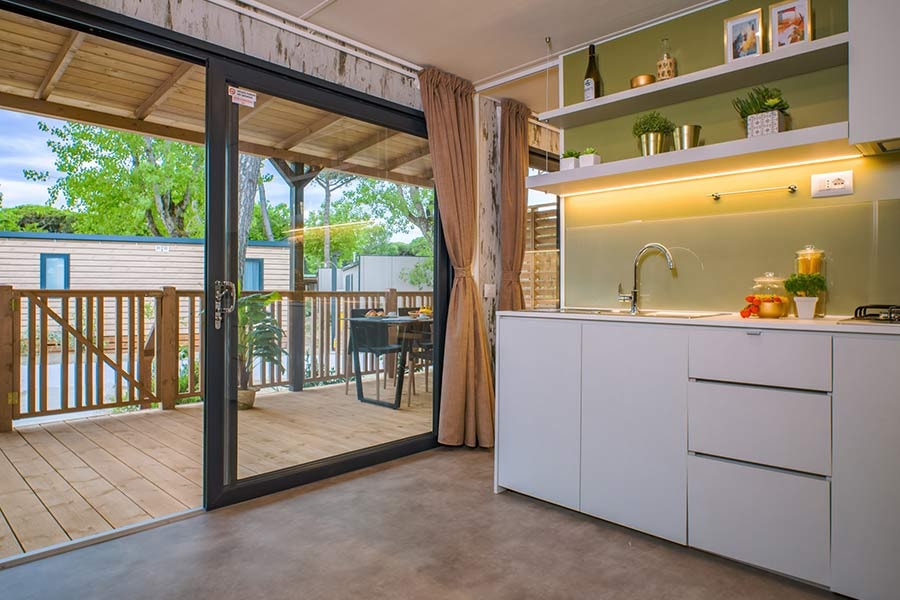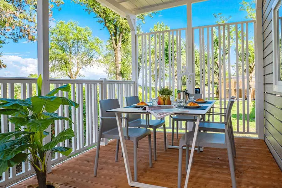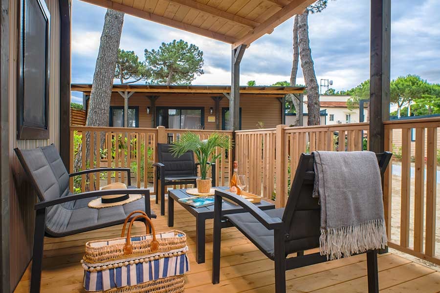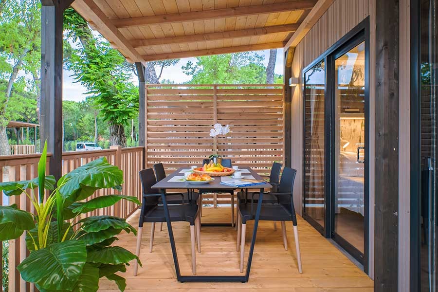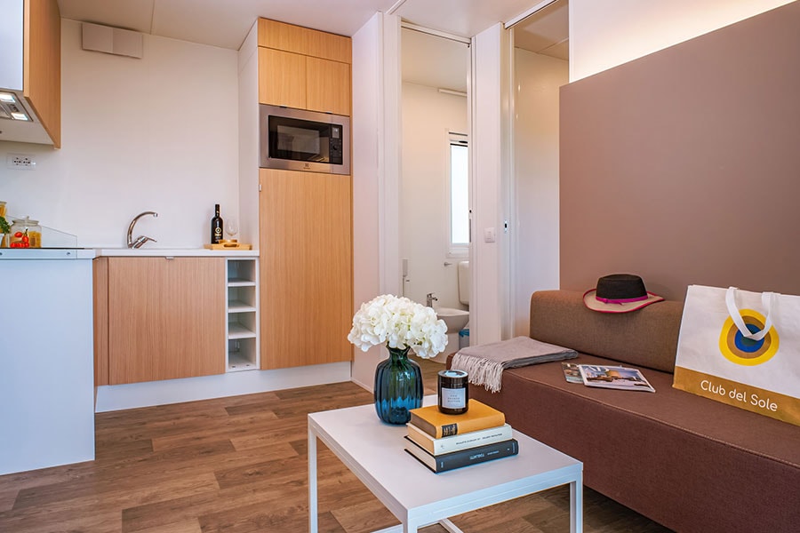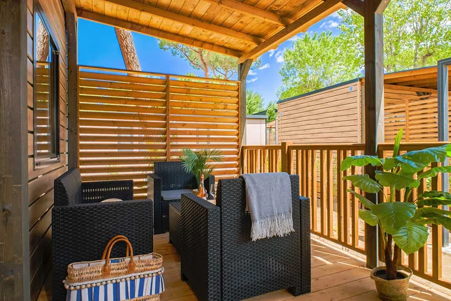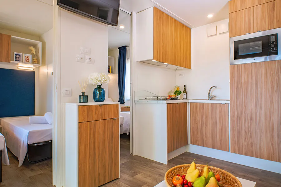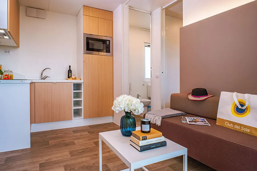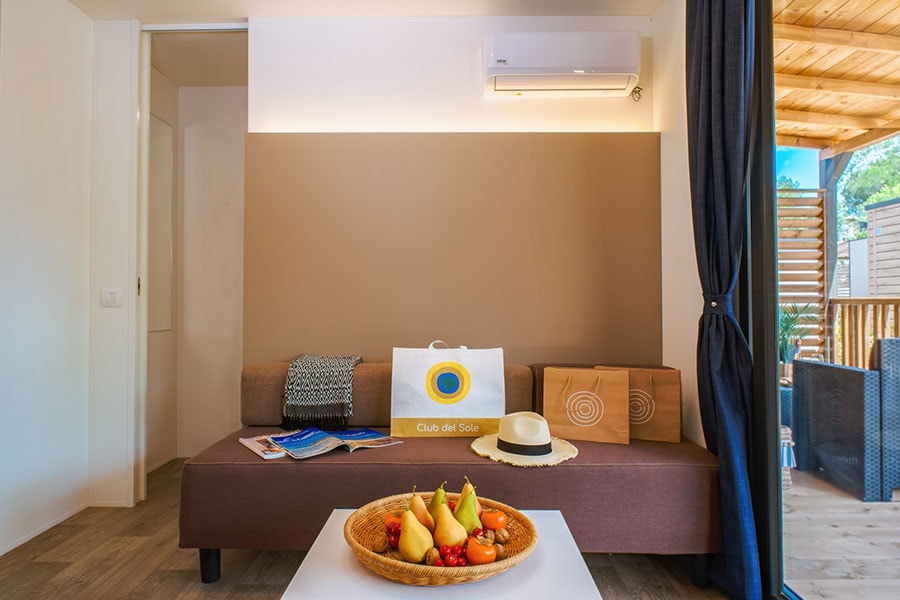 Tiere nicht erlaubt. Größe 34sqm. Veranda 21qm, 1 Doppelschlafzimmer mit TV, 1 Schlafzimmer mit 1 Etagenbett und 1 Ausziehbett, Wohnzimmer mit Sofa. Kochnische mit Geschirrspüler, Herd, Kühlschrank, Mikrowelle, TV im Wohnzimmer, Klimaanlage/Heizung. 2 Badezimmer: 1 mit Dusche, Waschbecken, Bidet, Toilette, Haartrockner, 1 mit Dusche, Waschbecken, Toilette, Haartrockner. Überdachte Holzveranda mit Tisch und Stühlen. Maximale Kapazität 4 Erwachsene + 1 Kind (max. 9 Jahre alt). Parkplatz im Dorf.