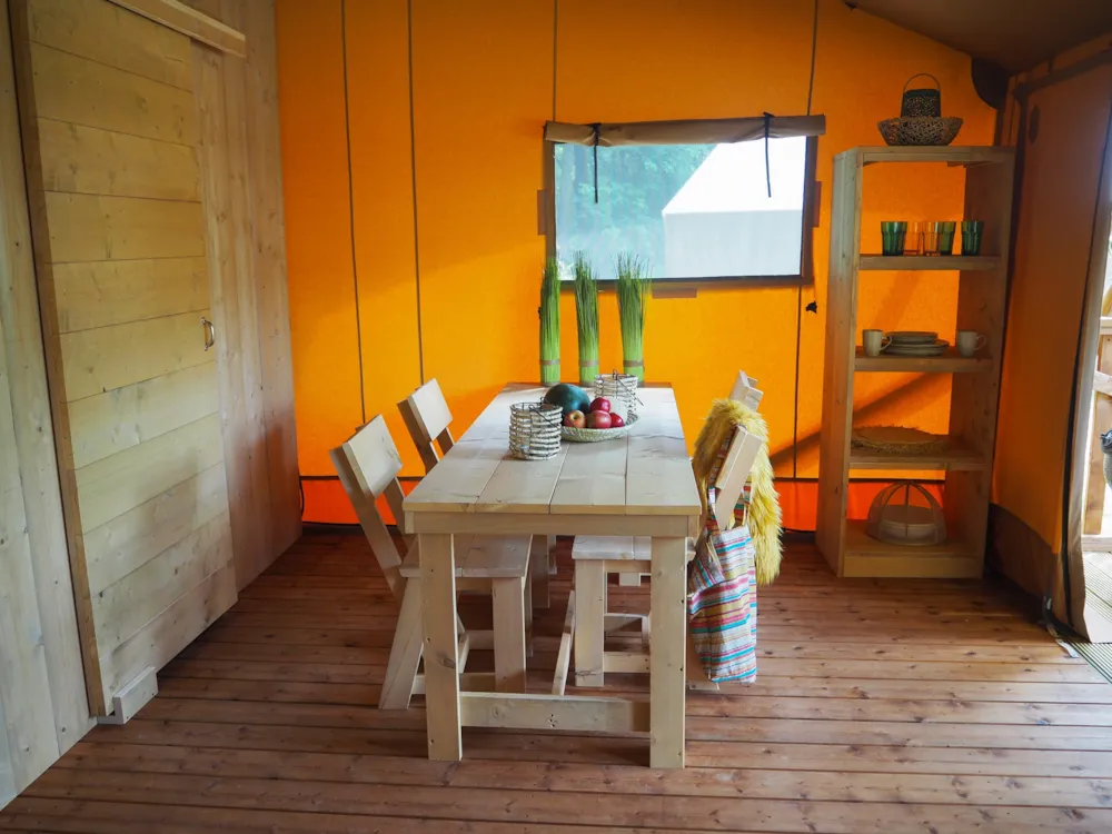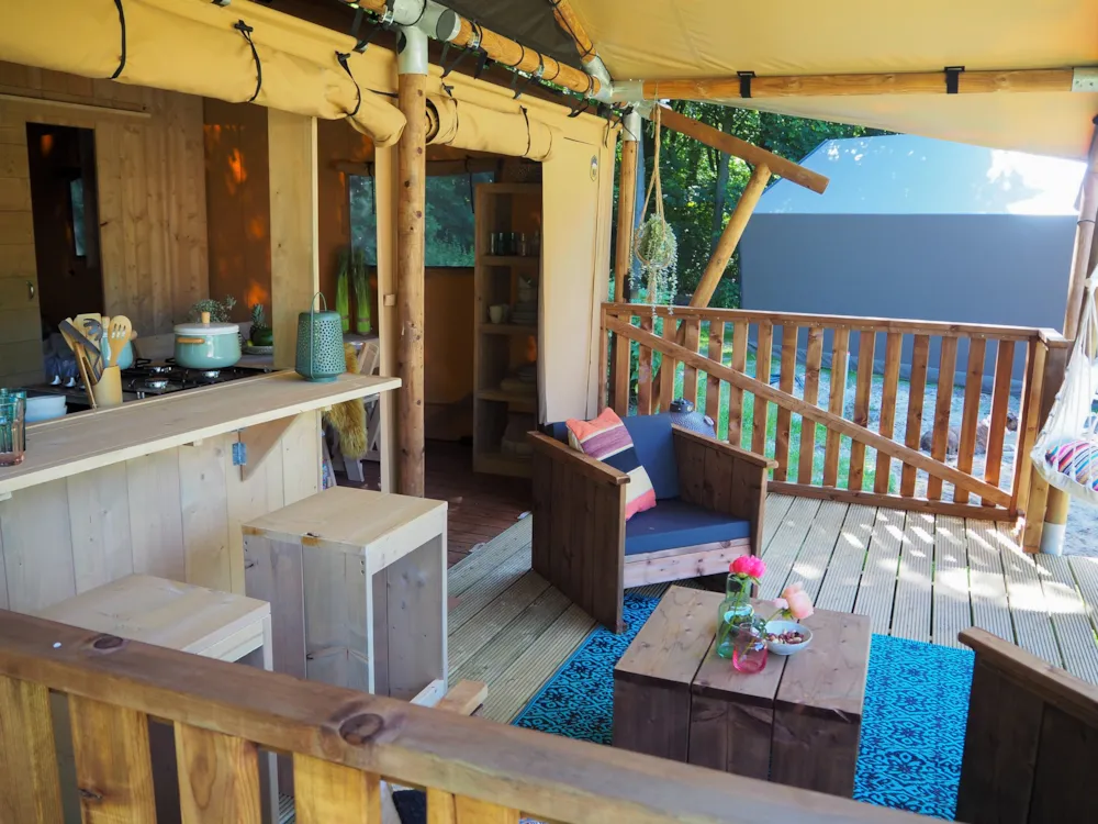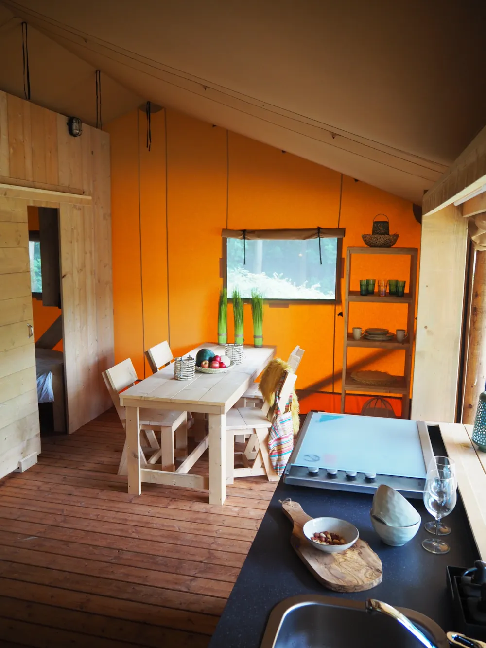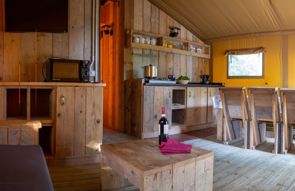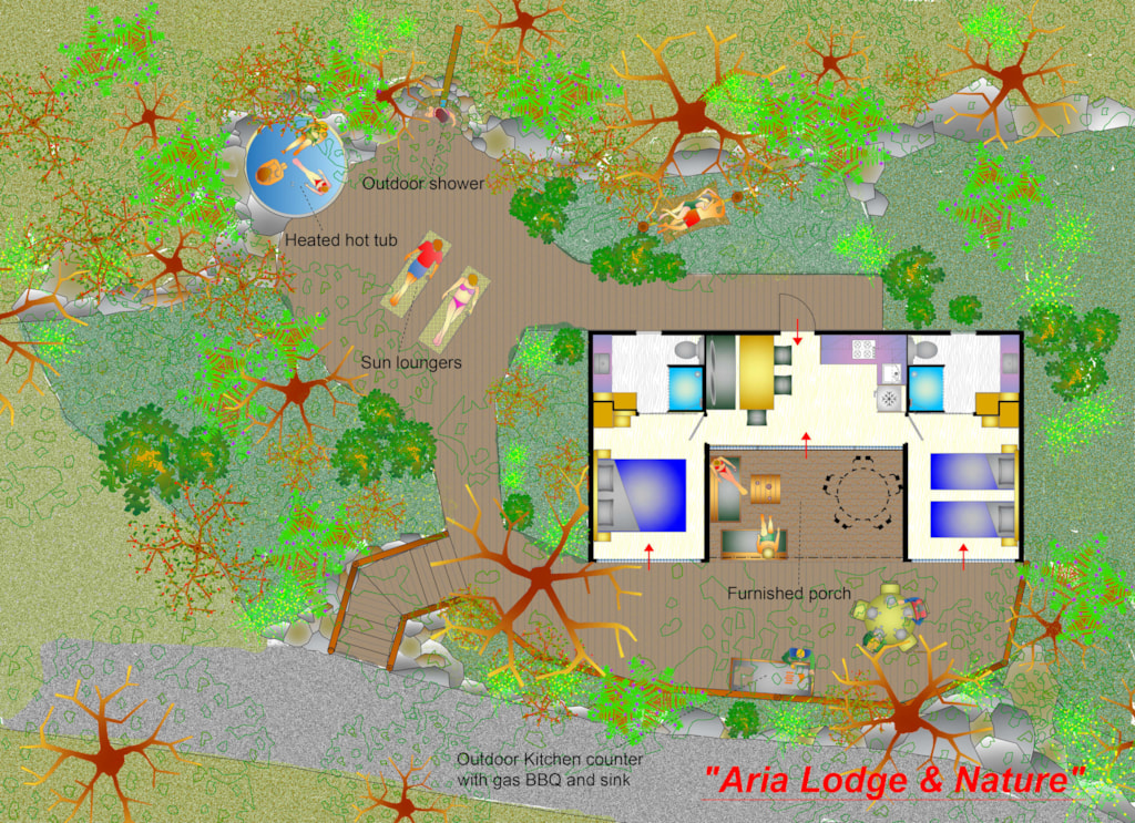 Just outside the living area glass wall you find a covered porch furnished with sofas, a table, and chairs. The porch spreads in a large wooden terrace featuring a counter with a gas BBQ and sink, perfect for preparing delicious meals in close contact with nature. The outdoor space continues with the relaxation areas: a heated whirlpool, shower, and solarium. The accomodation and the outside space are surrounded by vegetation, ensuring maximum privacy and calmness.