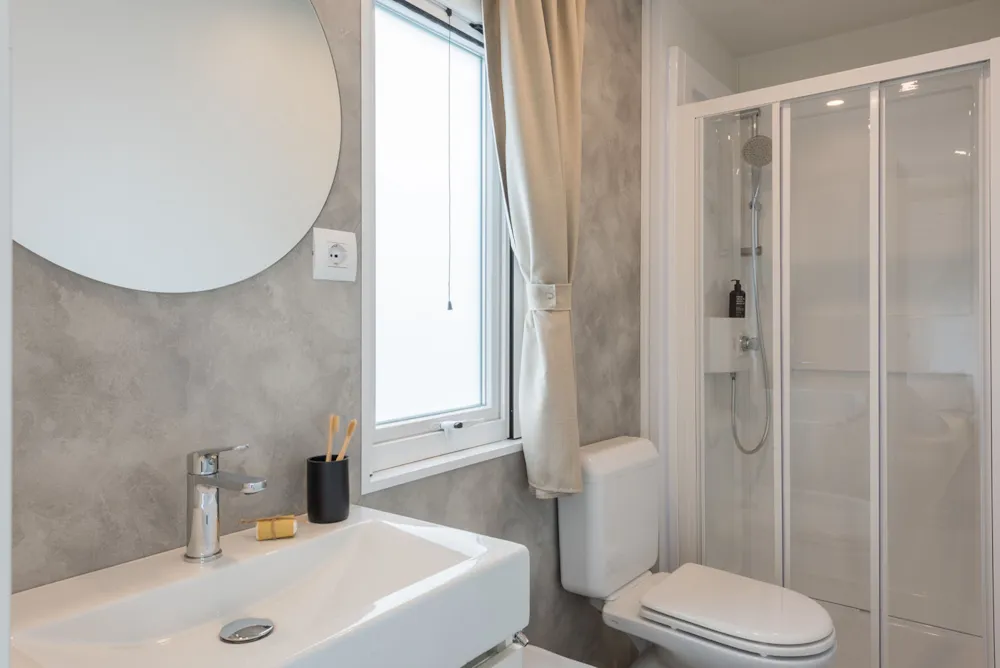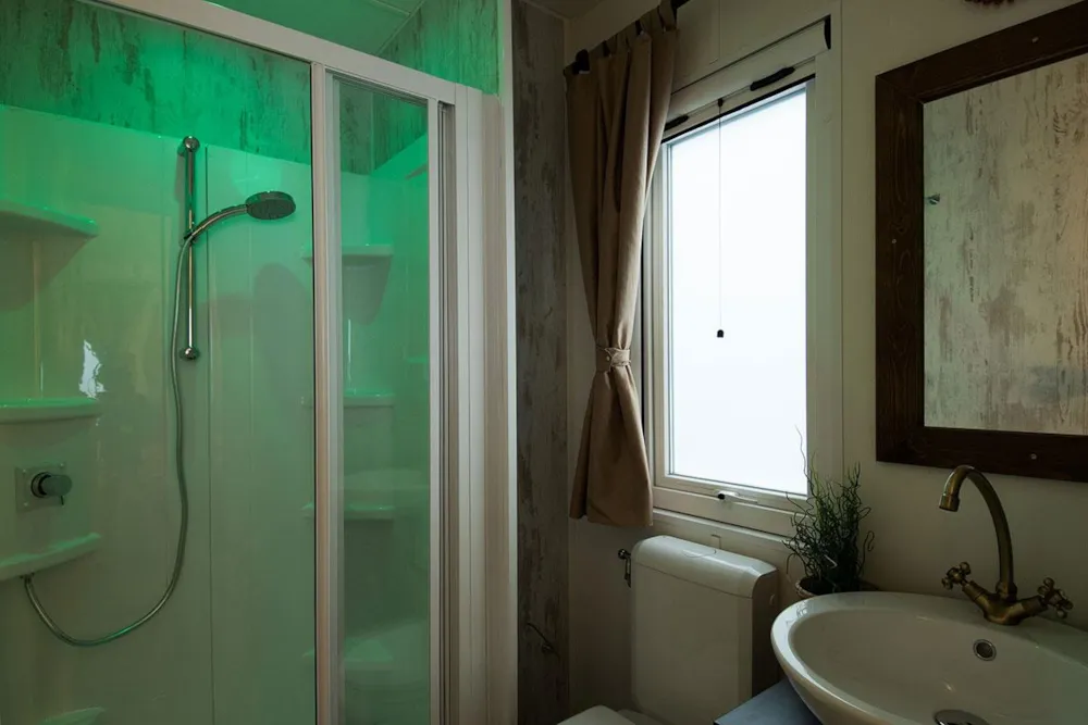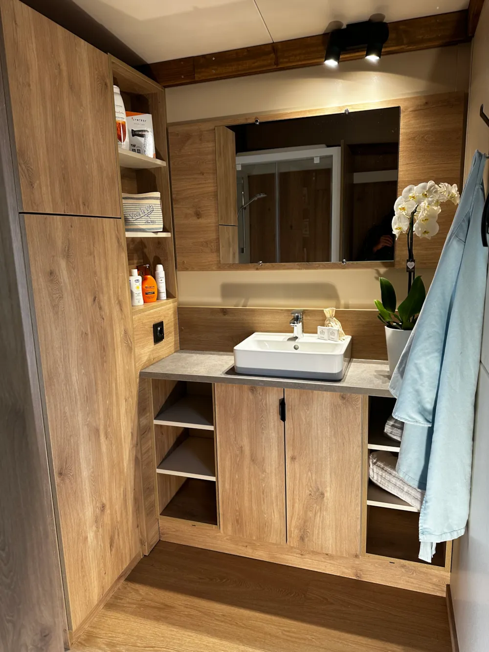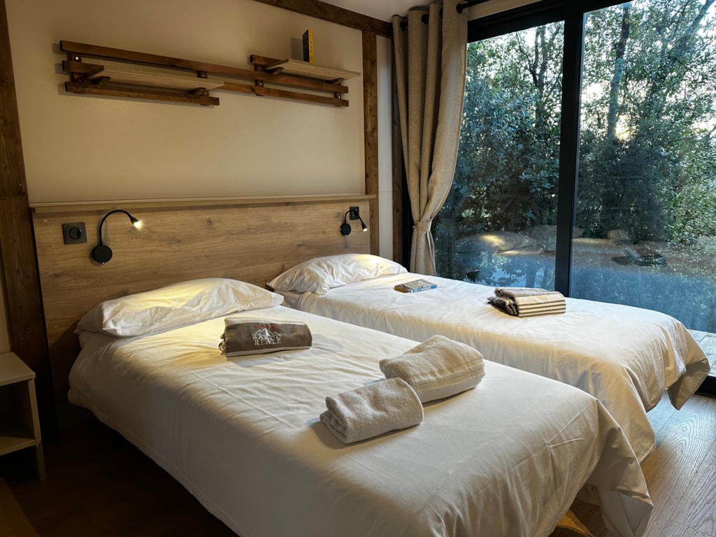 The layout of the two bedrooms makes the Aria Lodge & Nature mobile-home the ideal choice for either a family or two couples. The two bedrooms are located on the opposite sides of the accommodation. Each bedroom has a bathroom with a toilet, sink, and shower. One of the bedrooms can be set up with a double bed or two single beds, upon request. One of the bedroom walls, completely glazed, faces the terrace. Beyond the glass, only the forest, the sky, and the stars.