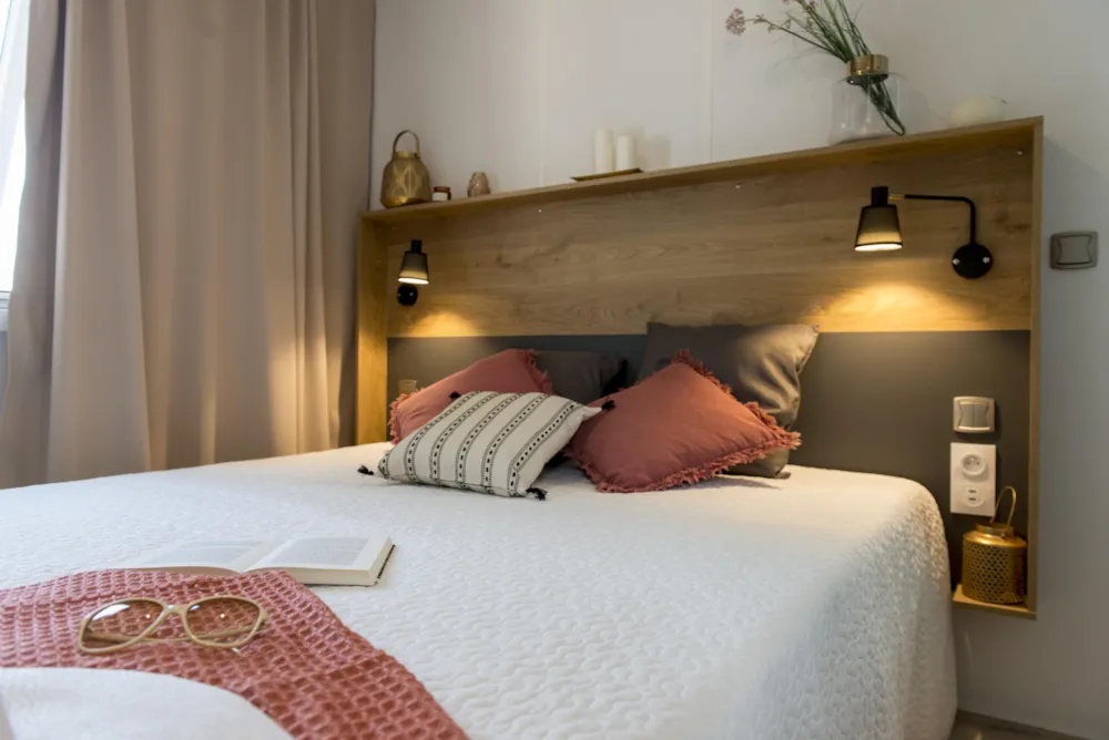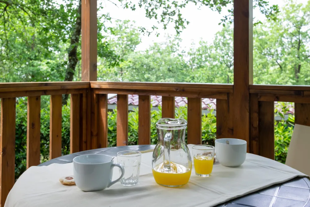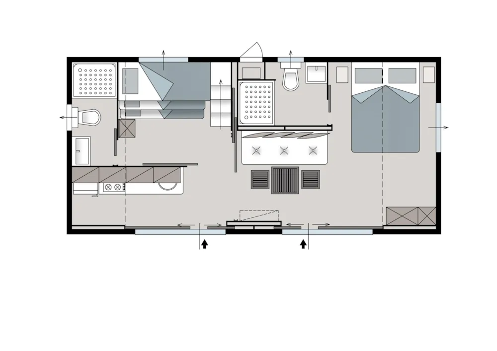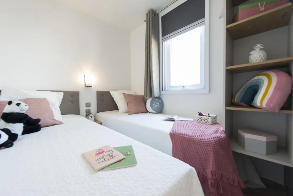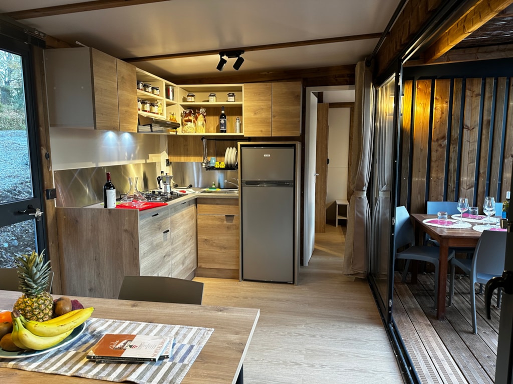 The layout of the two bedrooms makes the Aria Lodge & Nature mobile-home the ideal choice for either a family or two couples. The two bedrooms are located on the opposite sides of the accommodation. Each bedroom has a bathroom with a toilet, sink, and shower. One of the bedrooms can be set up with a double bed or two single beds, upon request. One of the bedroom walls, completely glazed, faces the terrace. Beyond the glass, only the forest, the sky, and the stars.