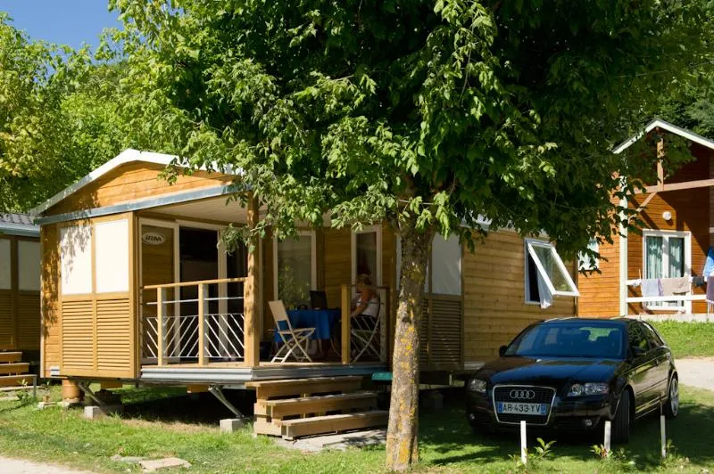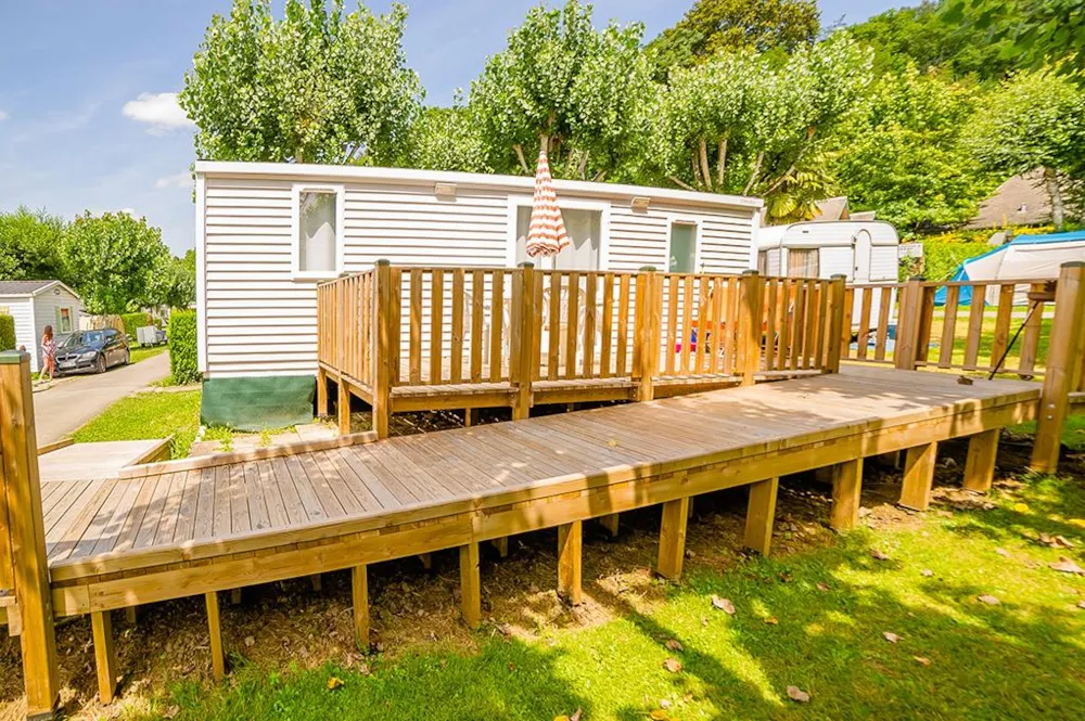 Il s'agit d'un mobil home équipé de 2 chambres, salle de bain, WC et une partie centrale avec cuisine équipée et séjour. Ils sont situés sur des parcelles ombragées, avec une terrasse en dalle et de l'herbe autour.