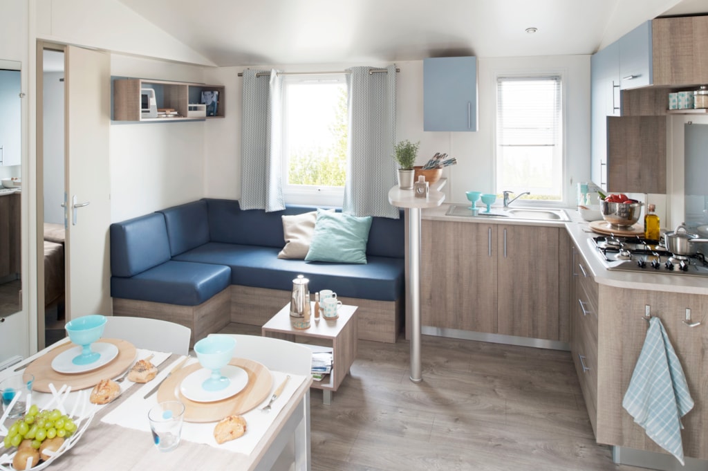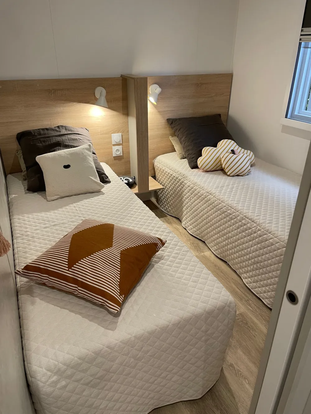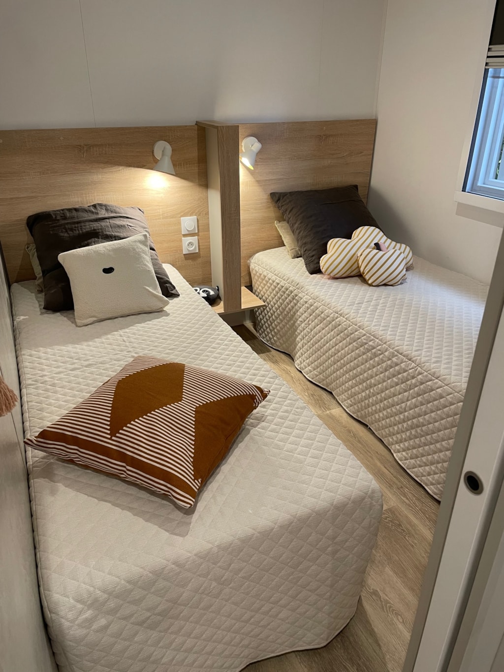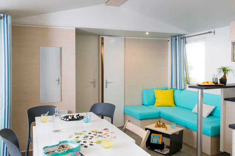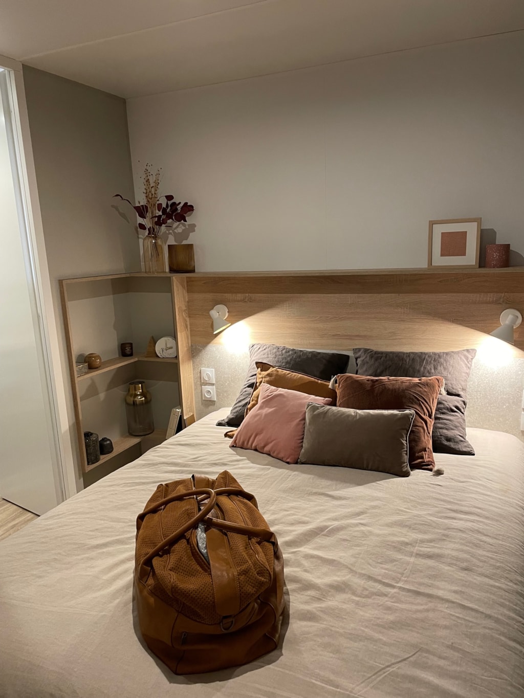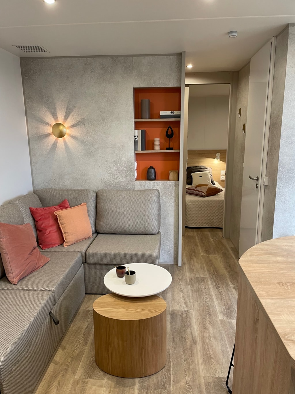 Proposé pour acceuillir les tribus, le premier mobil home d'une superficie de 40m² dispose de 3 chambres et 2 salles de bains, d'un vestiaire à l'entrée, un grand canapé et une belle chambre parentale.